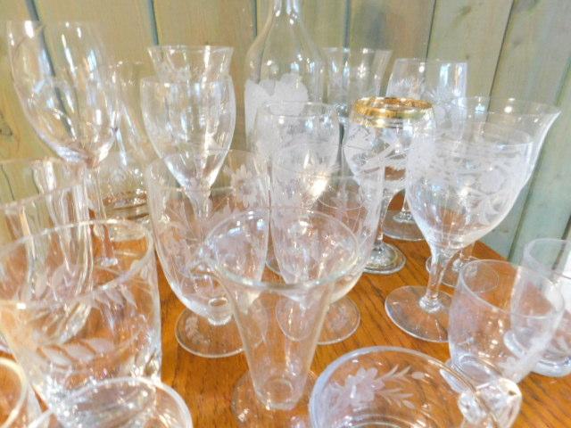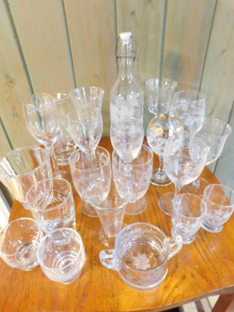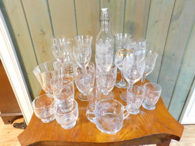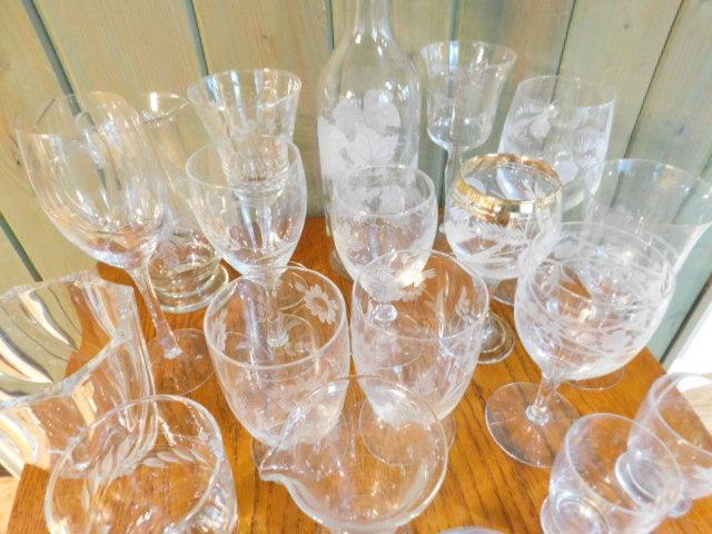 Collection Two Etched Crystal and Glass Wine and Other Glasses Various Patterns and Sizes