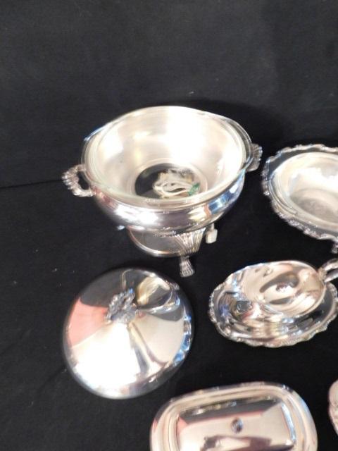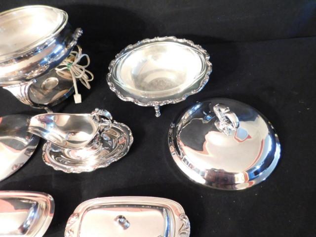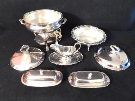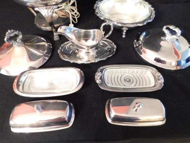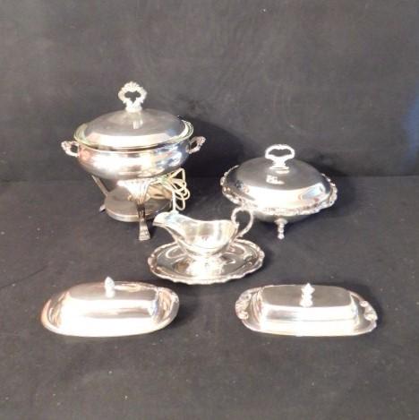 Collection Two of Silver Plate Butter Dishes, Gravy Boat and Chafing Dish Set
