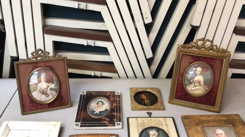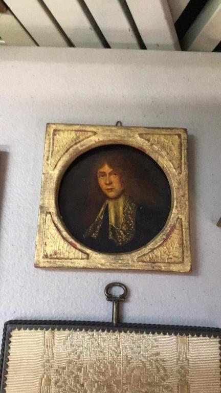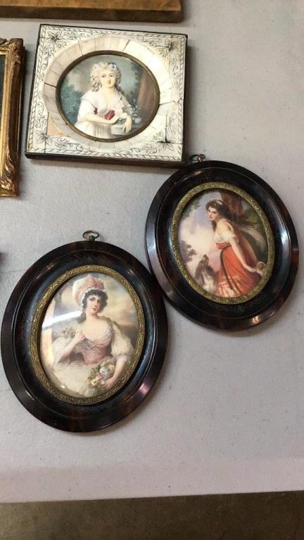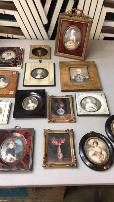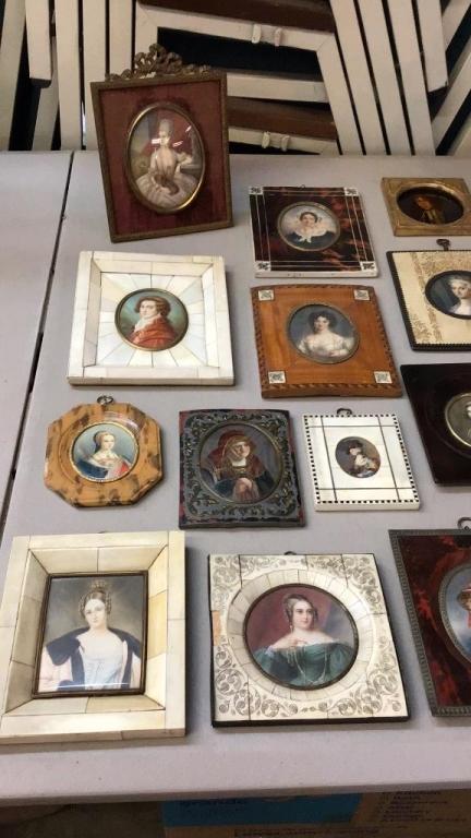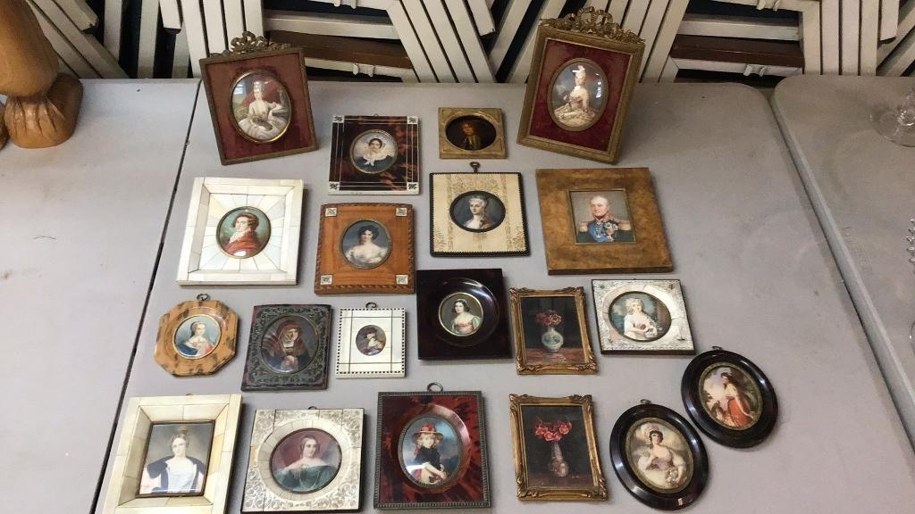 26 framed portraits in varying sizes..Bakelite, wooden, shell, or metal frames..mostly on paper, portrait of man with frilled collar on copper..loss to some frames, 2 portaits have detached glass and
