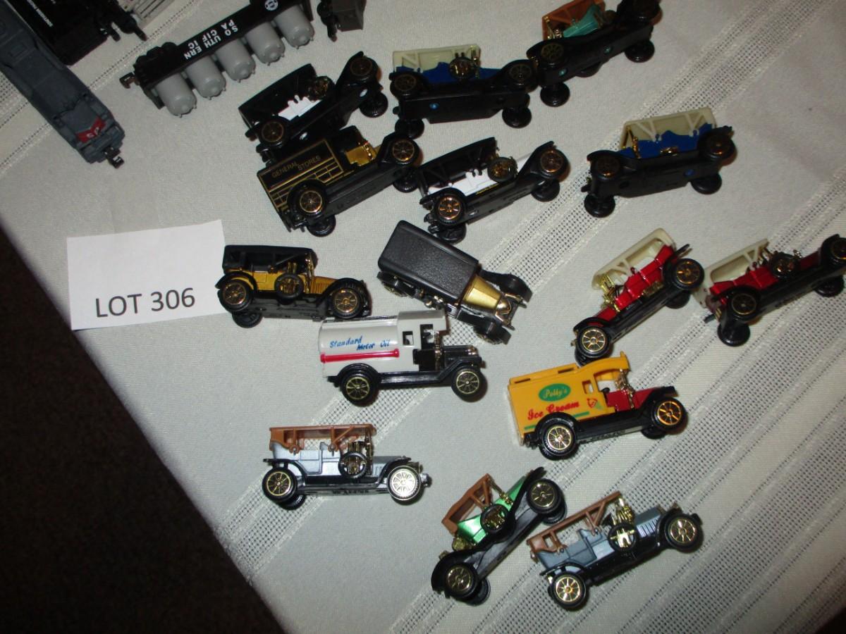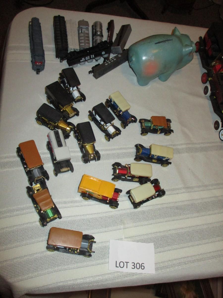 Miniature plastic cars & piggy bank, plastic trains