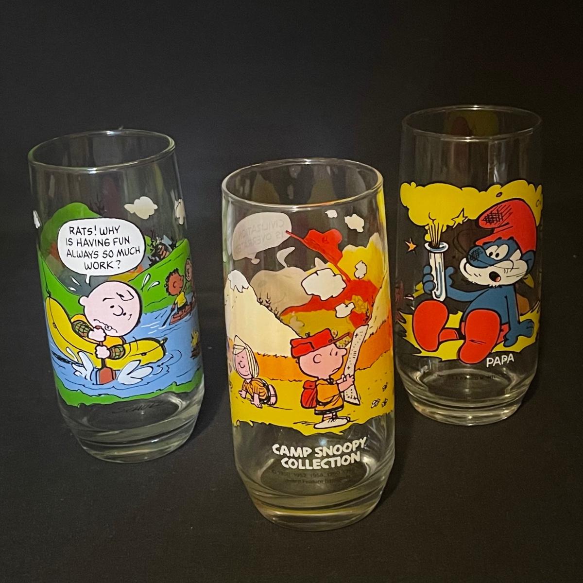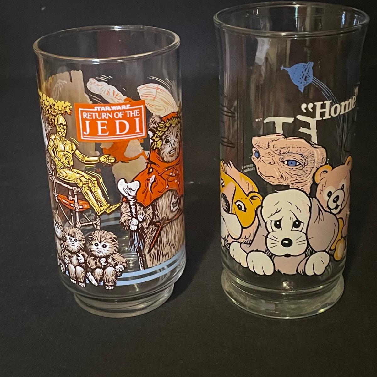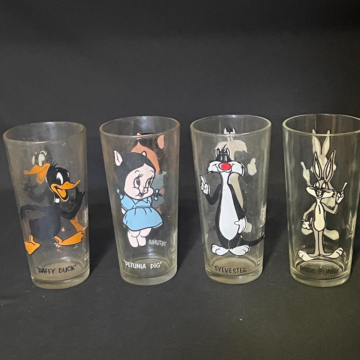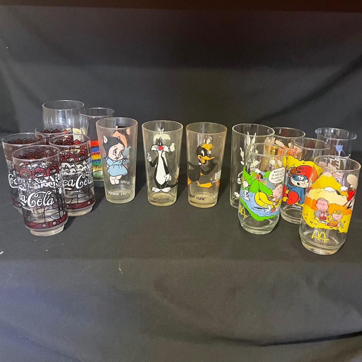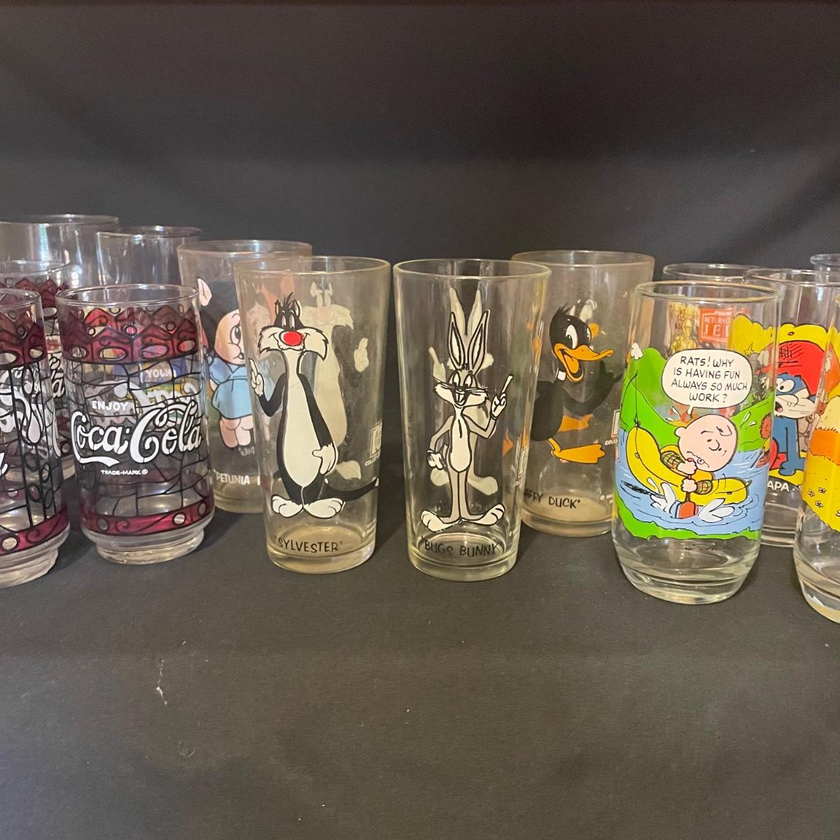 A wonderful nostalgic collection of 15 collectible glasses. A set of 4 Warner Bros. Glasses includes Daffy, Bugs, Sylvester & Petunia Pig. E.T, Coca Cola, Peanuts and more. All but one (Coca Cola pint glass) are tumbler style approximately the same size; Bugs Bunny glass measures 3” d x 6.5” tall.