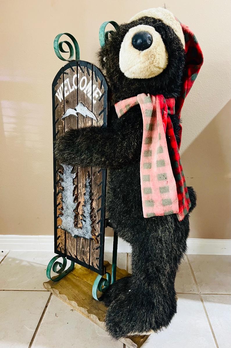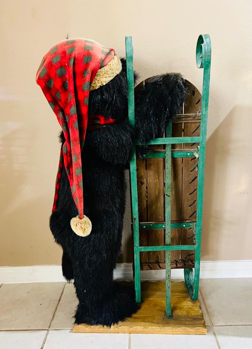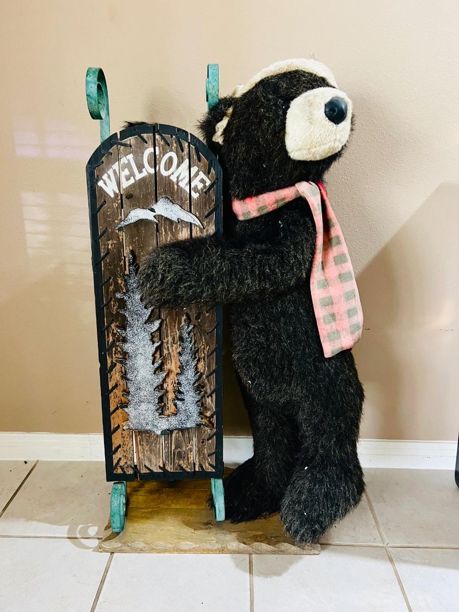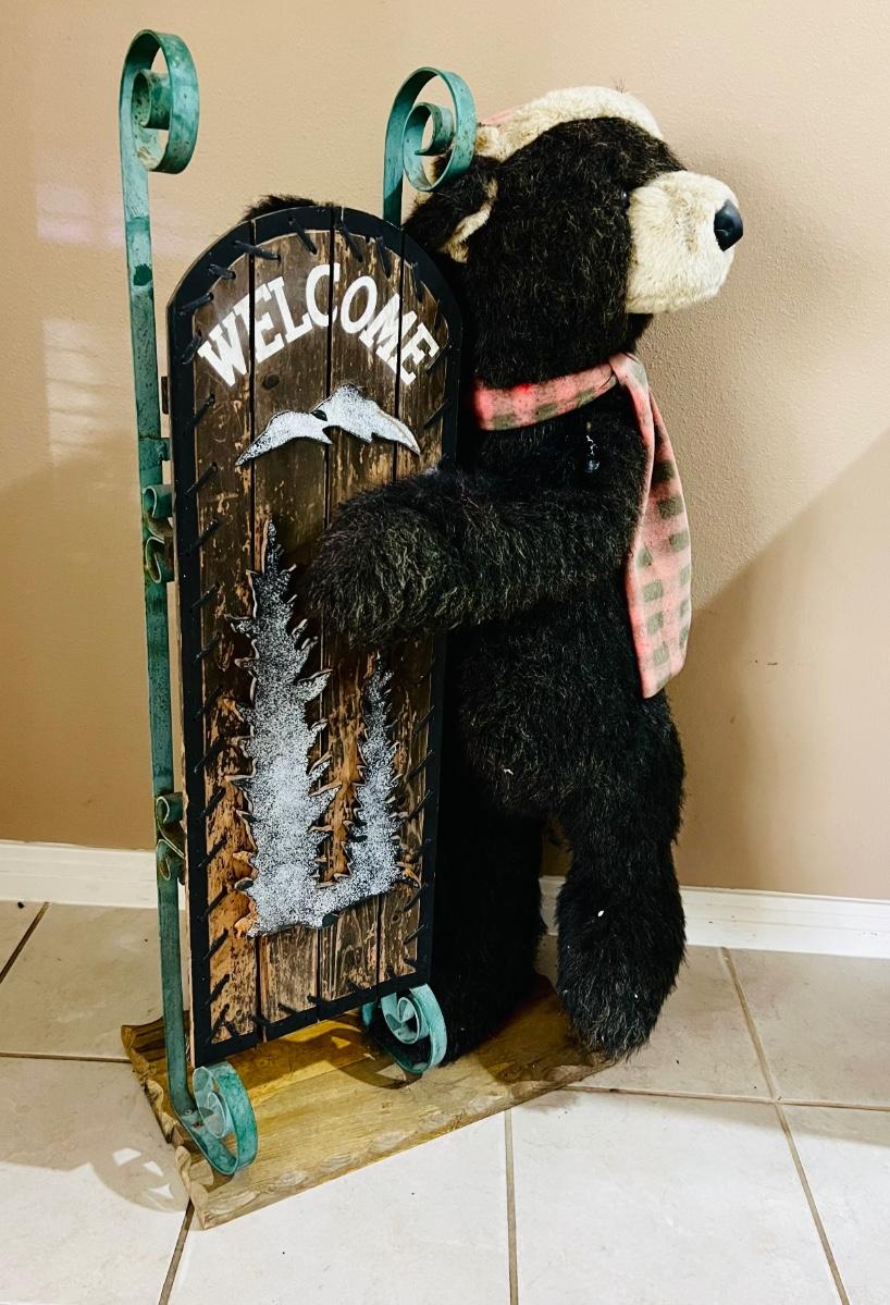 Large decorative bear with metal sleigh on wood base . This is so cute! The bear does have fading on the hat and scarf from the sun. Also, some tacking will need to be done on the arm pit area, see picture. This is well made and stands sturdy. Measures 40 inches tall, approximately 22 inches wide and approximately 10 inches deep.