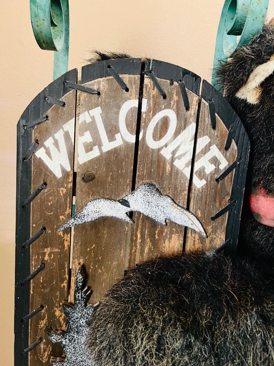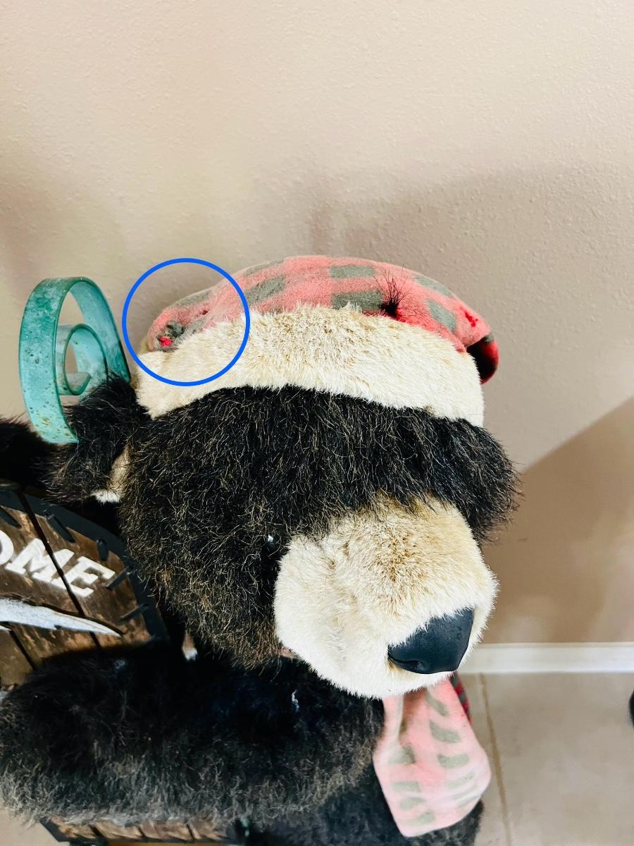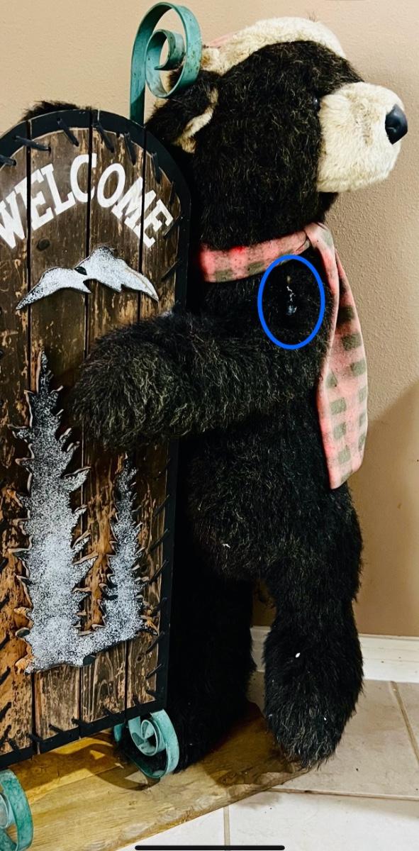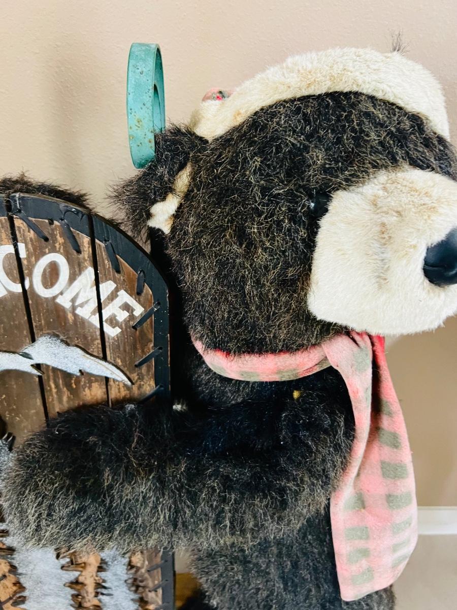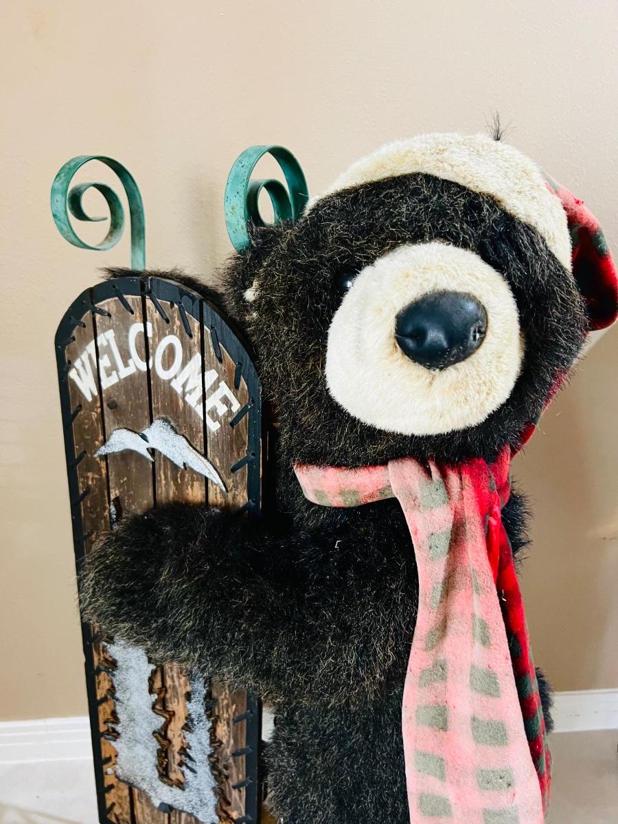 Large decorative bear with metal sleigh on wood base . This is so cute! The bear does have fading on the hat and scarf from the sun. Also, some tacking will need to be done on the arm pit area, see picture. This is well made and stands sturdy. Measures 40 inches tall, approximately 22 inches wide and approximately 10 inches deep.
