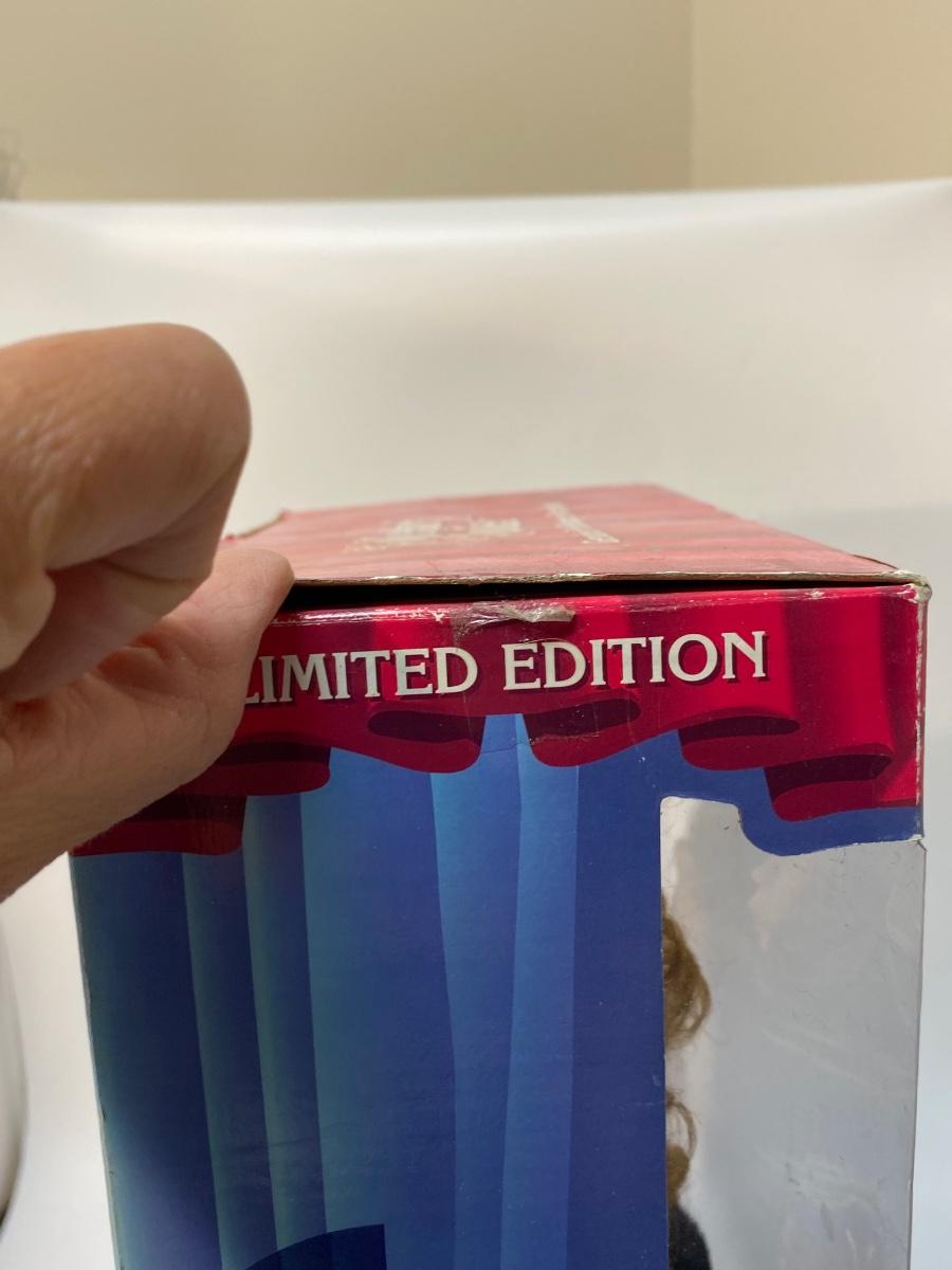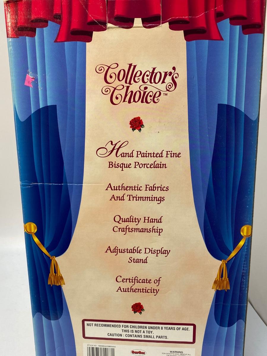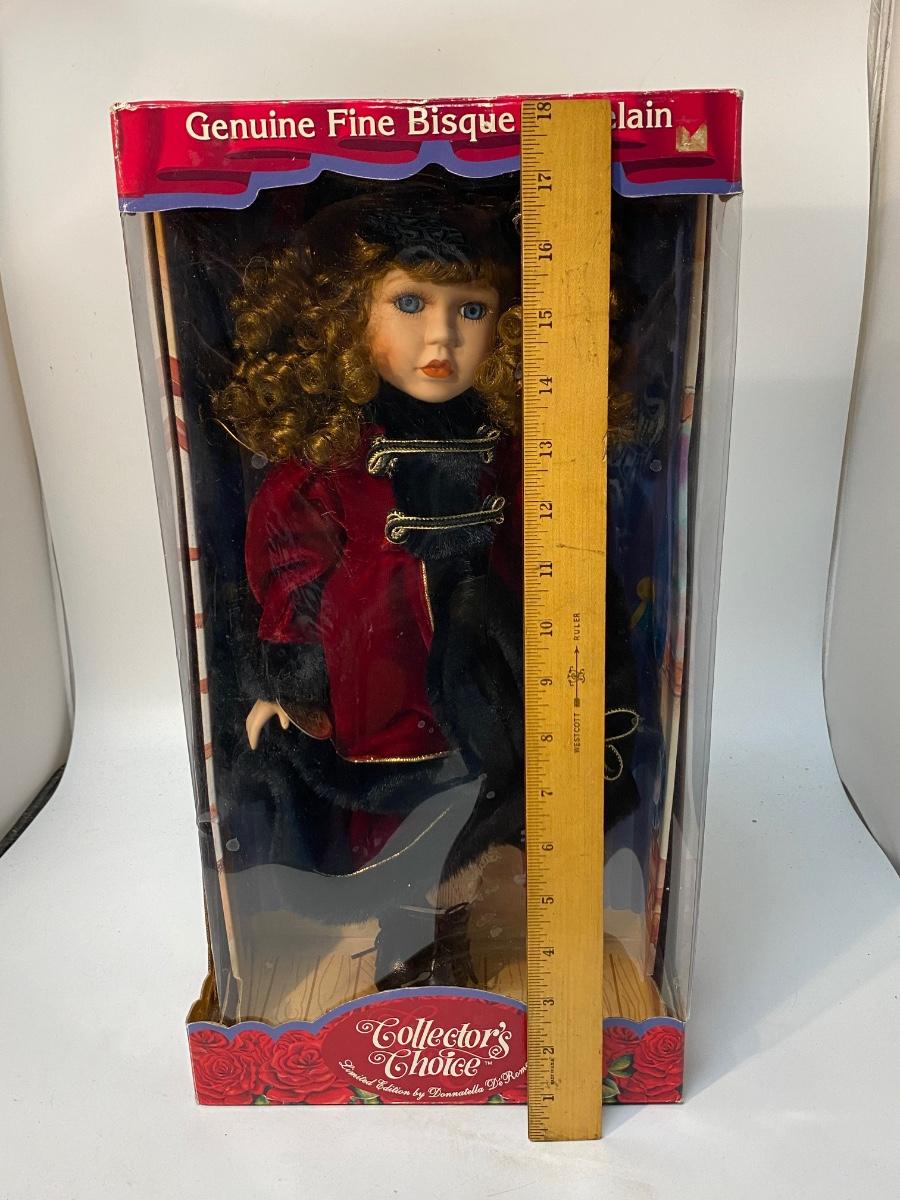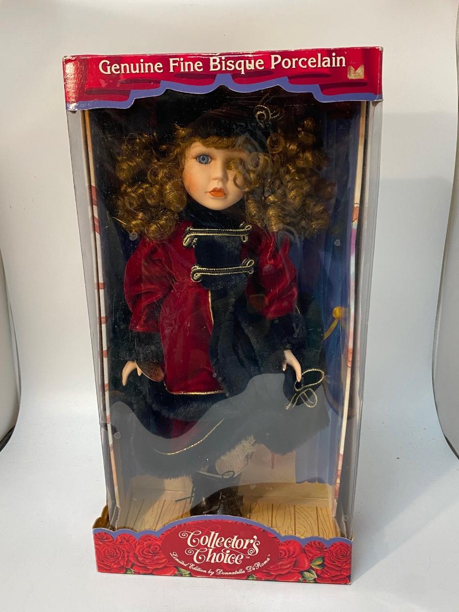 Collector's Choice Limited Edition Porcelain Doll by Donnatella DeRoma. In original box, looks to have never been removed. Includes stand. Box may have signs of age, dust, wear. About 16" doll.