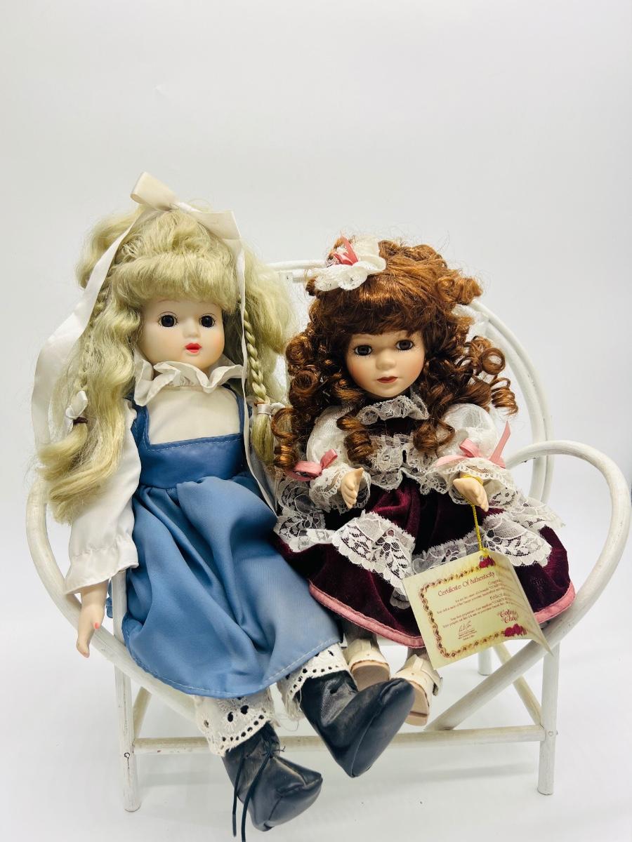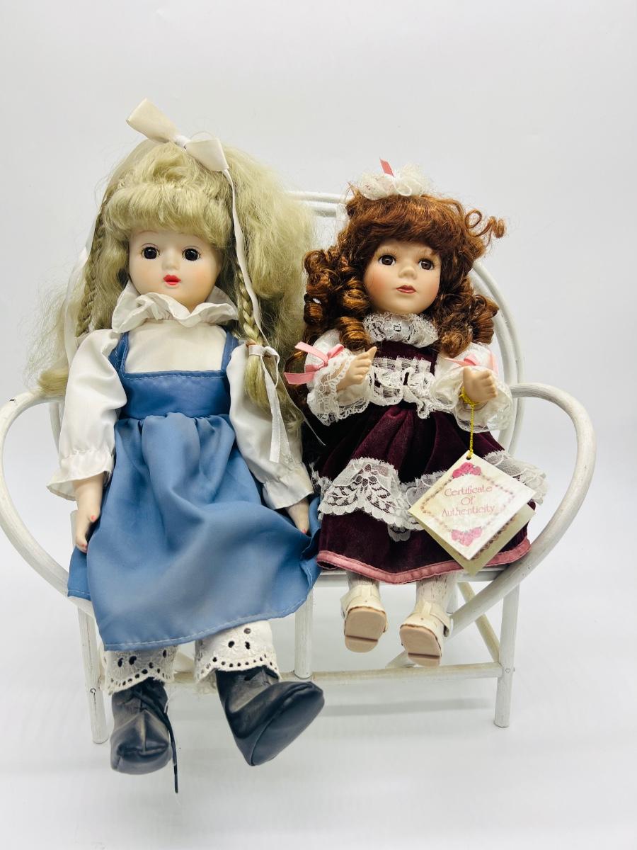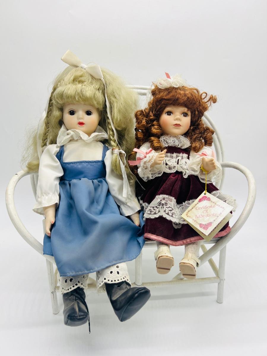 Collectors choice porcelain doll is musical wearing a maroon and white dress. Other porcelain doll with blonde hair wearing a blue dress. Wooden bench measures 13 1/2 inches tall and 15 inches wide.