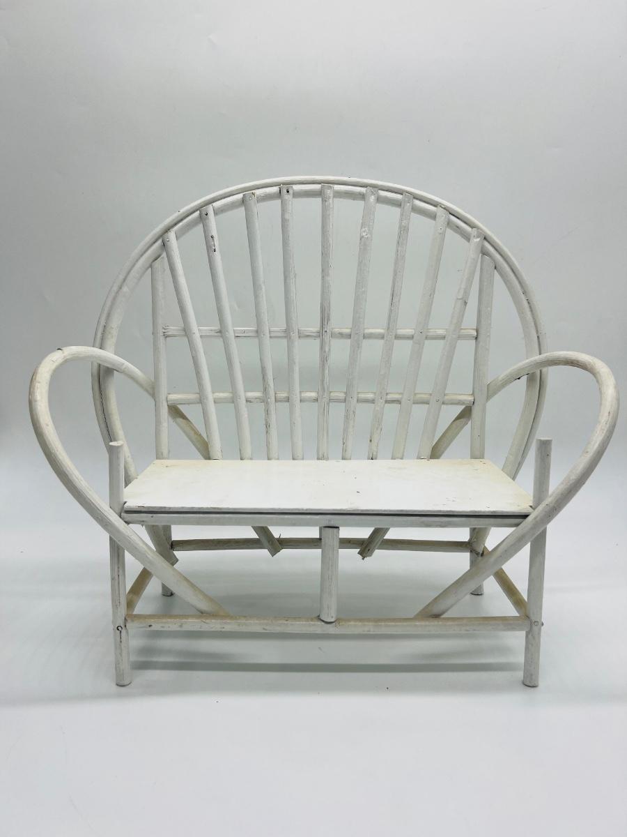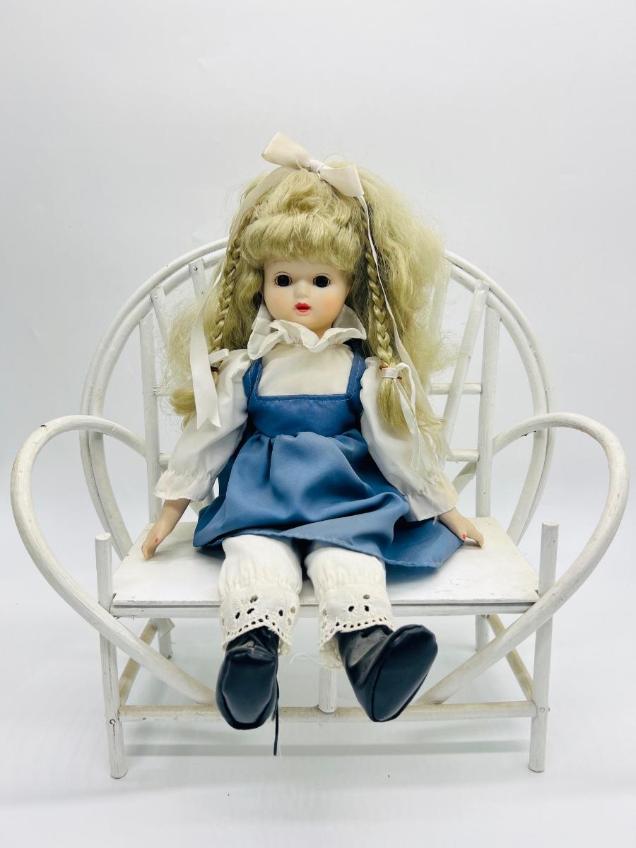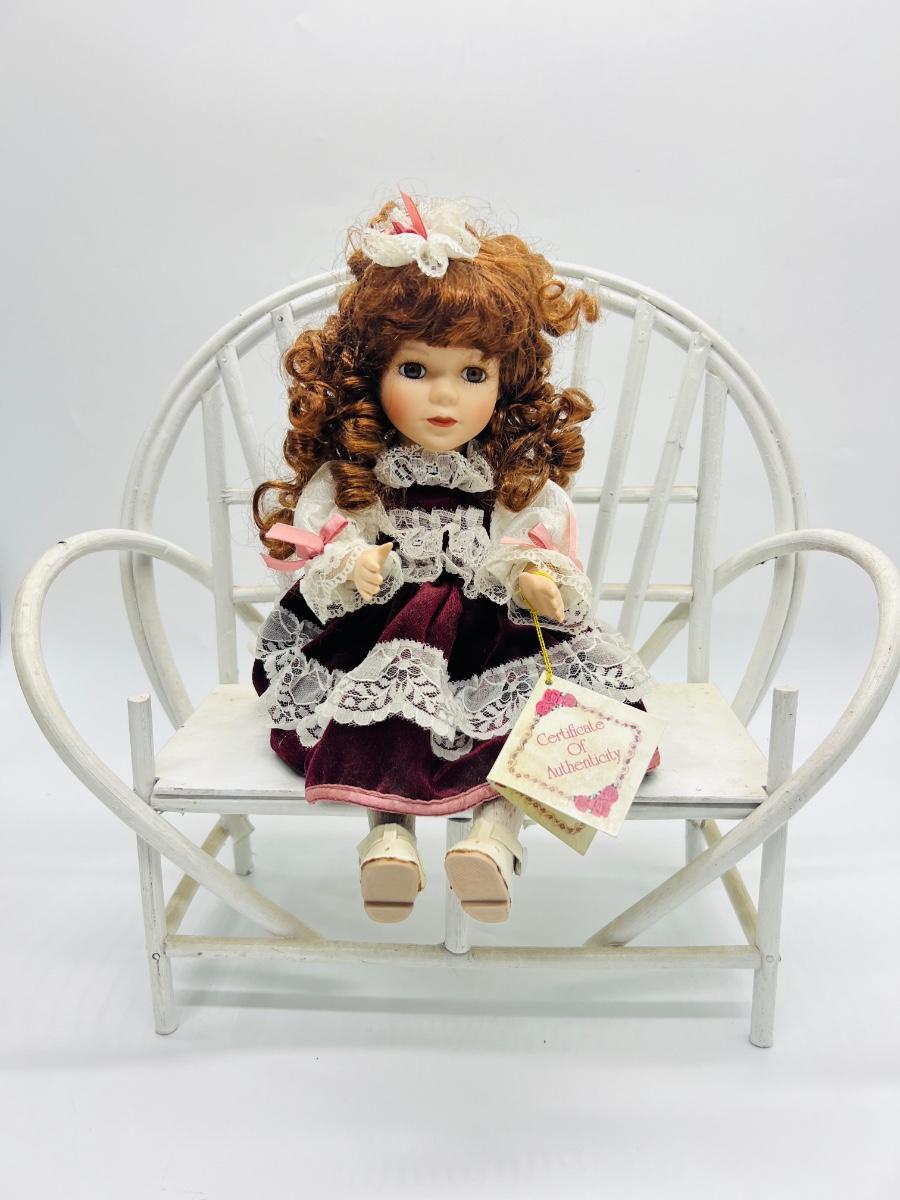 Collectors choice porcelain doll is musical wearing a maroon and white dress. Other porcelain doll with blonde hair wearing a blue dress. Wooden bench measures 13 1/2 inches tall and 15 inches wide.