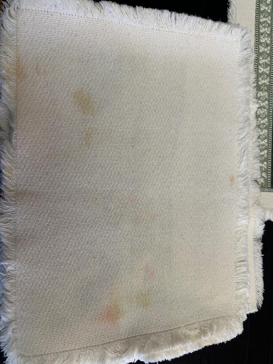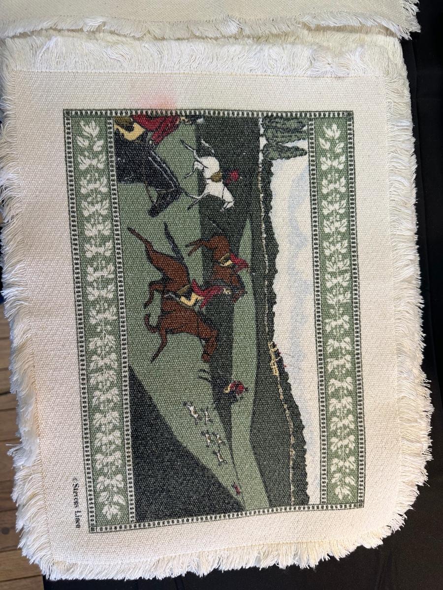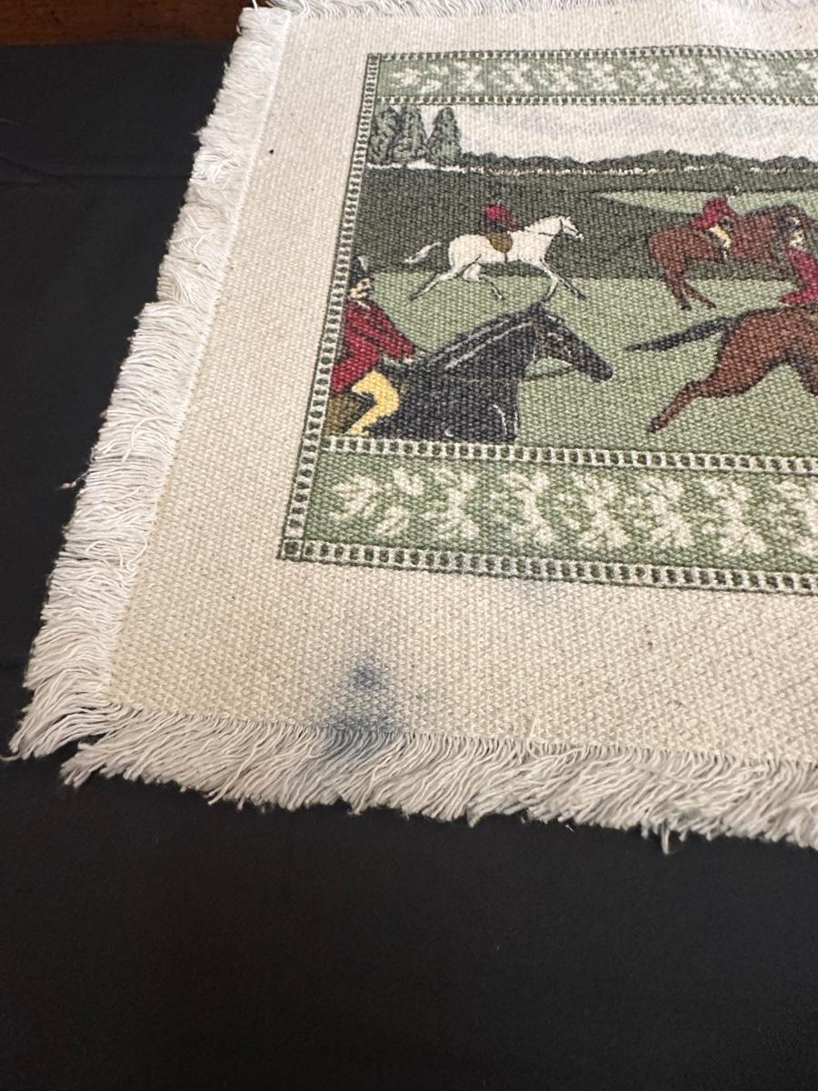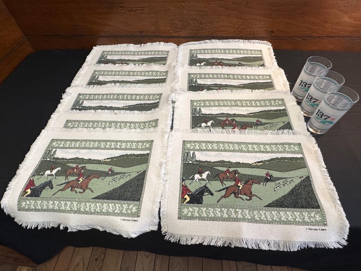 The glasses are dated 5.7.11 and are an officially licensed product of Churchill Downs. Placemats and napkins have a horse and dog theme — some do have subtle stains but overall I’m very good condition! 10 Placemats, 8 napkins
