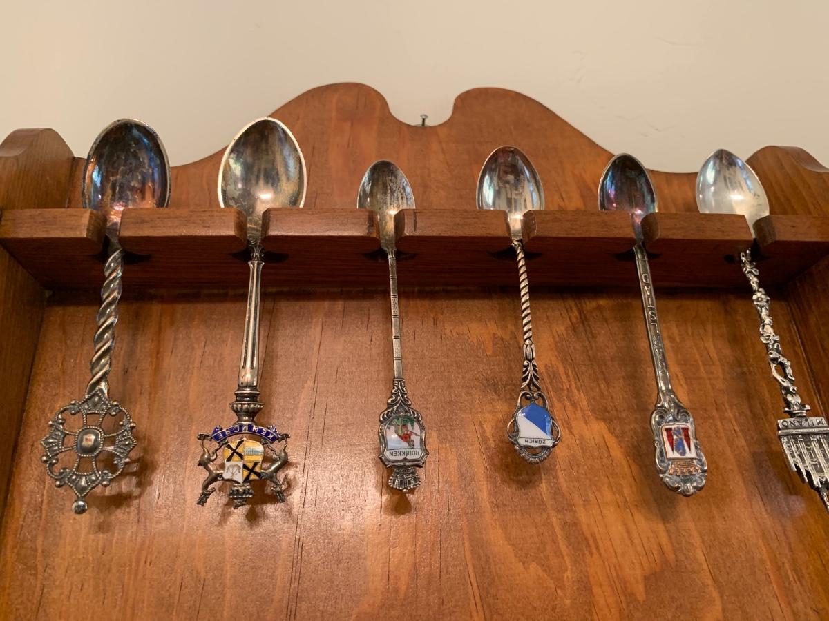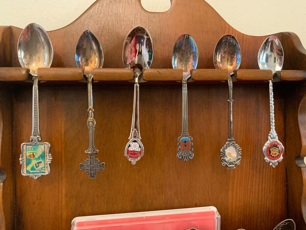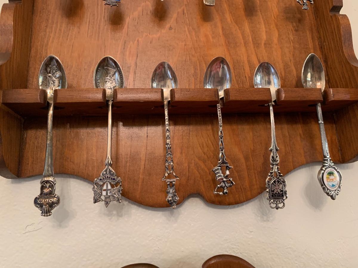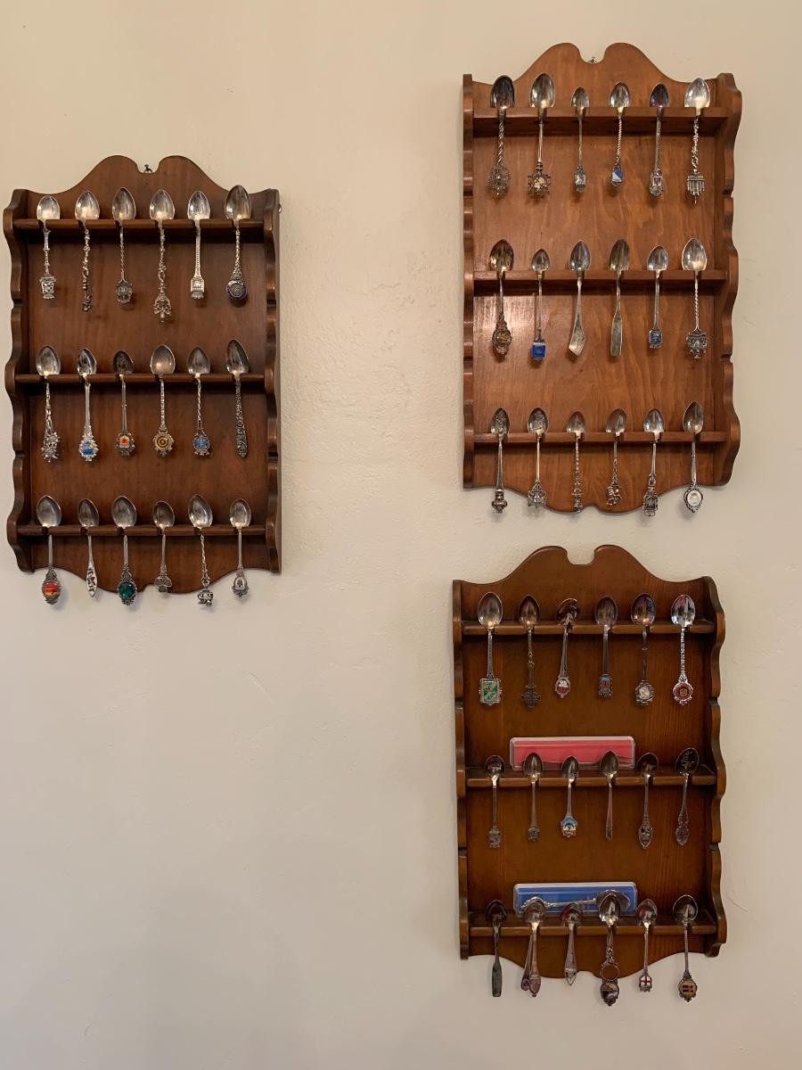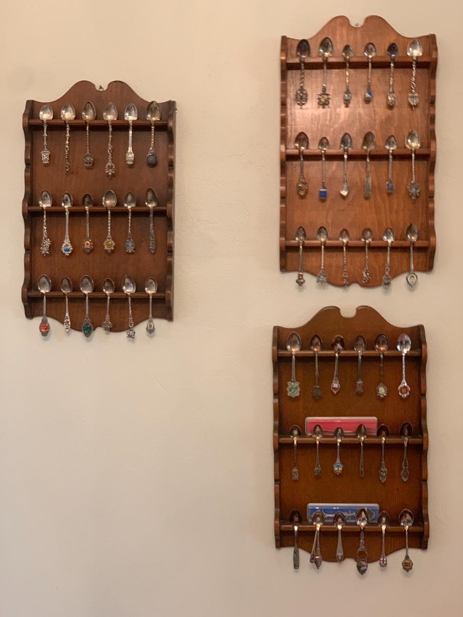Set of 3 vintage wood spoon displays filled with souvenir spoons from around the globe.