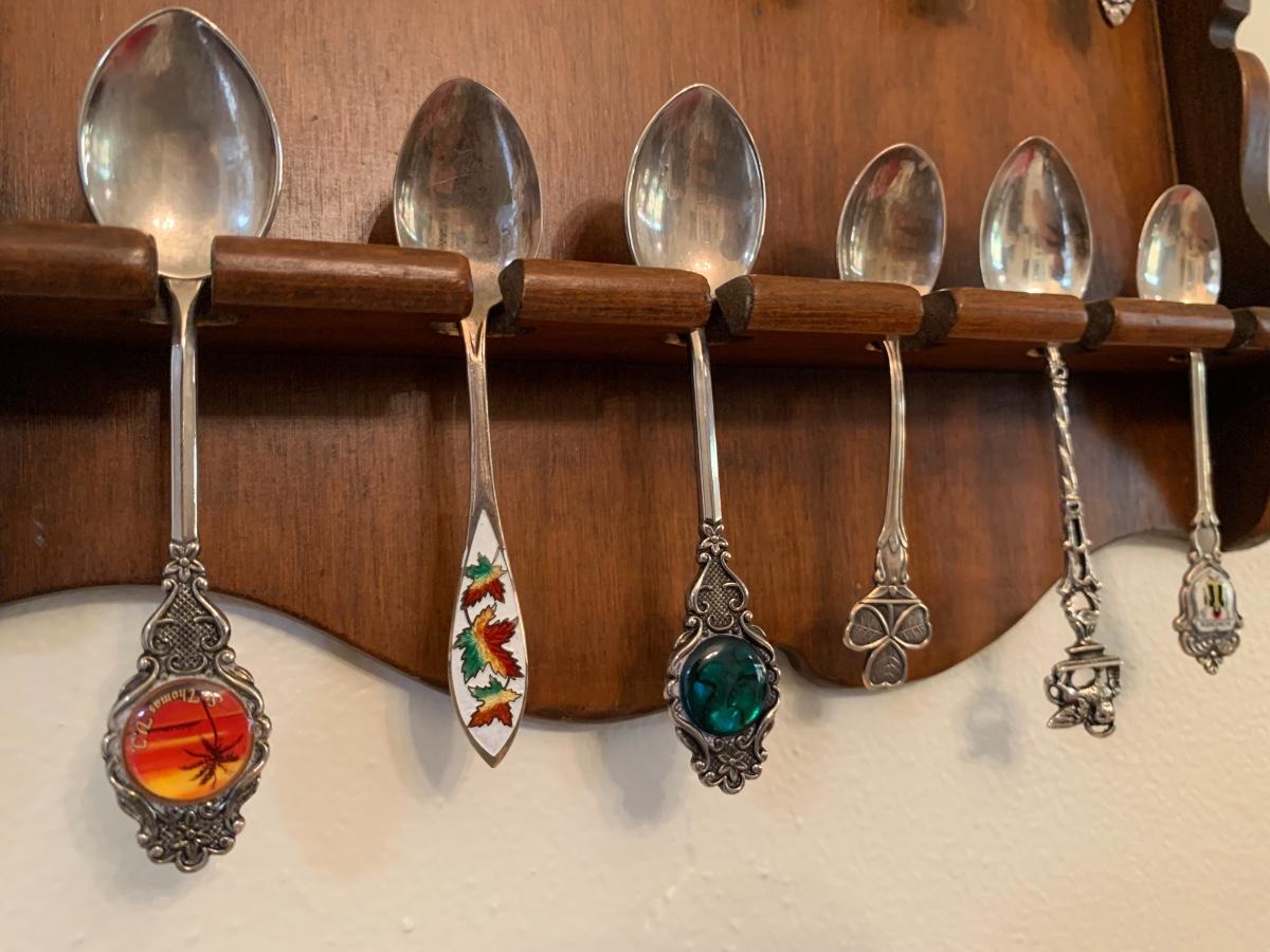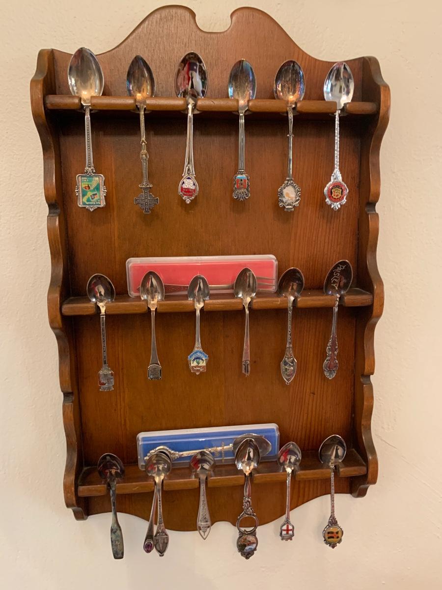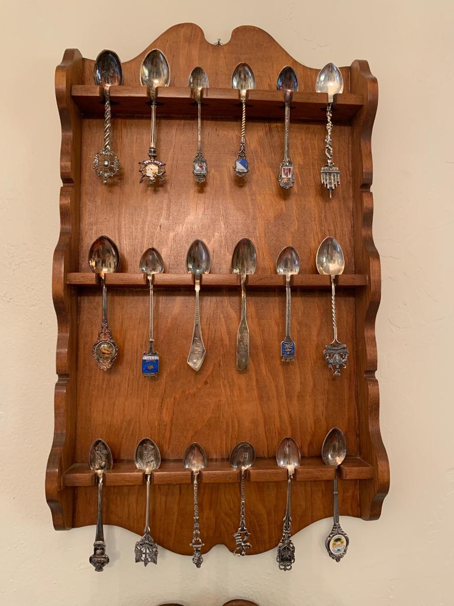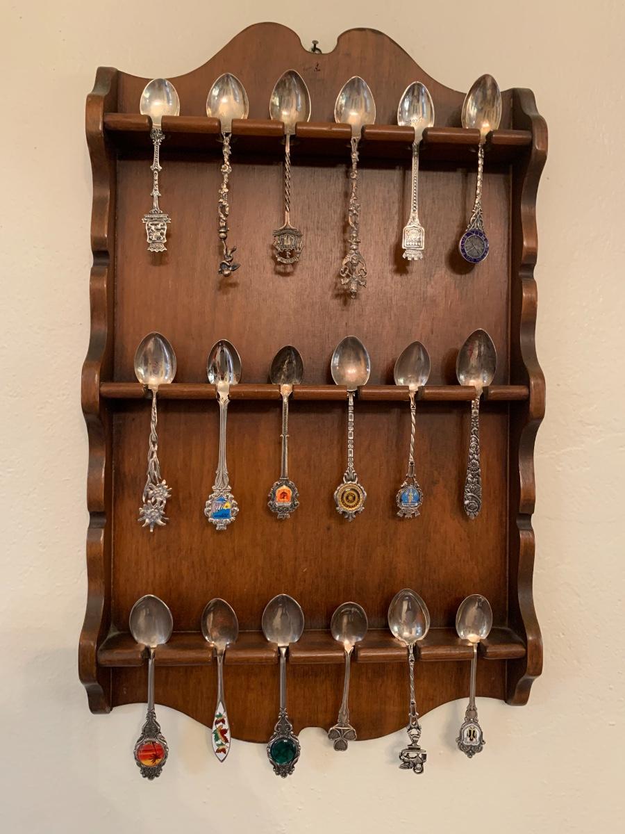 Set of 3 vintage wood spoon displays filled with souvenir spoons from around the globe.