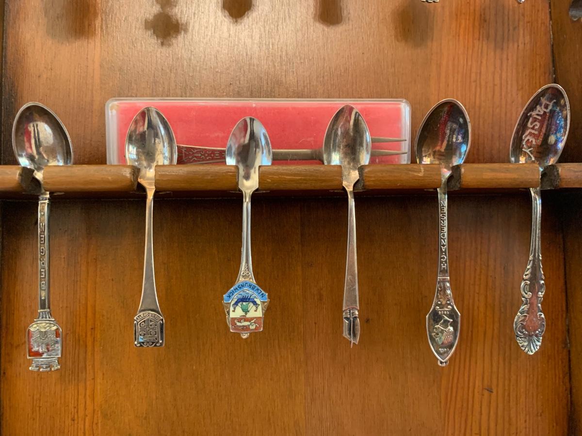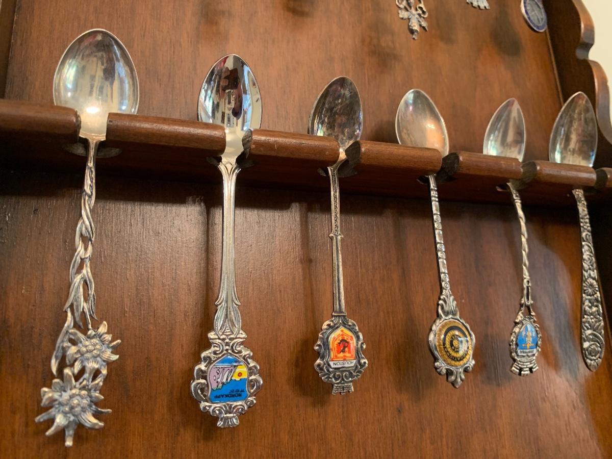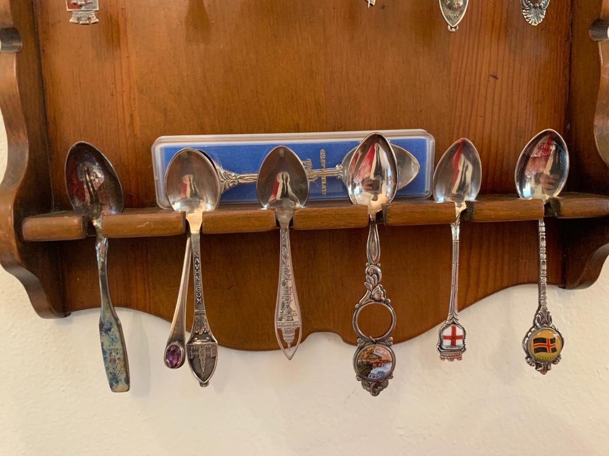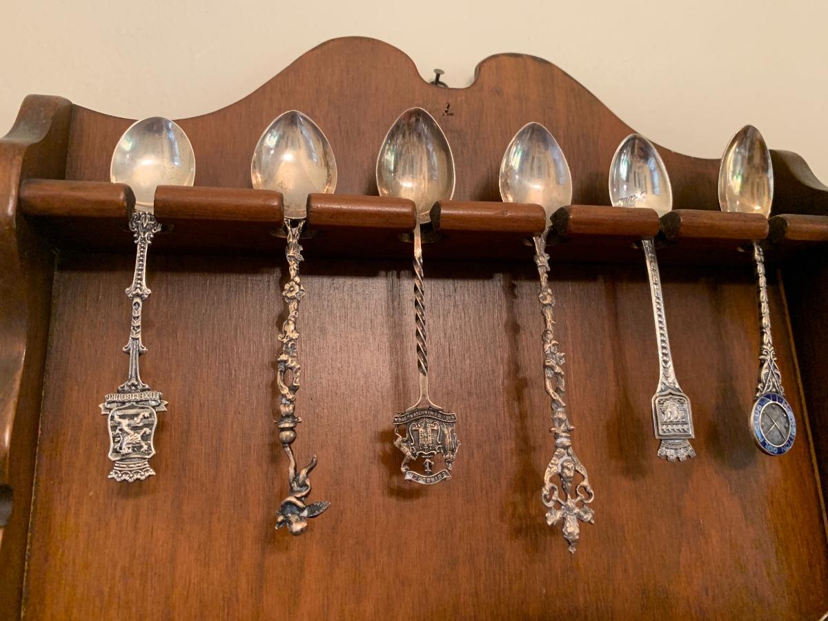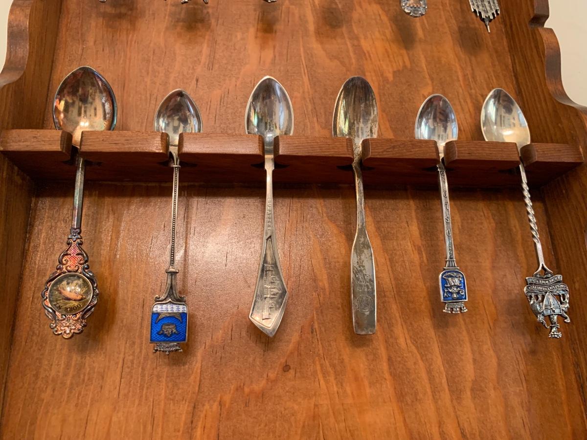 Set of 3 vintage wood spoon displays filled with souvenir spoons from around the globe.