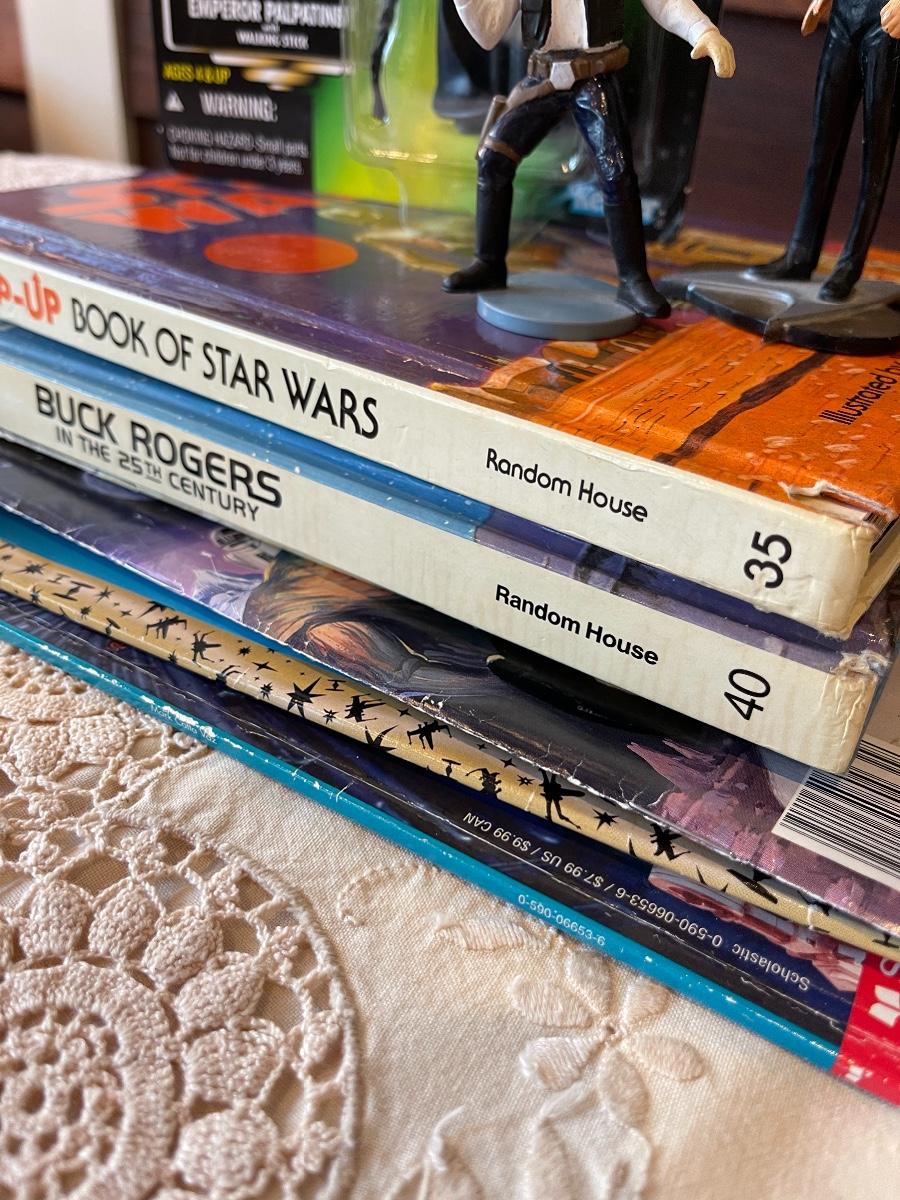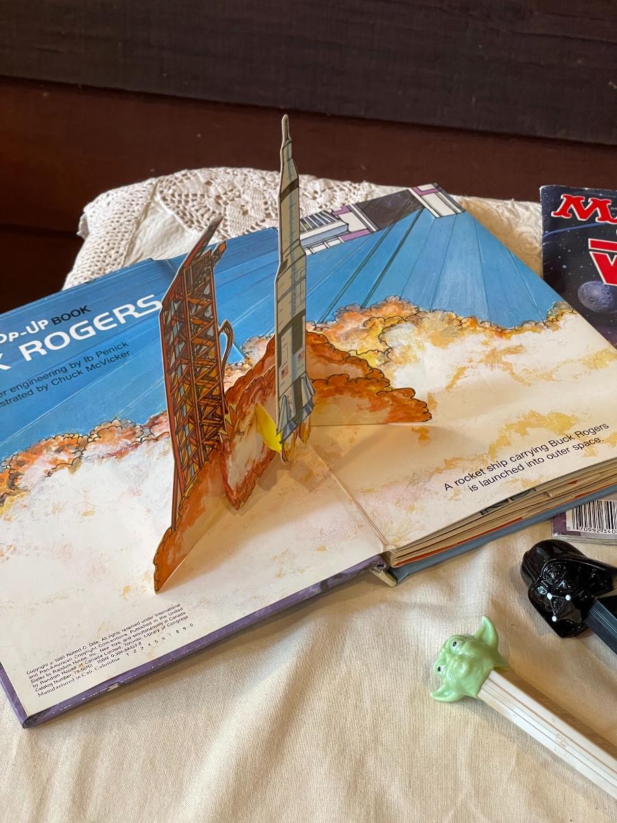 An impressive bundle of items for the “space” collector! 2 Pop-up Books (fair condition), action figures, PEZ dispensers, Magazines. See photos for more details.