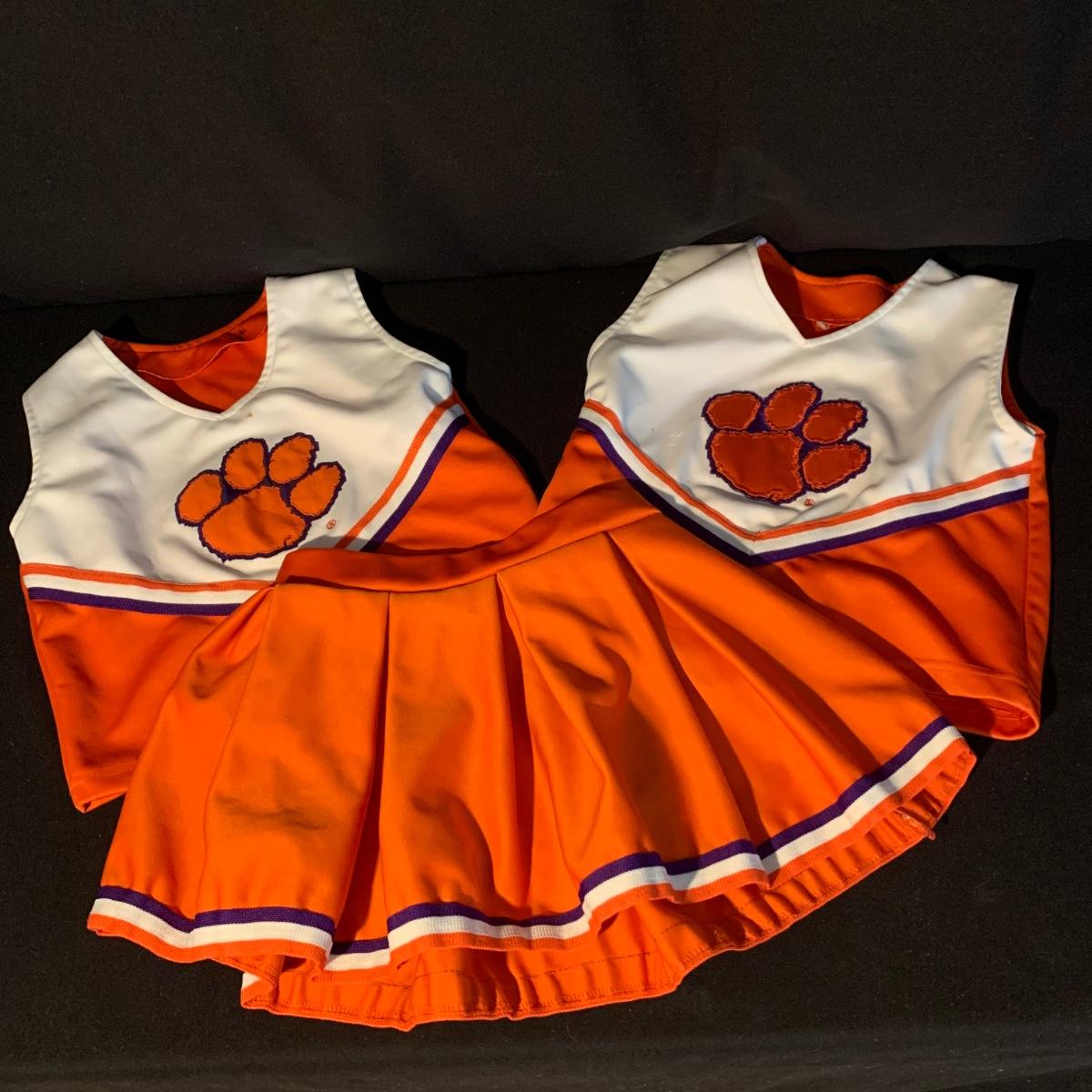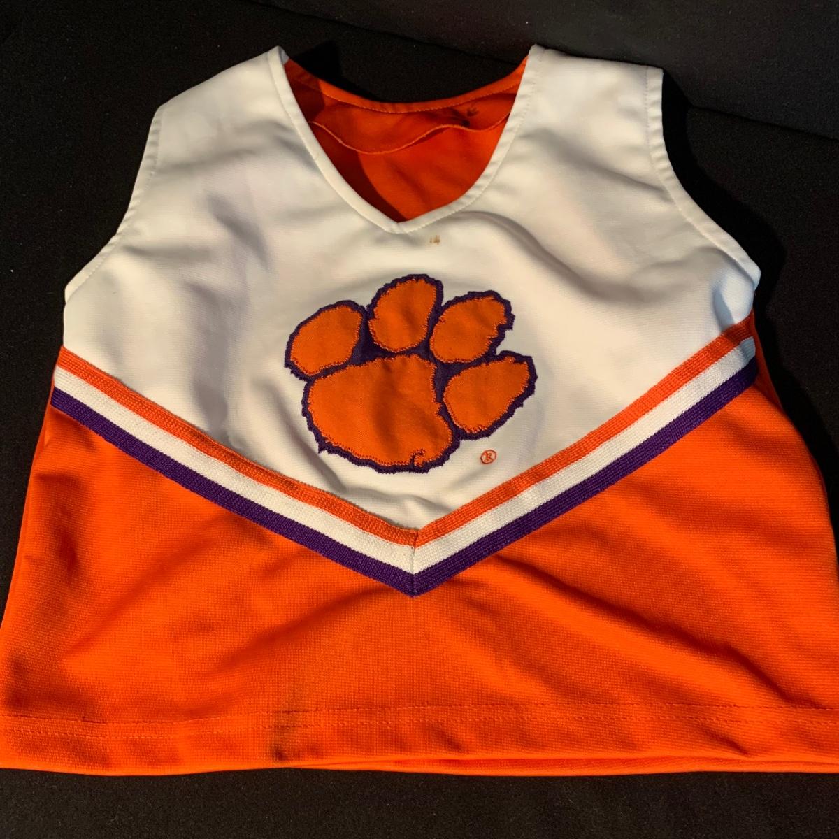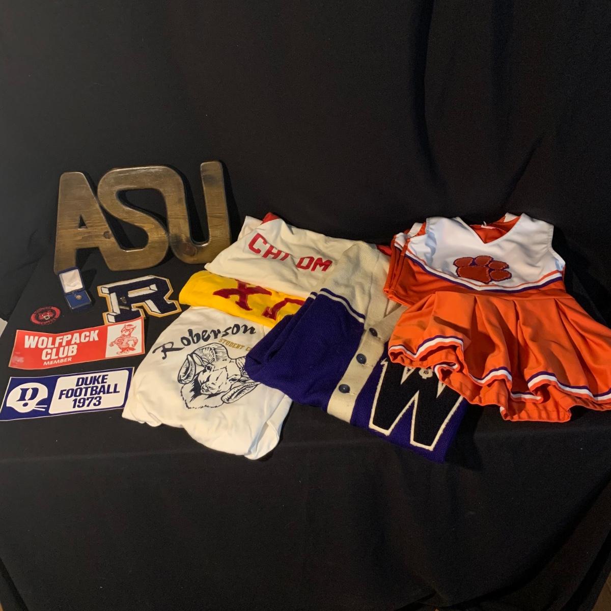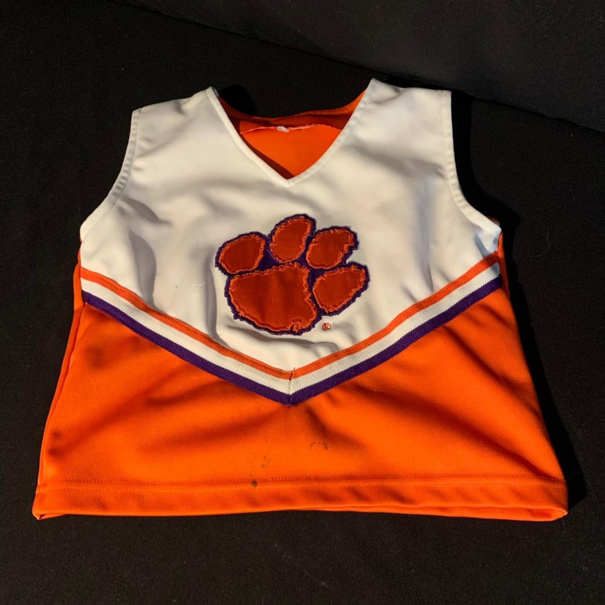 This lot includes college and high school apparel including a sweatshirt, two shirts, a varsity sweater, and a kids Clemson cheerleading costume. The sweatshirt is a youth Large and the tops and sweater appear to fit a size Medium to Large. The lot also includes stickers, pins, and patches. The cheerleading outfit fits a child’s 7. The tops have some small stains on them. Shipping available.