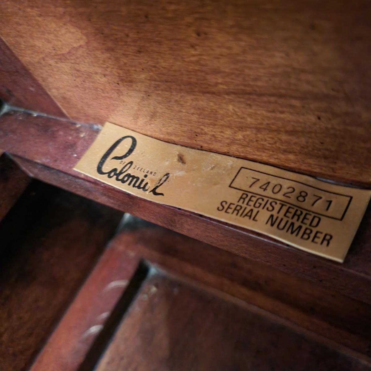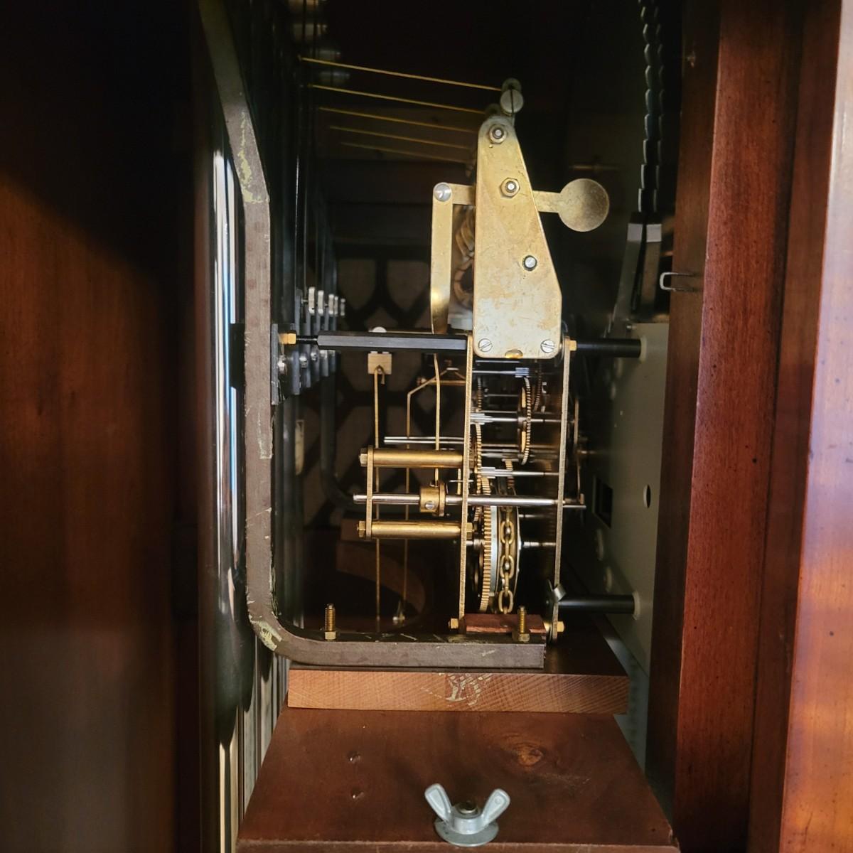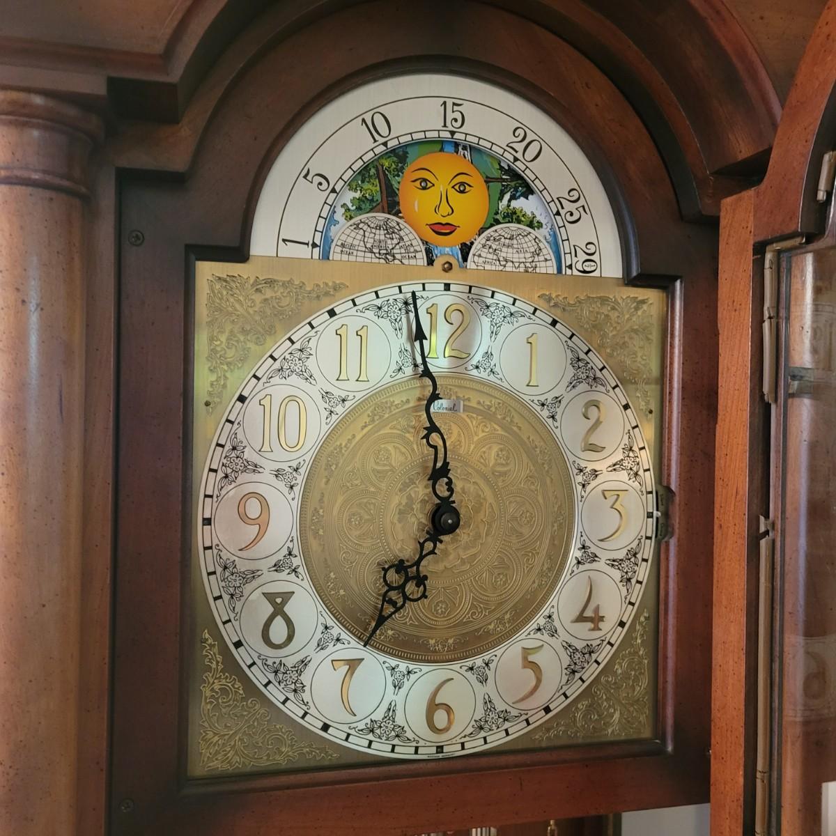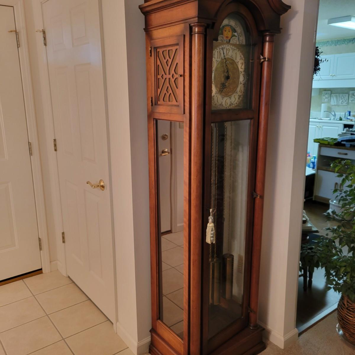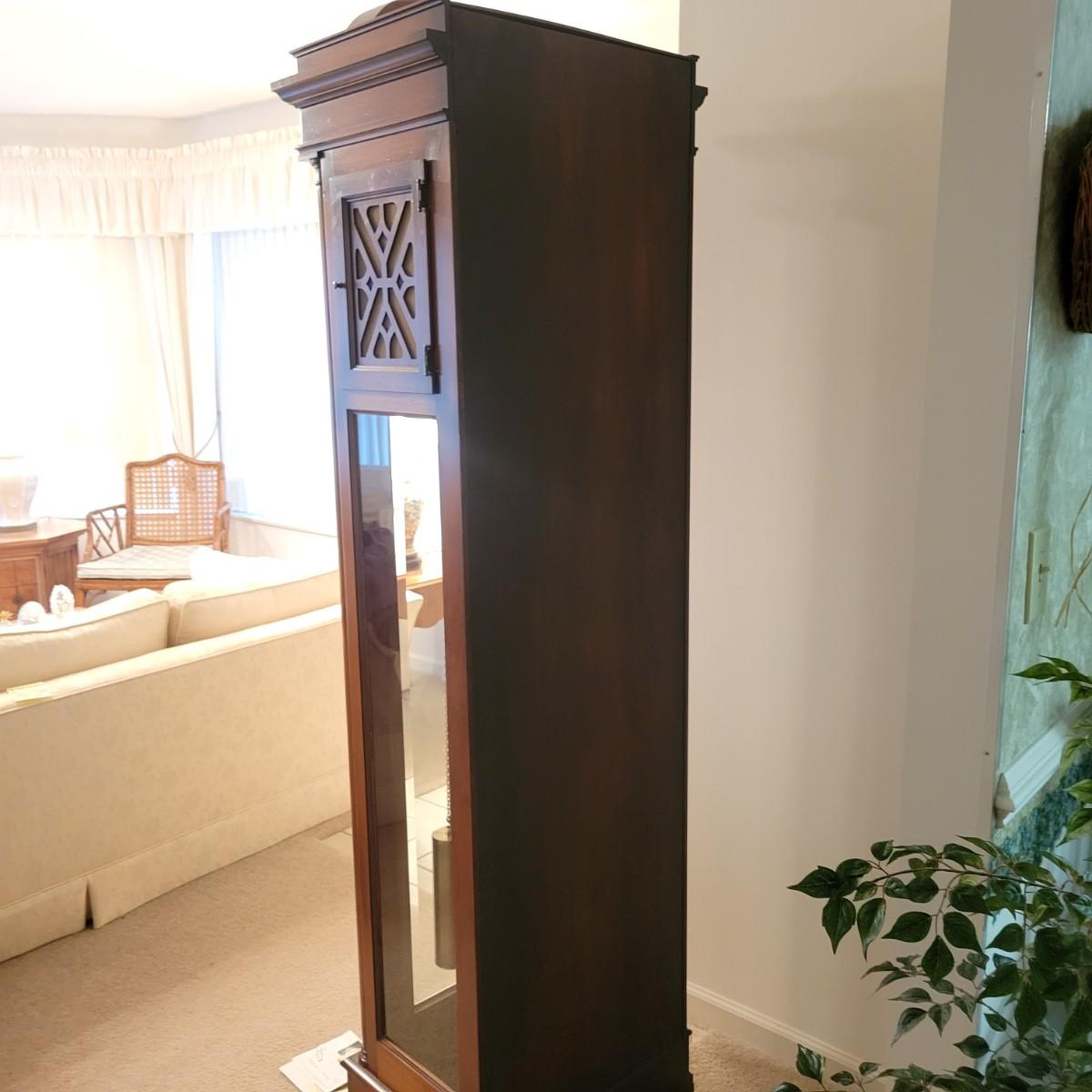A Colonial of Zeeland wooden grandfather clock with a cherry finish. This clock features weights to wind the clock, an engraved face and a satisfying tick to its pendulum. This clock is working. Measures approximately 21.5" x 15.5" x 83"H. Local pickup only. Winning bidder must bring assistance to help move and load this item due to its weight and/or size.