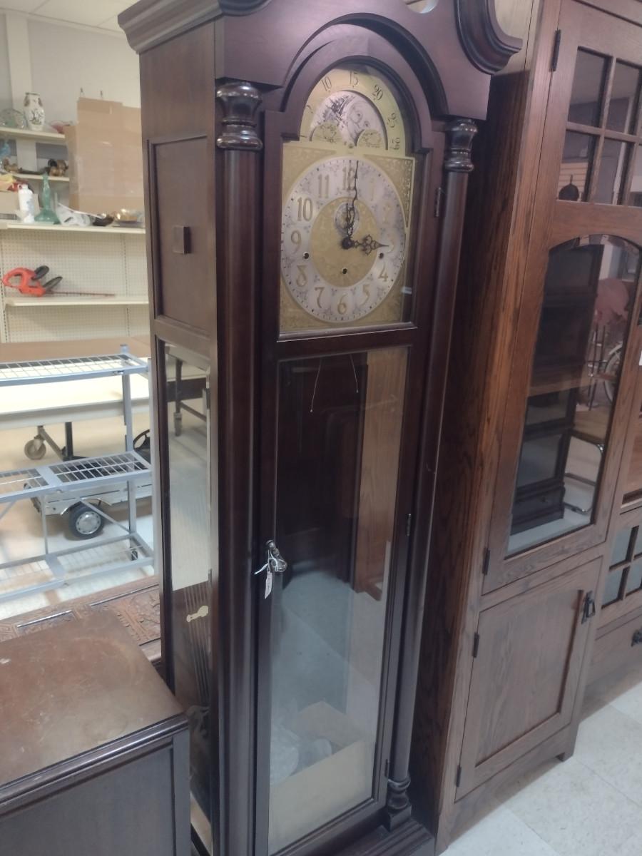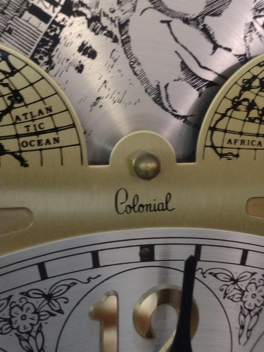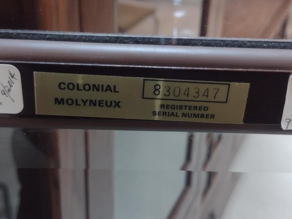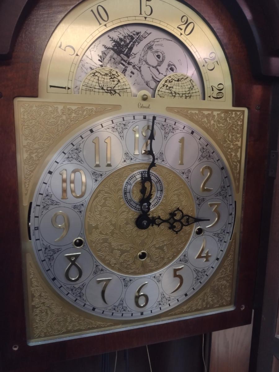 Colonial Molyneux Wood Cased Grandfather Clock with Moon Dial. All parts appear to be present. Item is in working condition per owner.