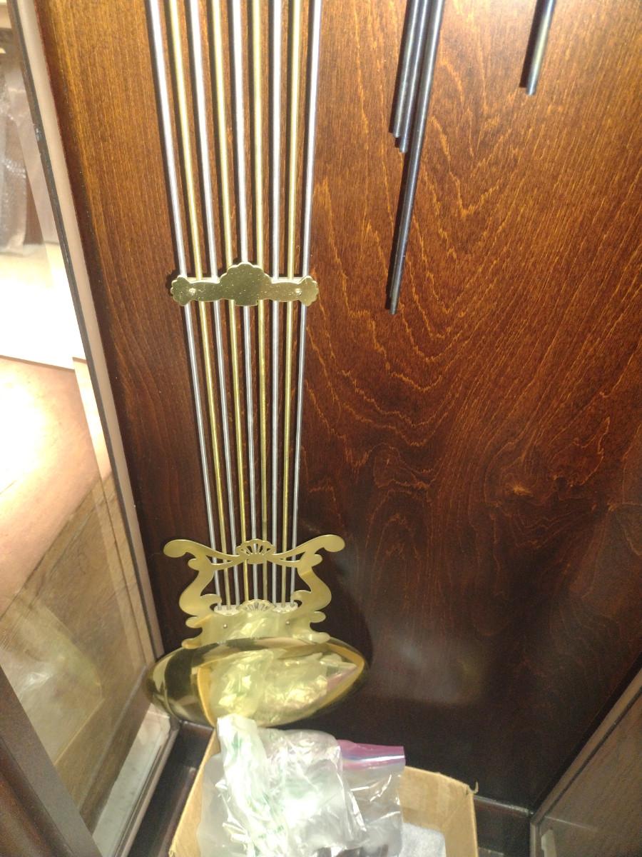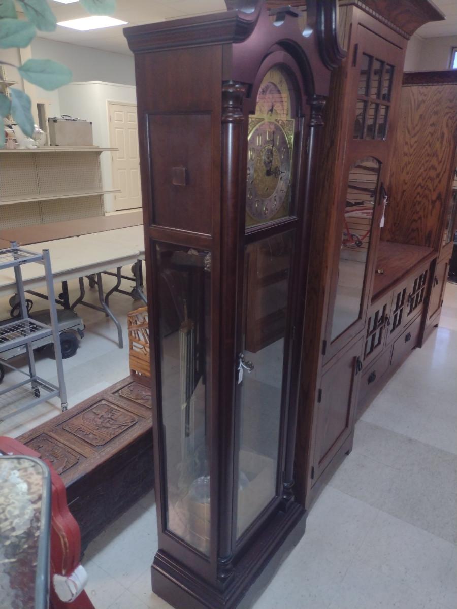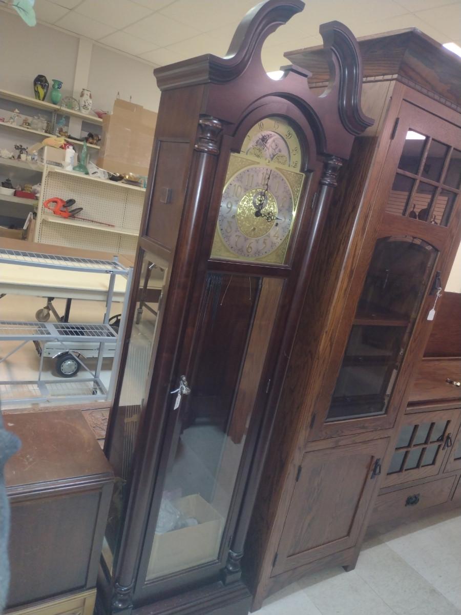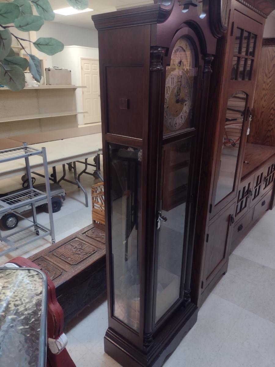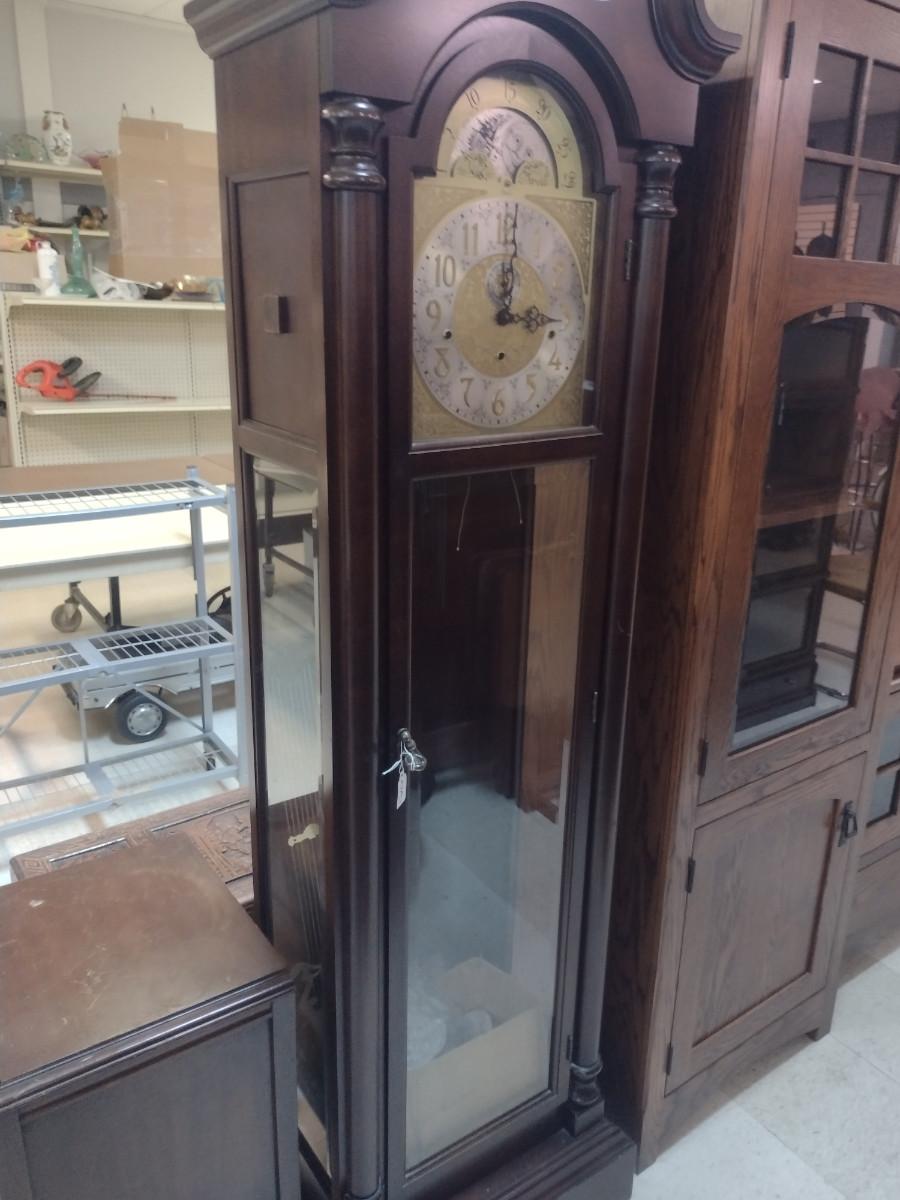 Colonial Molyneux Wood Cased Grandfather Clock with Moon Dial. All parts appear to be present. Item is in working condition per owner.
