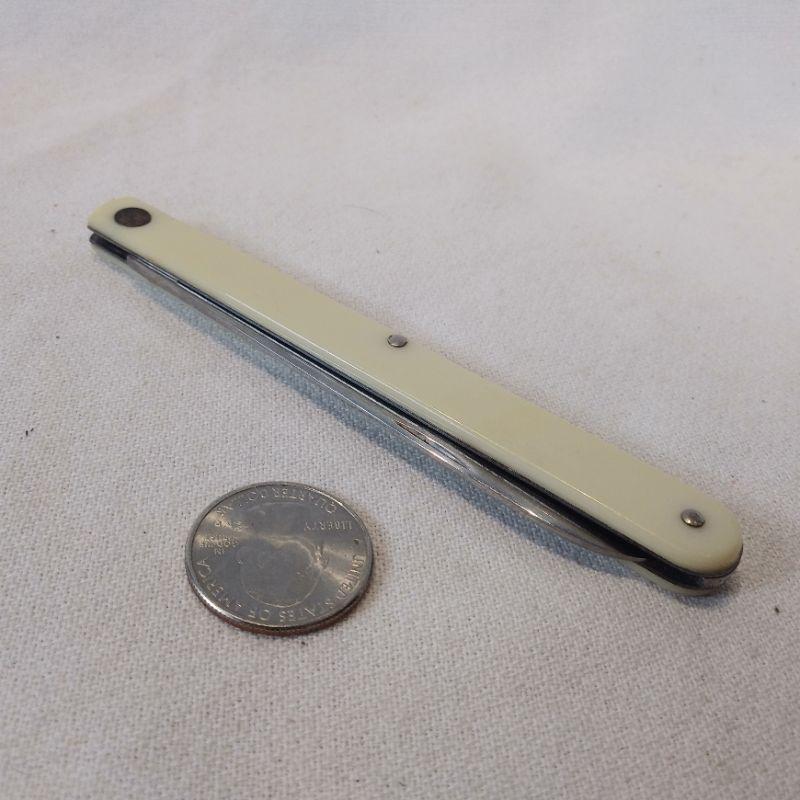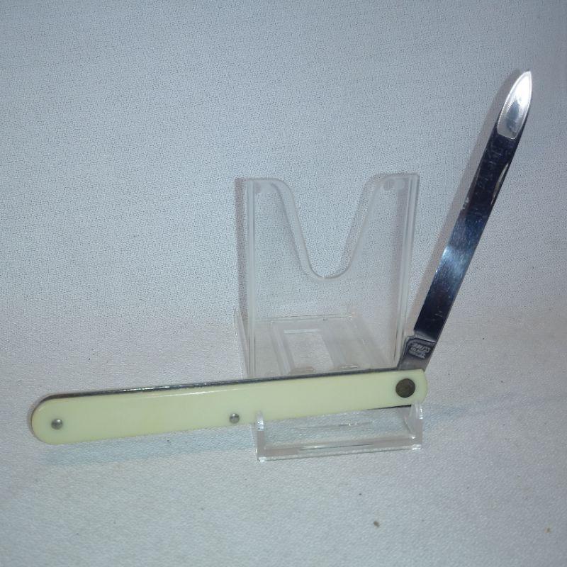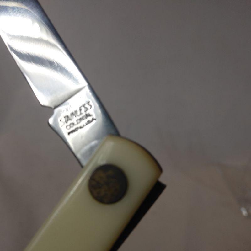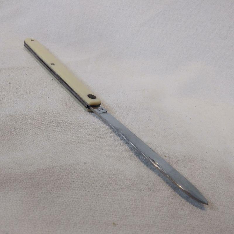 This very nice knife is a vintage Colonial USA Melon Tester Knife with Prov V cut blade. The handle is an ivory-colored Bakelite. Fully extended it measures 8 1/2 inches long. Blade and handle are in very good shape.