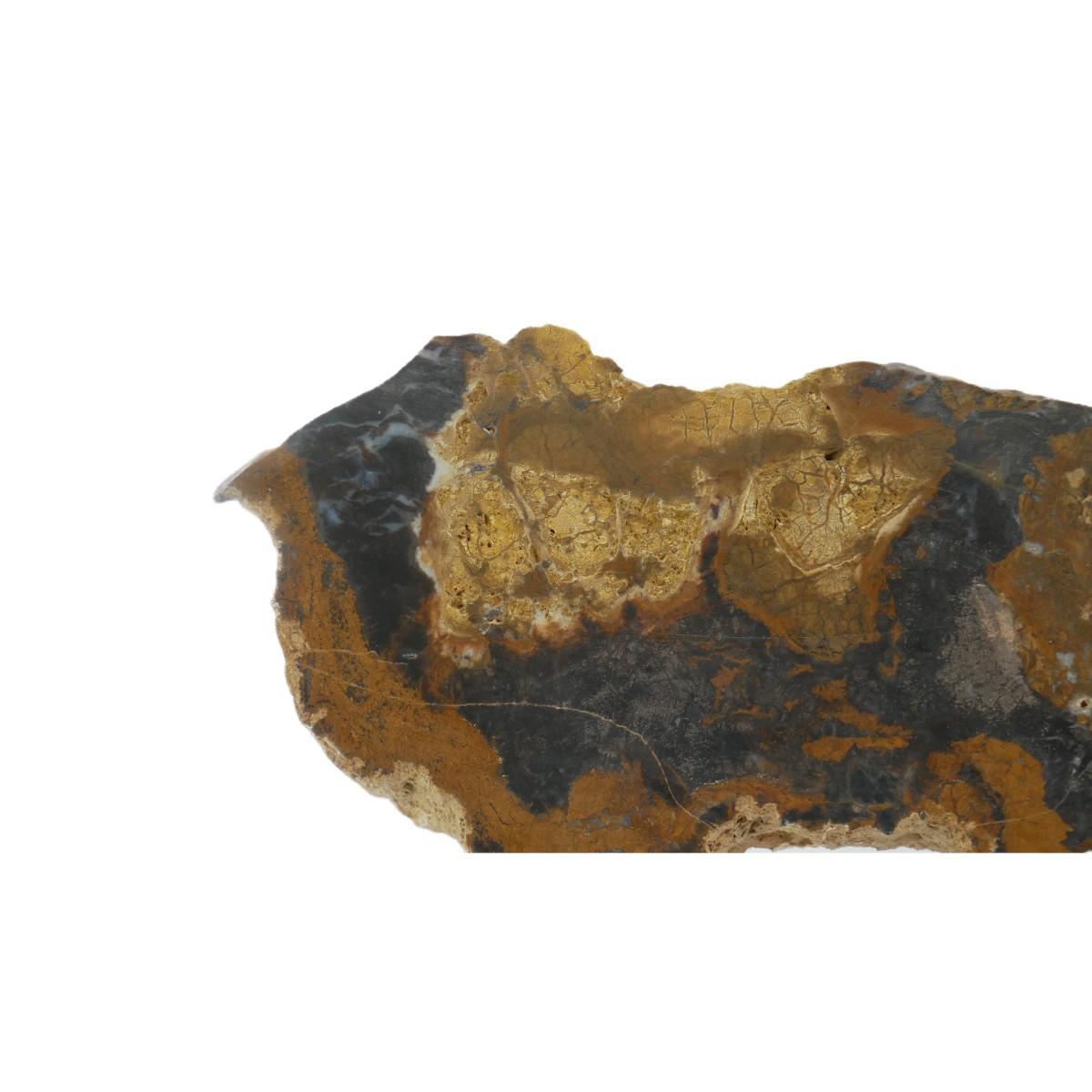 Gorgeous slab of Colorado petrified wood. Dual polished sides with raw edges. Brown, grey, marble black, and tan. Marked "Colo Wood $200" in pencil on one side. Superb condition! Stand not included. Measures L 6.5" x H 3.5" x W 0.25". Weighs 9.6 oz. (R8)