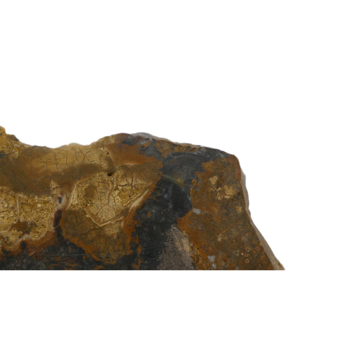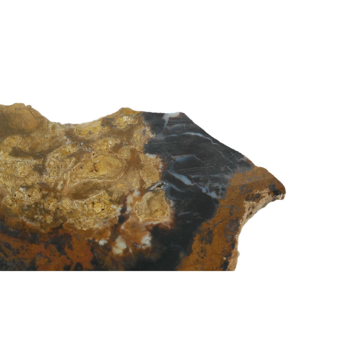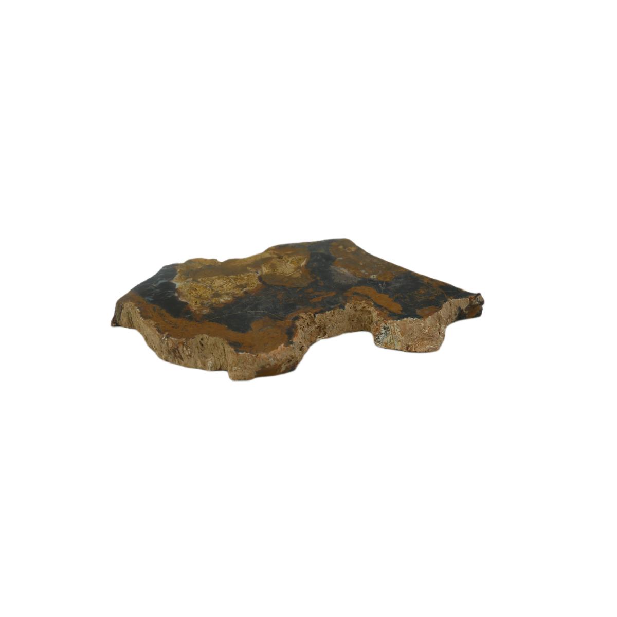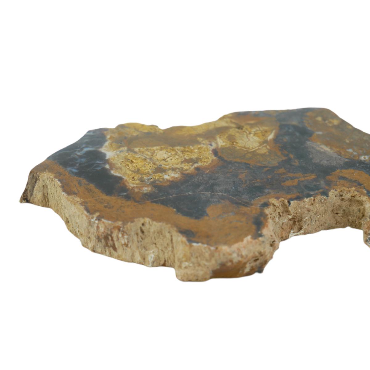 Gorgeous slab of Colorado petrified wood. Dual polished sides with raw edges. Brown, grey, marble black, and tan. Marked "Colo Wood $200" in pencil on one side. Superb condition! Stand not included. Measures L 6.5" x H 3.5" x W 0.25". Weighs 9.6 oz. (R8)