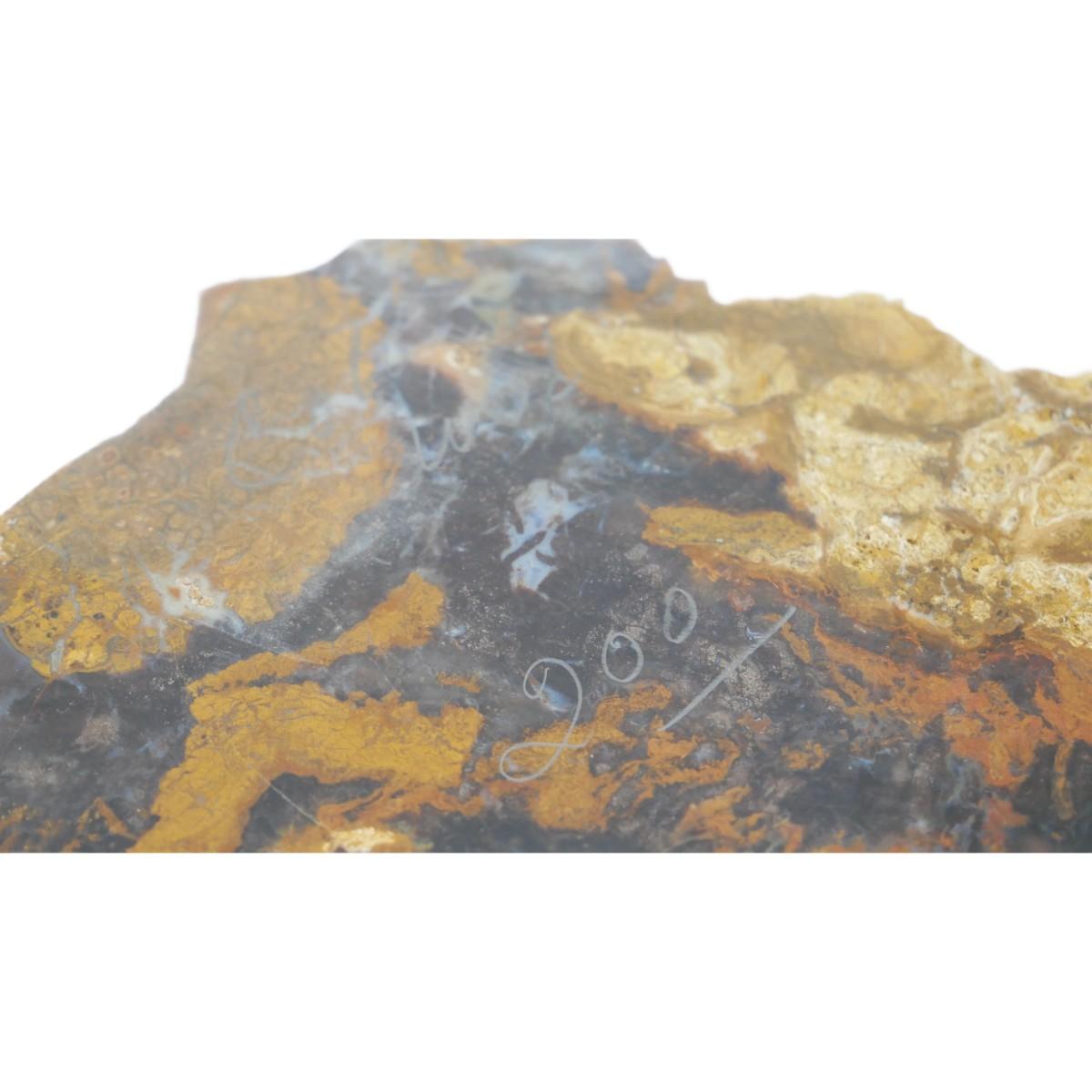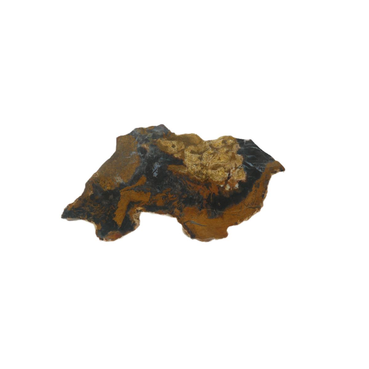 Gorgeous slab of Colorado petrified wood. Dual polished sides with raw edges. Brown, grey, marble black, and tan. Marked "Colo Wood $200" in pencil on one side. Superb condition! Stand not included. Measures L 6.5" x H 3.5" x W 0.25". Weighs 9.6 oz. (R8)