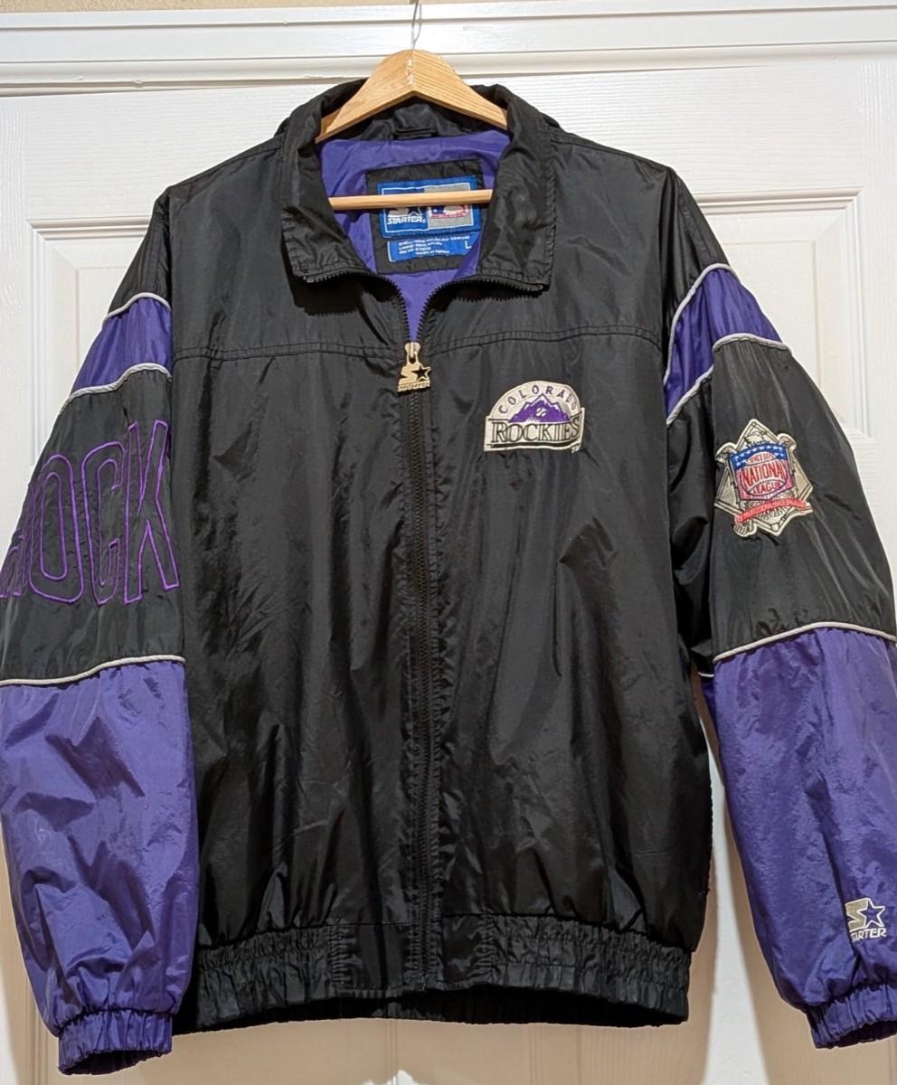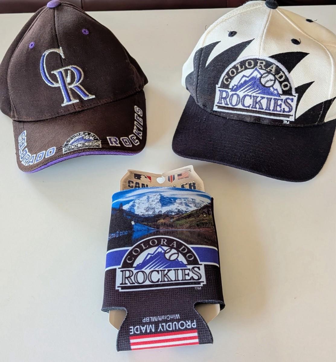 Includes a 1990s Starter brand Colorado Rockies windbreaker jacket (men’s size L) featuring embroidered logos, purple/black color block design, and National League patch on the sleeve. Also includes two vintage Rockies baseball caps (one black/purple “CR” logo and one cream/black with mountain logo) plus a new-with-tag Rockies can cooler.