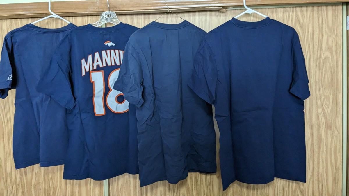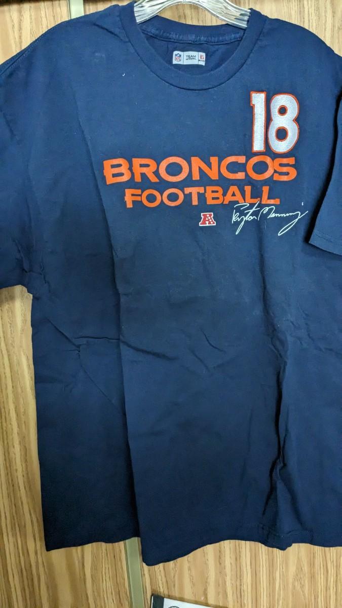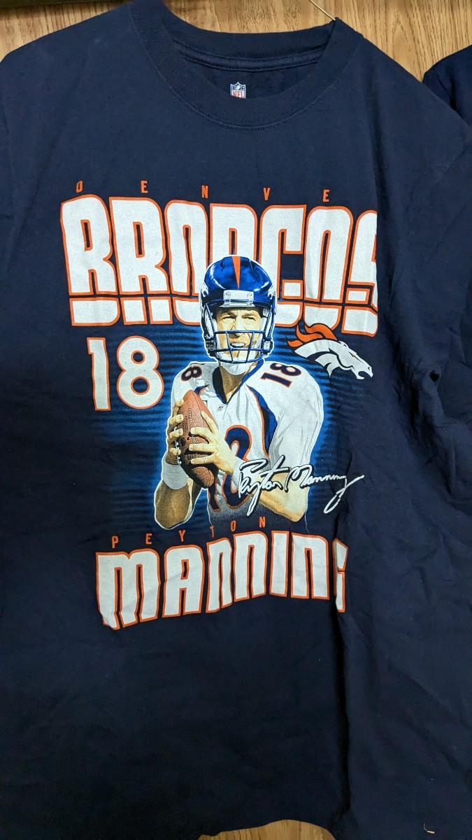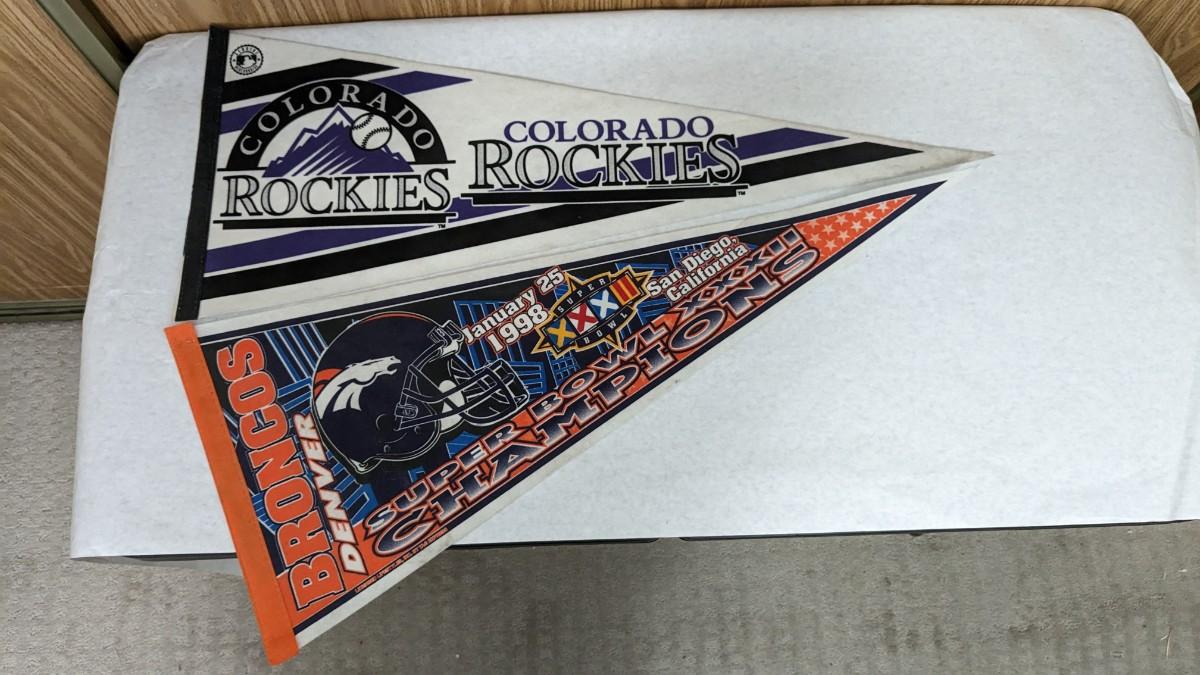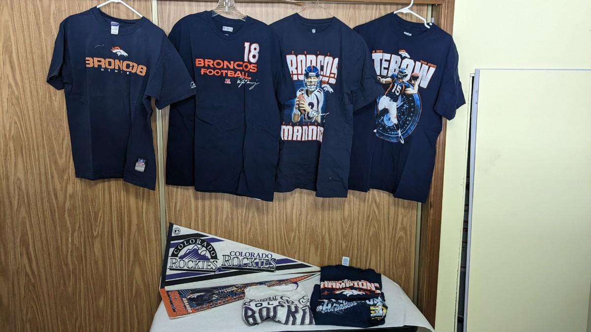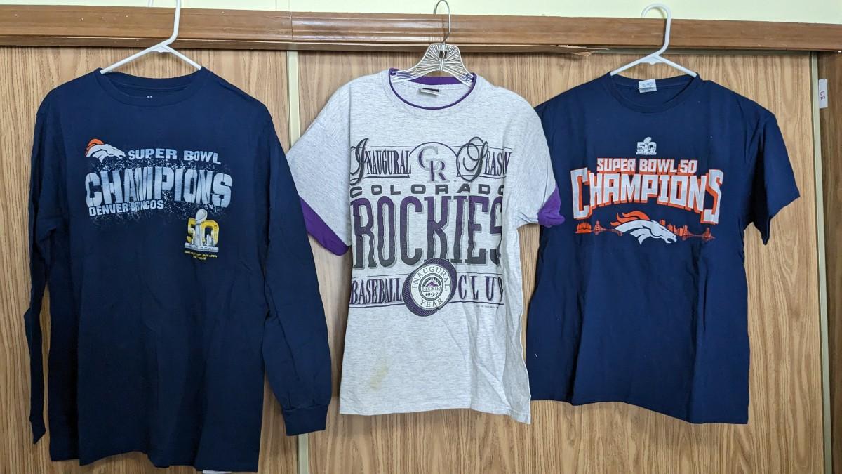 6 Broncos shirts, 2 from the 50th Super Bowl and the Broncos championship (L&XL), 2 Peyton Manning shirts(both XL), 1 Tim Tebow shirt (XL), and a Reebok/NFL shirt (M). Also includes 2 pennants, one from January 1998, the 32nd Super Bowl and a SIGNED Rockies pennant as well as inaugural Rockies shirt (L), note light staining on bottom of this piece. Fun multi decade lot. bdrm2