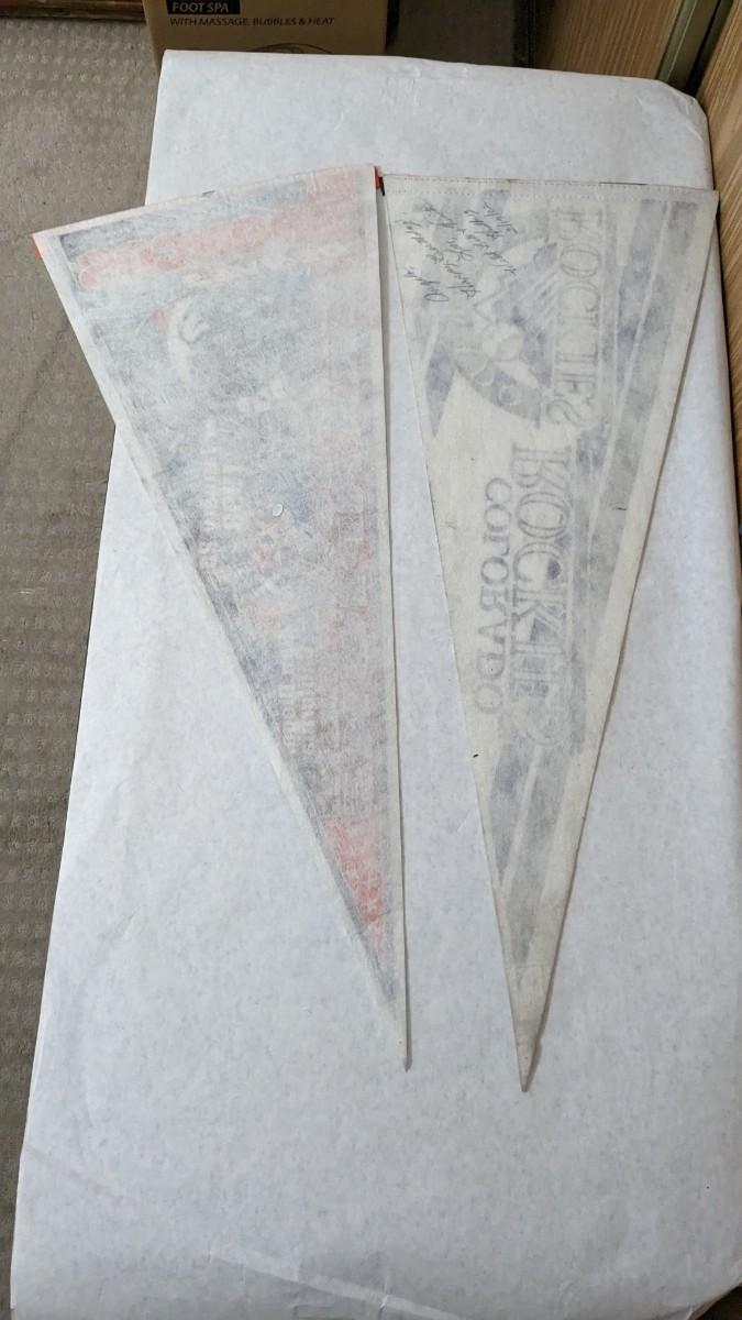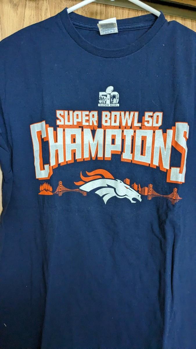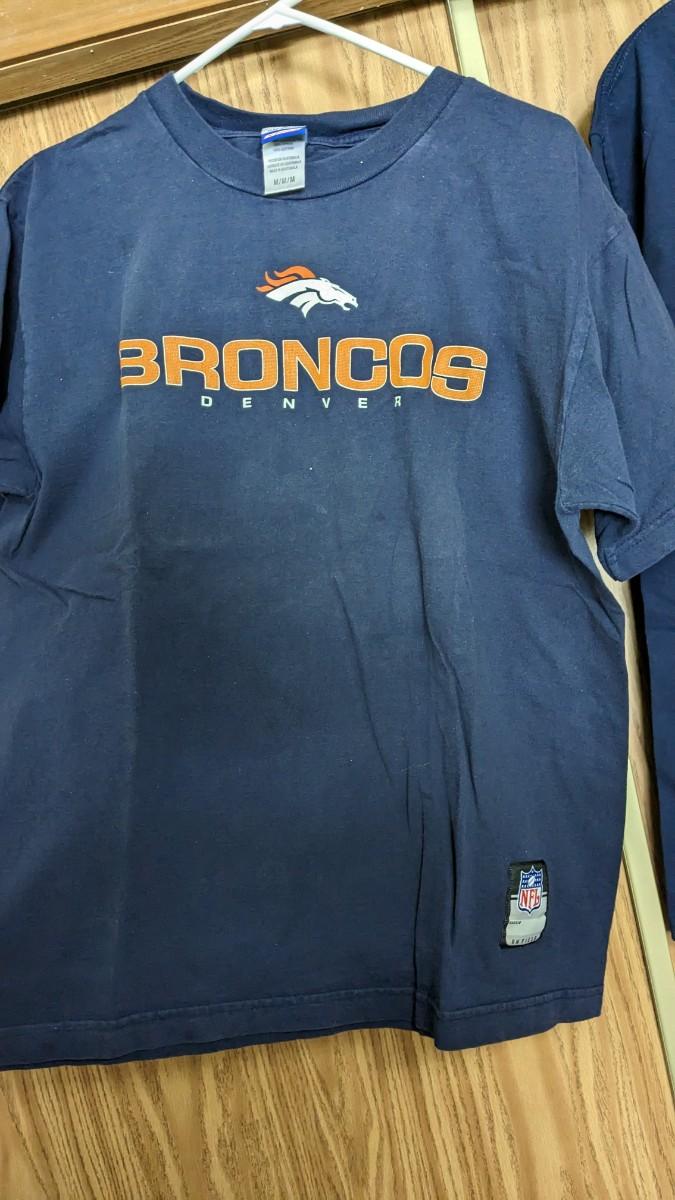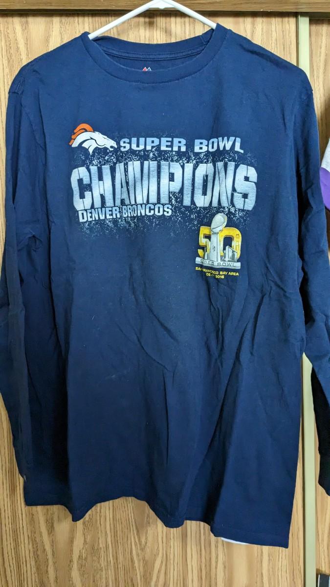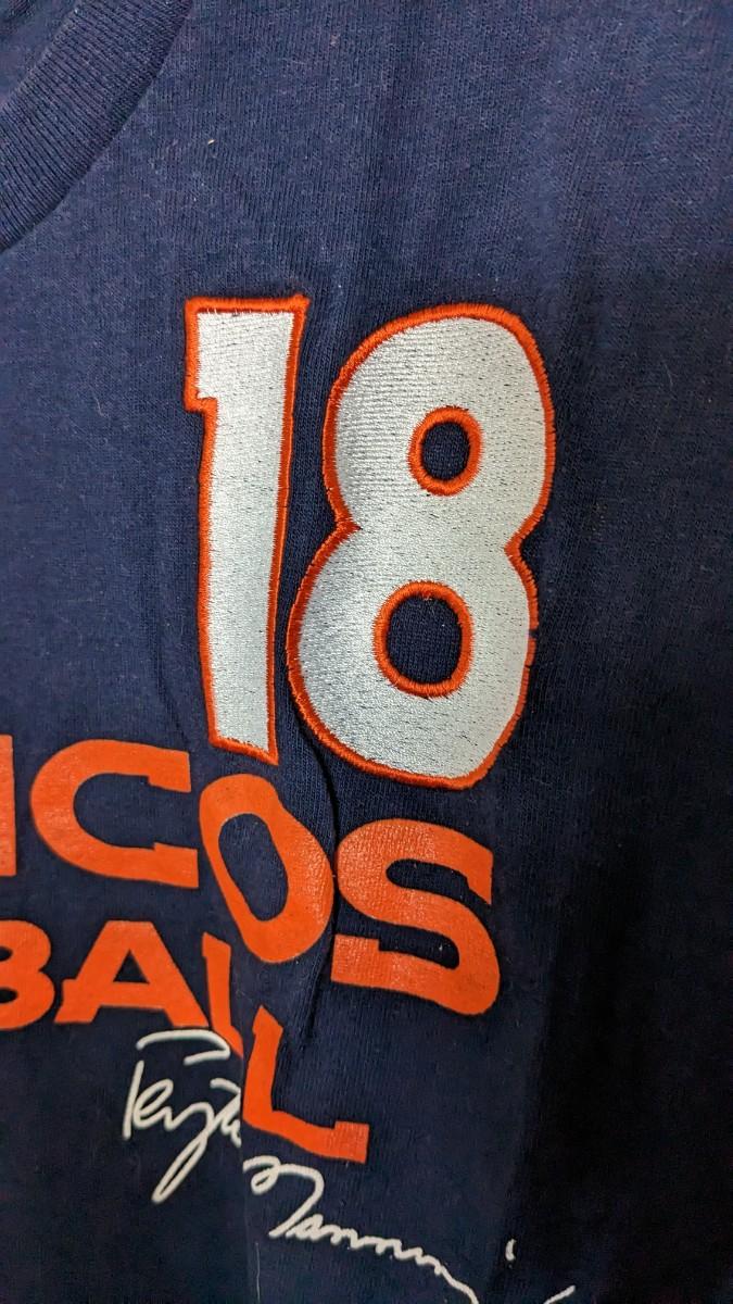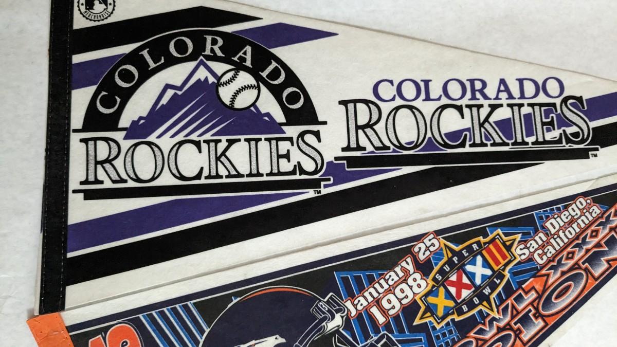 6 Broncos shirts, 2 from the 50th Super Bowl and the Broncos championship (L&XL), 2 Peyton Manning shirts(both XL), 1 Tim Tebow shirt (XL), and a Reebok/NFL shirt (M). Also includes 2 pennants, one from January 1998, the 32nd Super Bowl and a SIGNED Rockies pennant as well as inaugural Rockies shirt (L), note light staining on bottom of this piece. Fun multi decade lot. bdrm2
