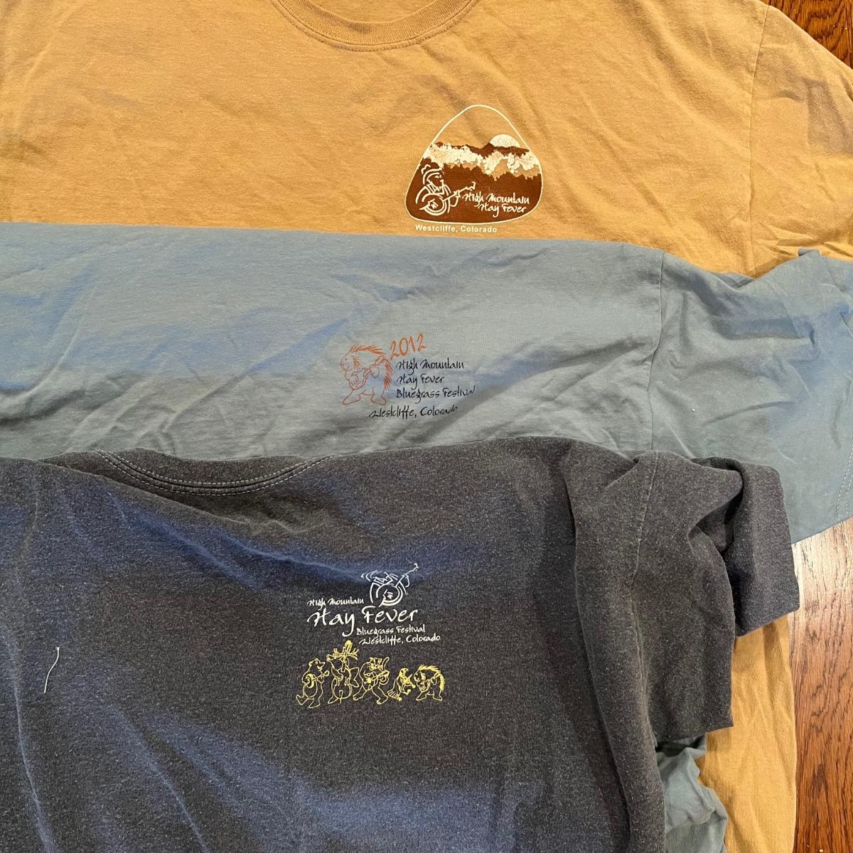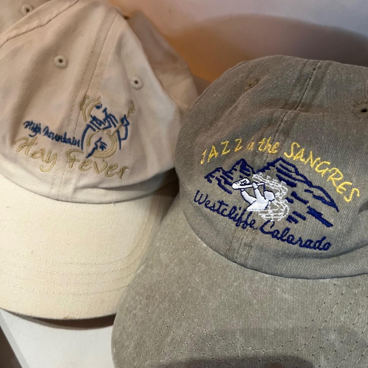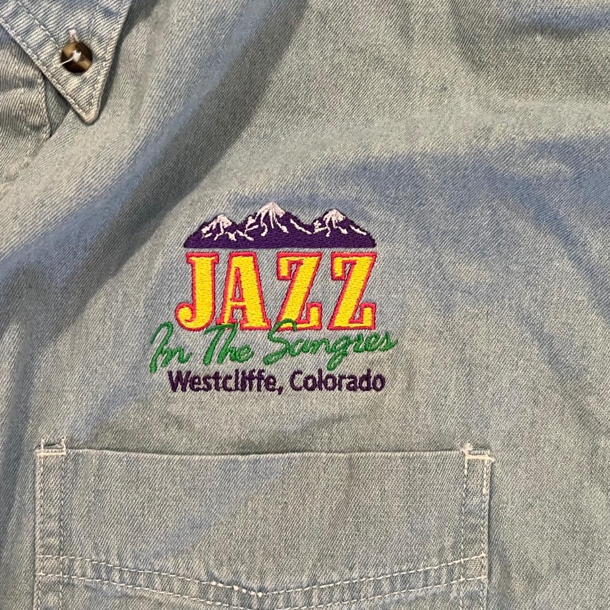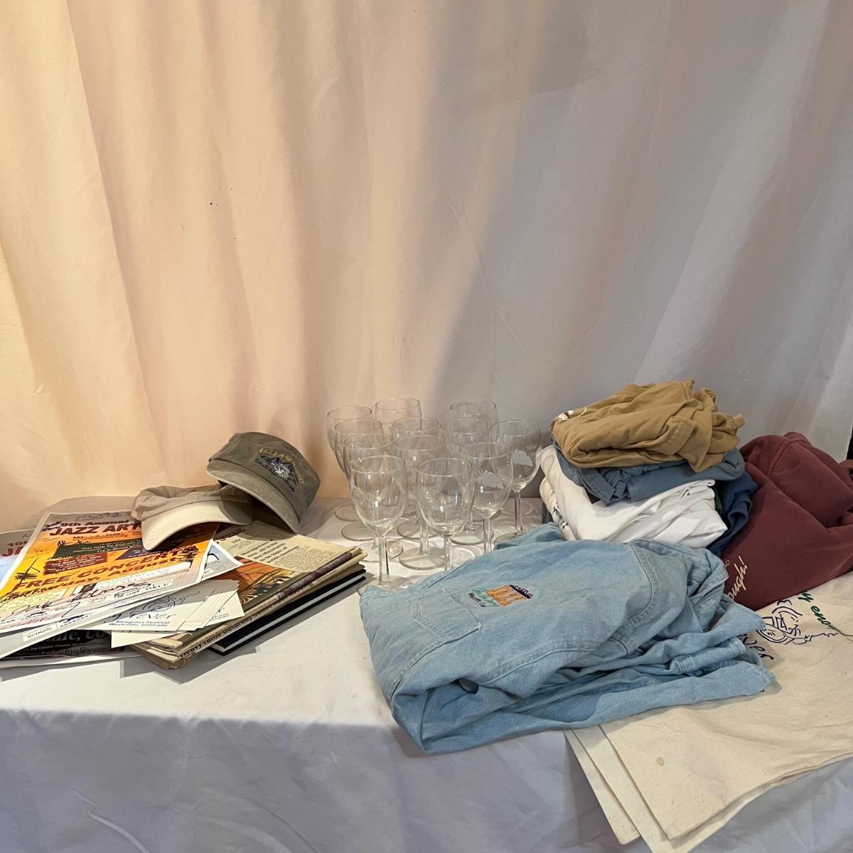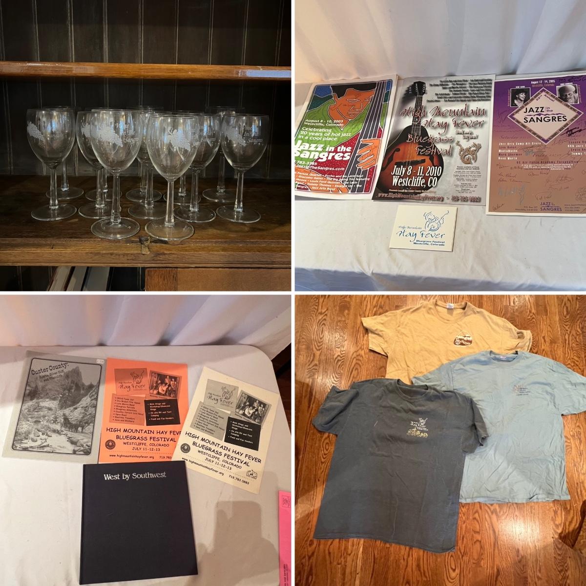 A collection of Colorado t-shirts, baseball caps, festival posters and more. There are 11 wine glasses. All clothing appears to be XL (a few labels are missing off shirts). Lots of newspapers and a book titled West by Southwest for the Sangre de Cristo Arts & Conference Center. Note that one of the canvas bags has a stain. Posters have signatures (assume these are from the participating artists). Purple “Jazz in the Sangres”poster measures 11” x 17”H.