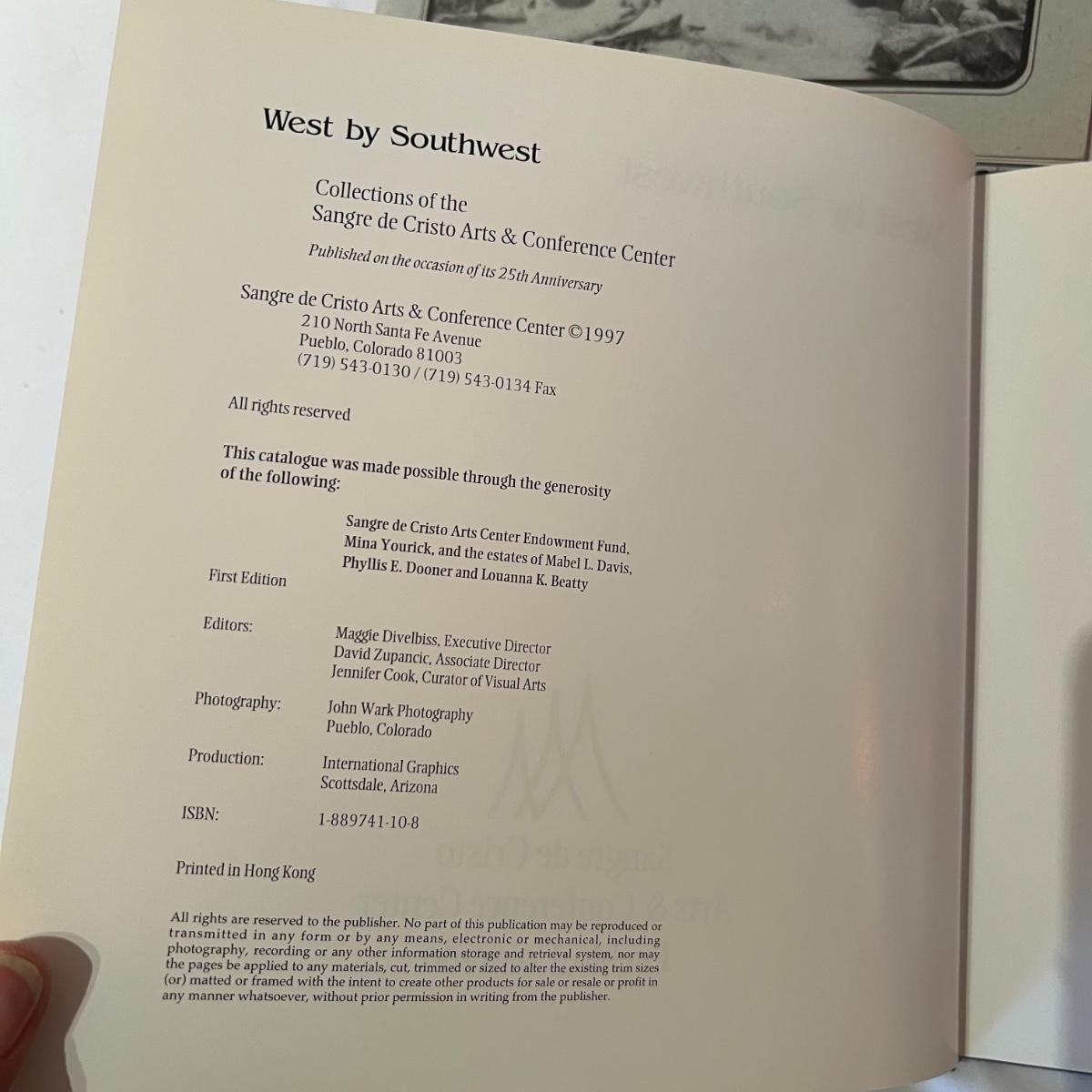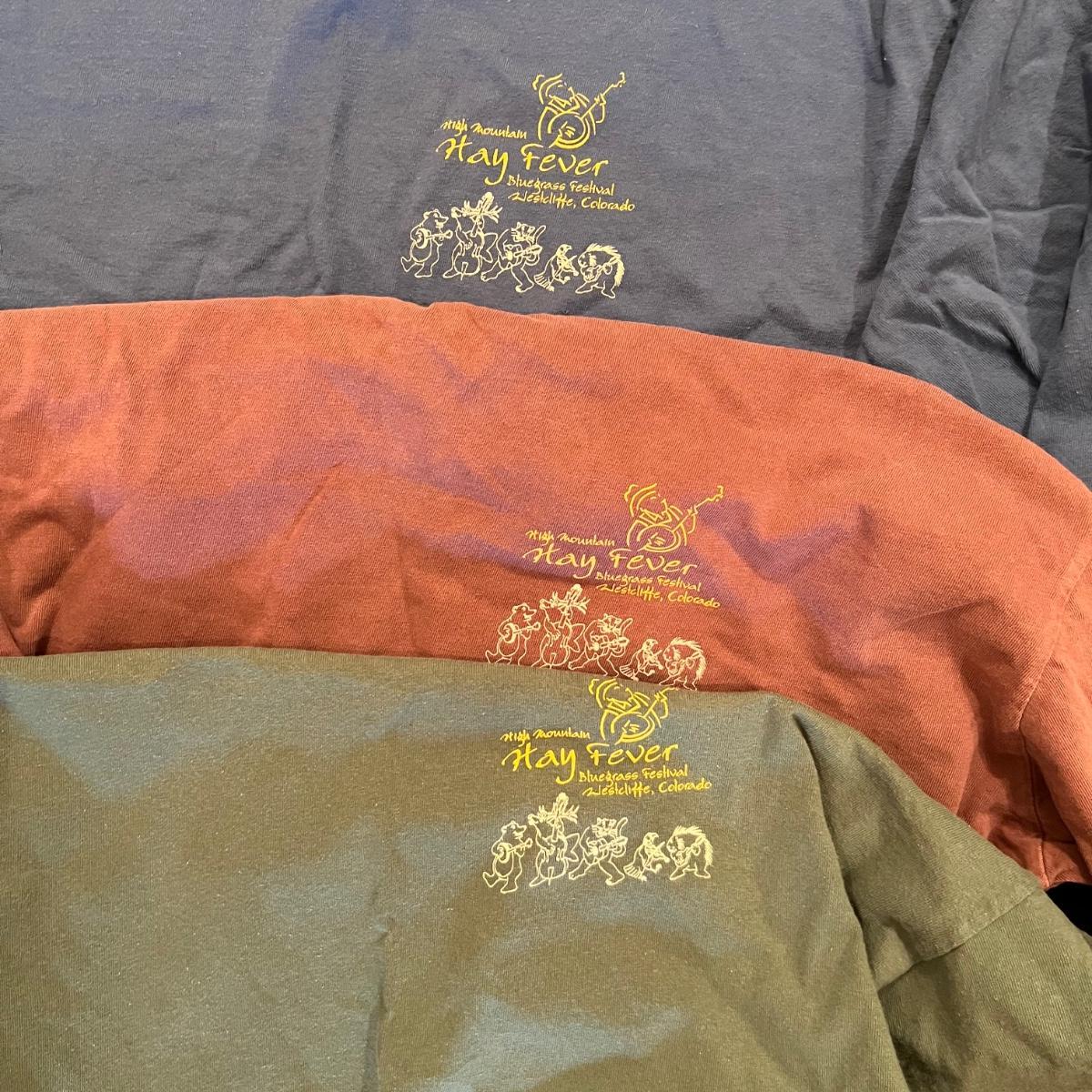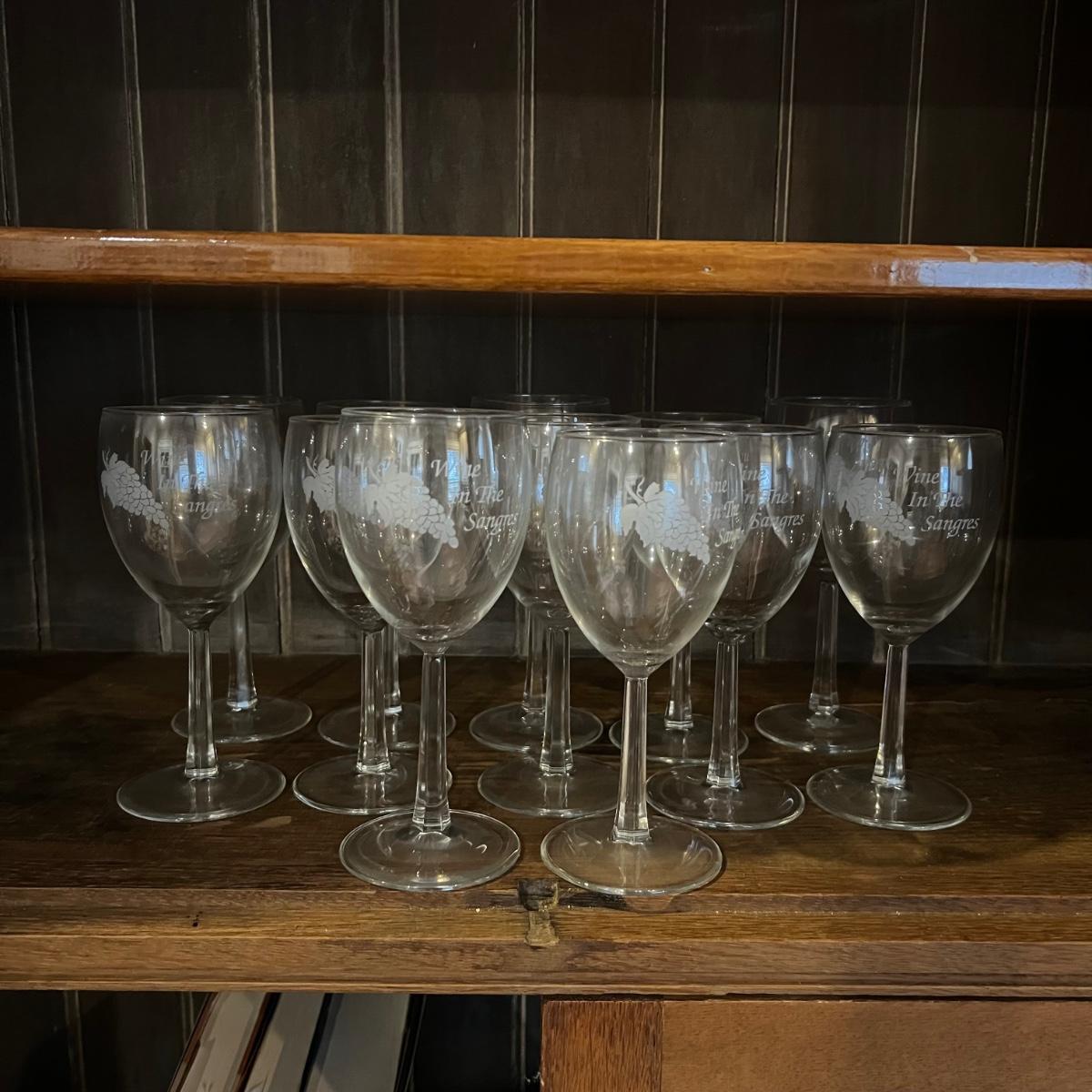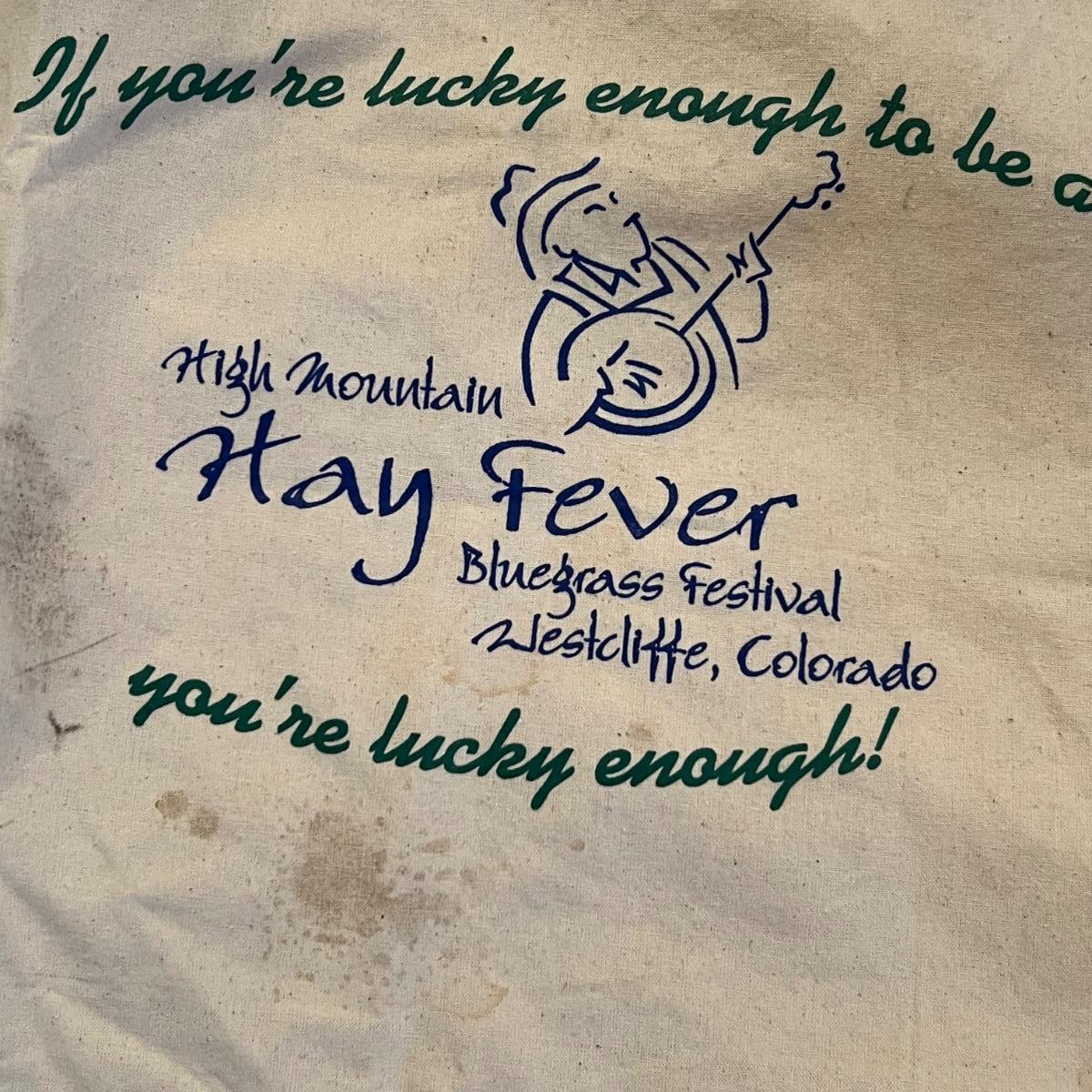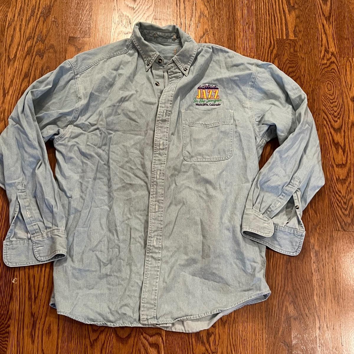 A collection of Colorado t-shirts, baseball caps, festival posters and more. There are 11 wine glasses. All clothing appears to be XL (a few labels are missing off shirts). Lots of newspapers and a book titled West by Southwest for the Sangre de Cristo Arts & Conference Center. Note that one of the canvas bags has a stain. Posters have signatures (assume these are from the participating artists). Purple “Jazz in the Sangres”poster measures 11” x 17”H.