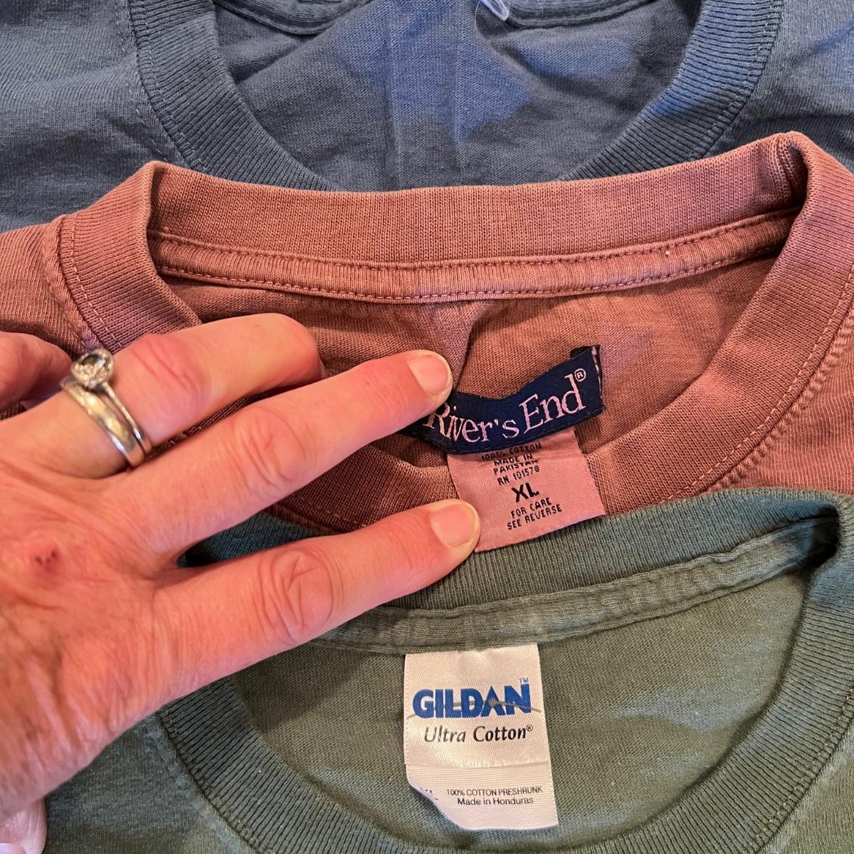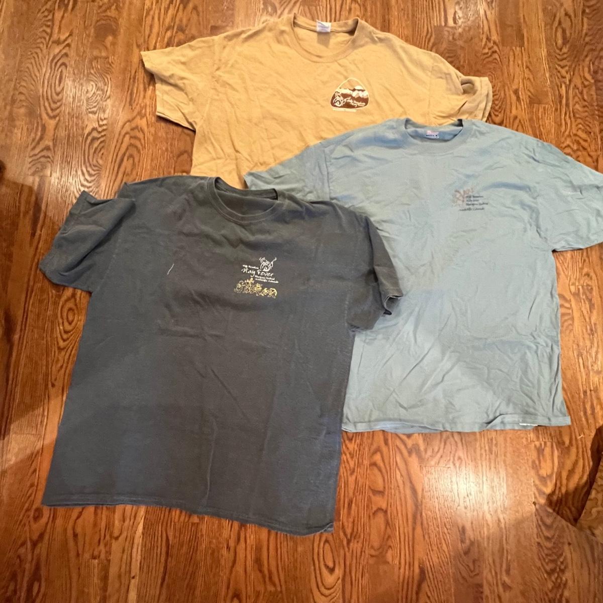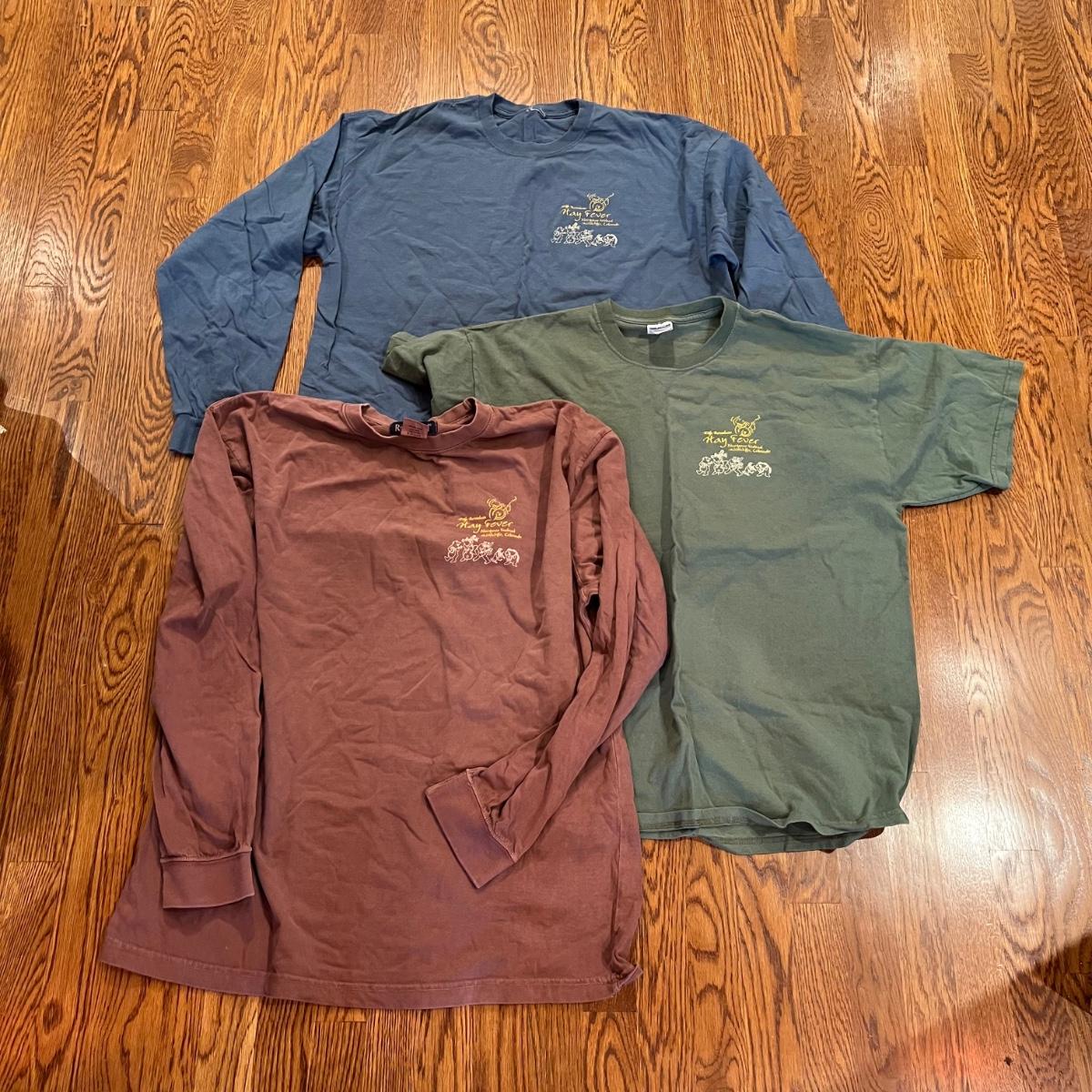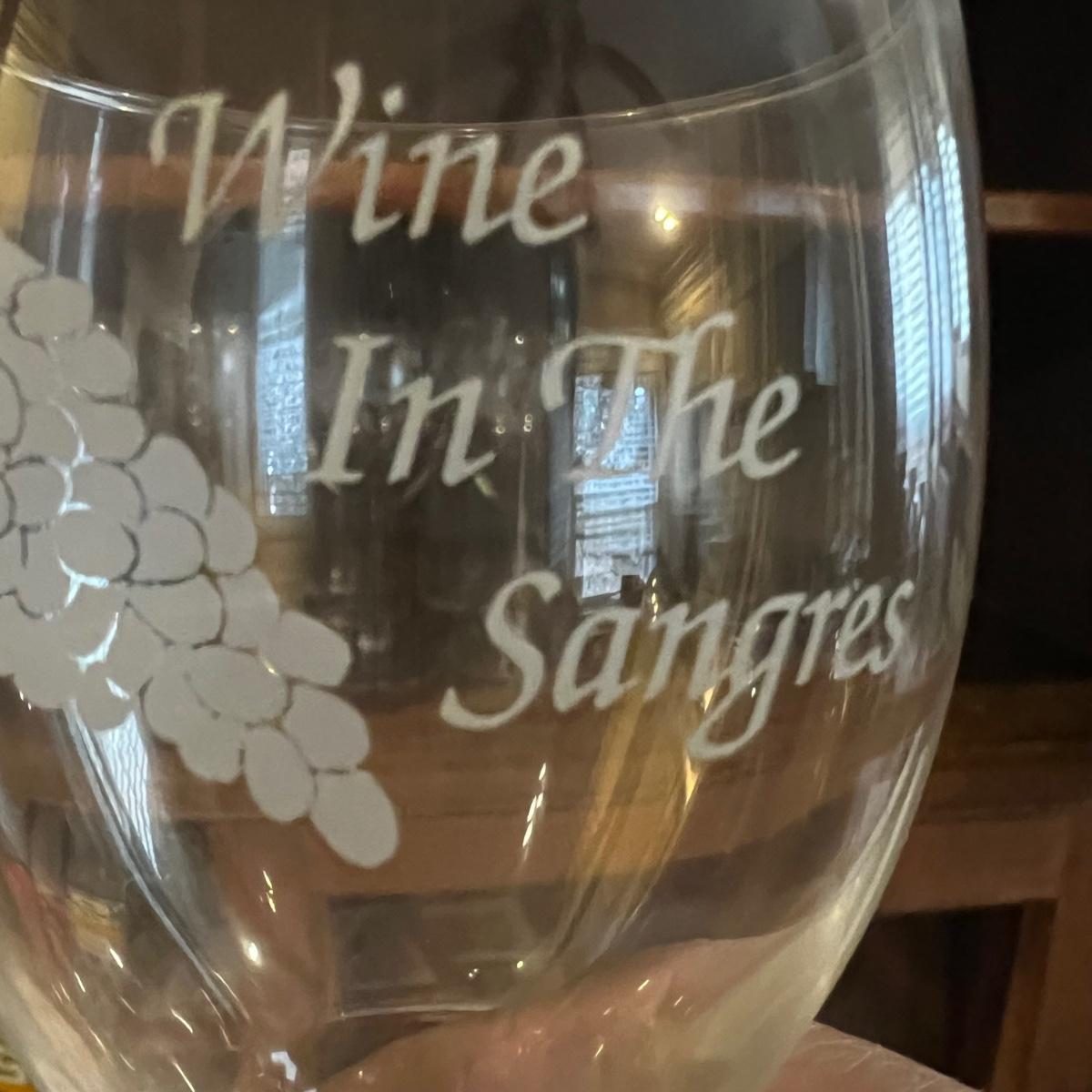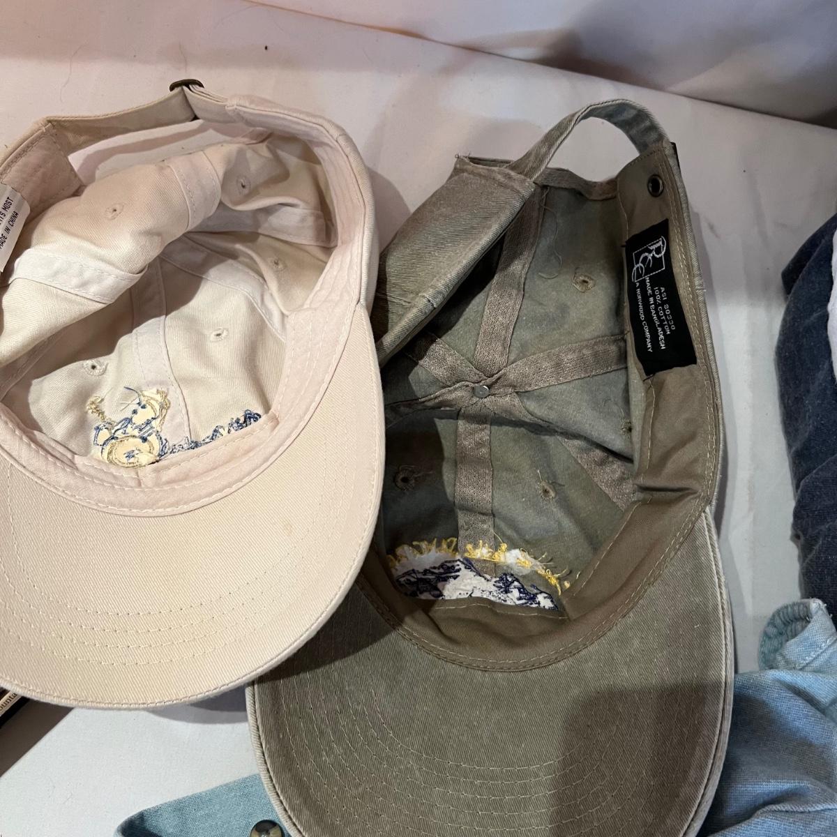 A collection of Colorado t-shirts, baseball caps, festival posters and more. There are 11 wine glasses. All clothing appears to be XL (a few labels are missing off shirts). Lots of newspapers and a book titled West by Southwest for the Sangre de Cristo Arts & Conference Center. Note that one of the canvas bags has a stain. Posters have signatures (assume these are from the participating artists). Purple “Jazz in the Sangres”poster measures 11” x 17”H.