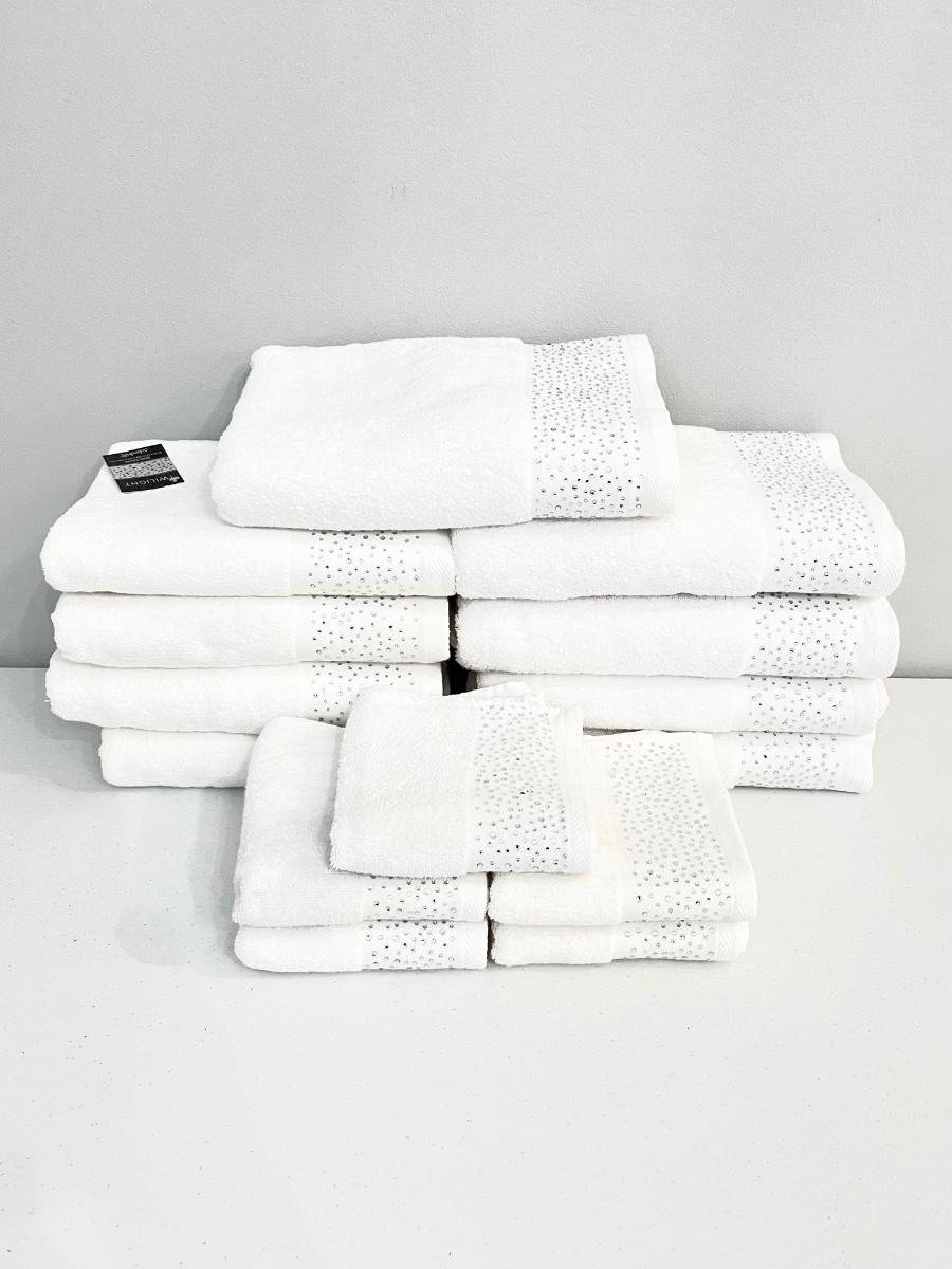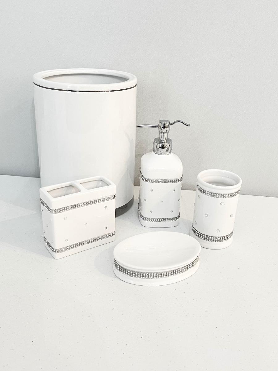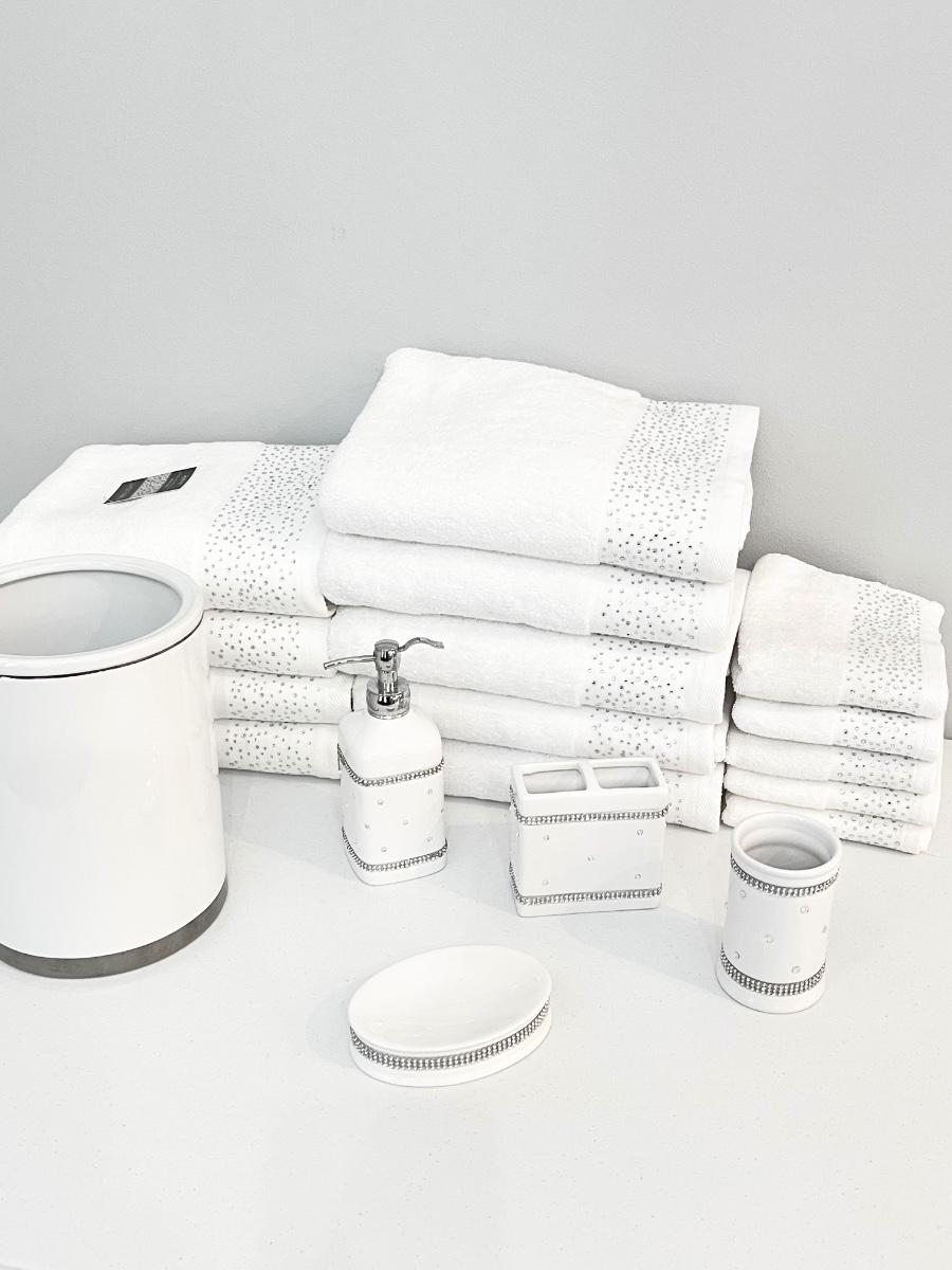 Includes = (9) Bath towels ~ (5) Hand towels ~ (1) Waste basket ~ (1) Lotion dispensers ~ (1) Toothbrush holder ~ (1) ~ Tumbler ~ (1) Soap holder ~ Four towels still have tags & the other are gently used