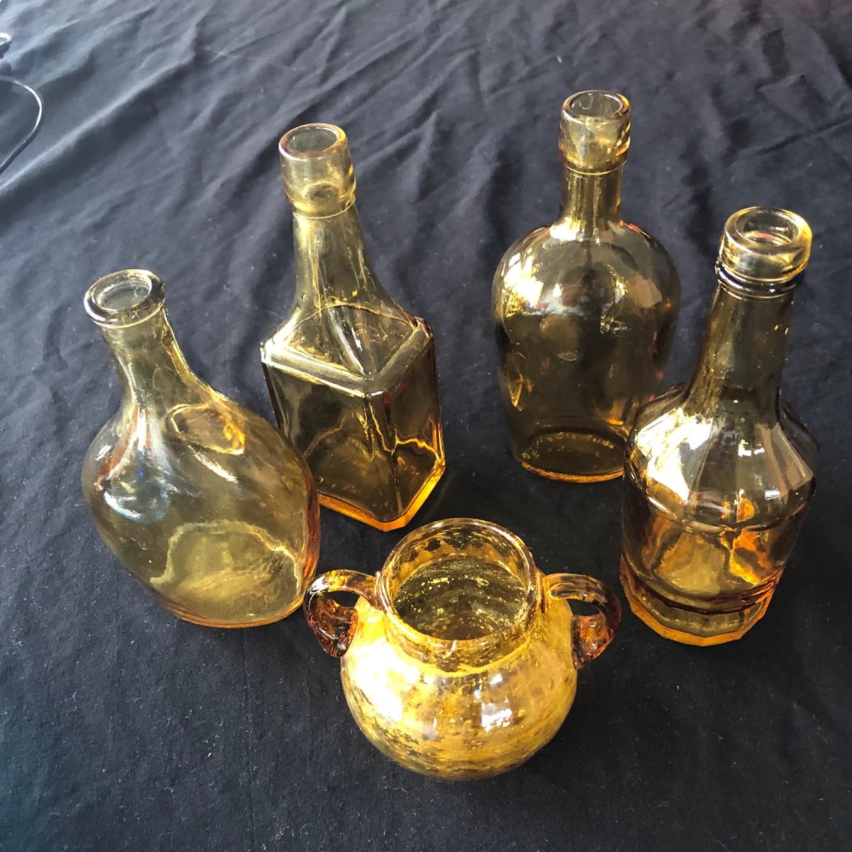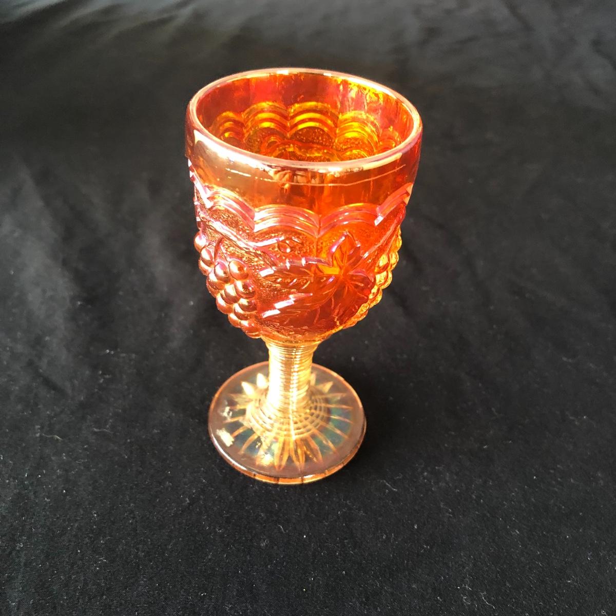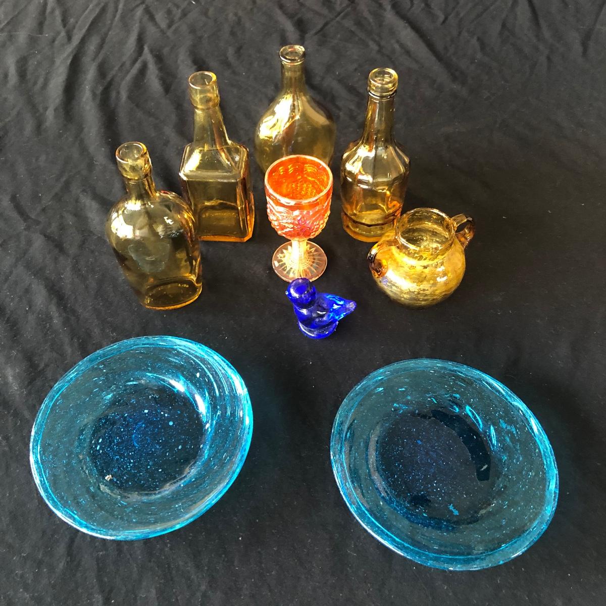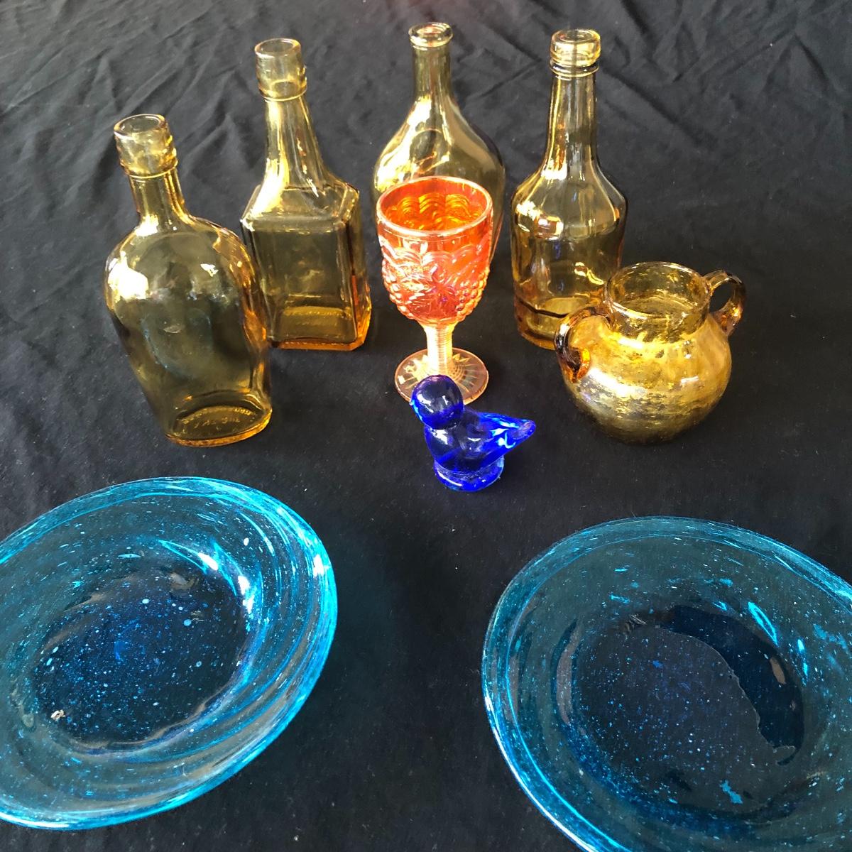 This lot includes five pieces of yellow glass (most pieces about 6” tall), two blue plates (6” in diameter), one blue bird and one orange carnival like goblet. Shipping Available.