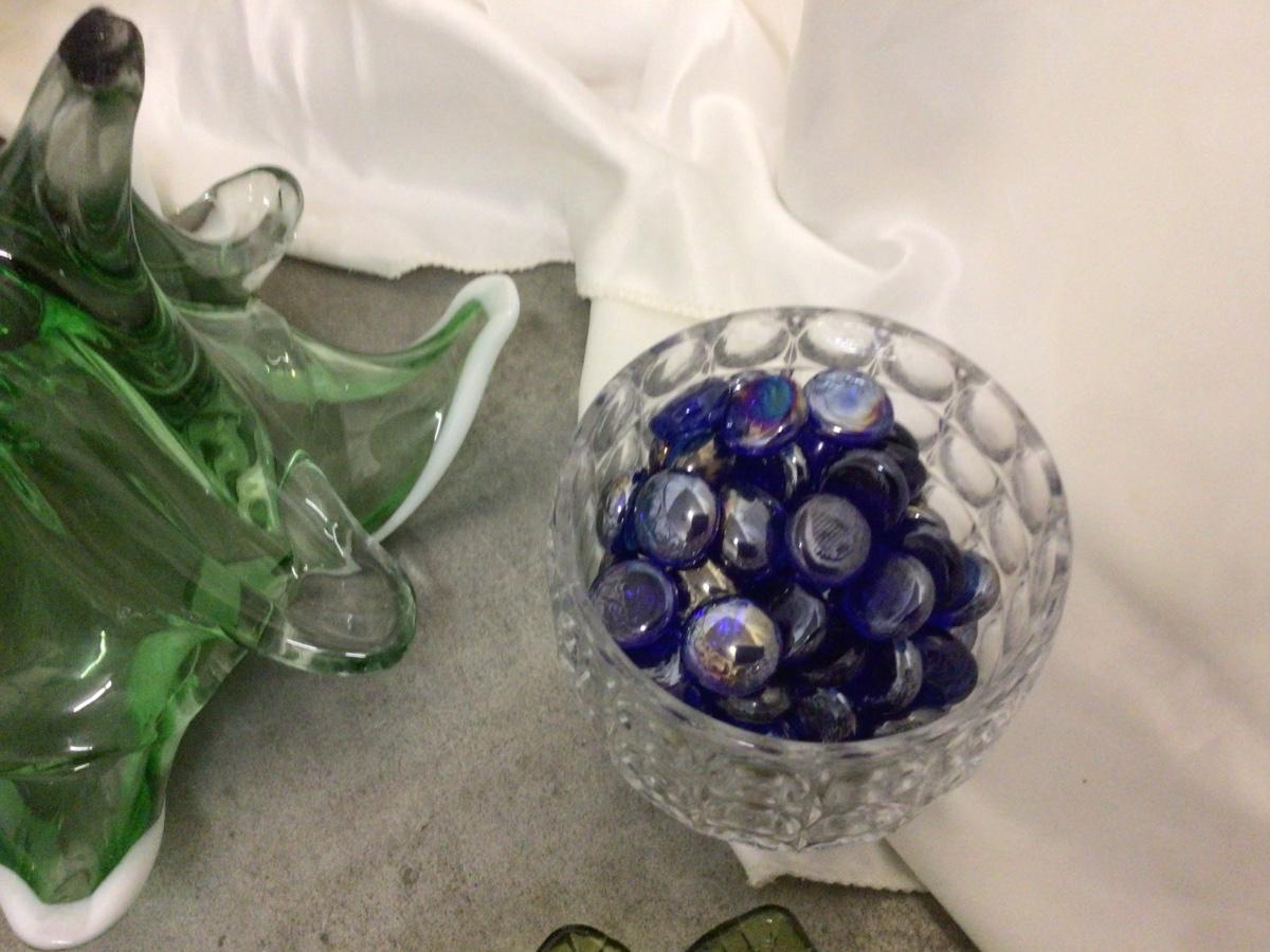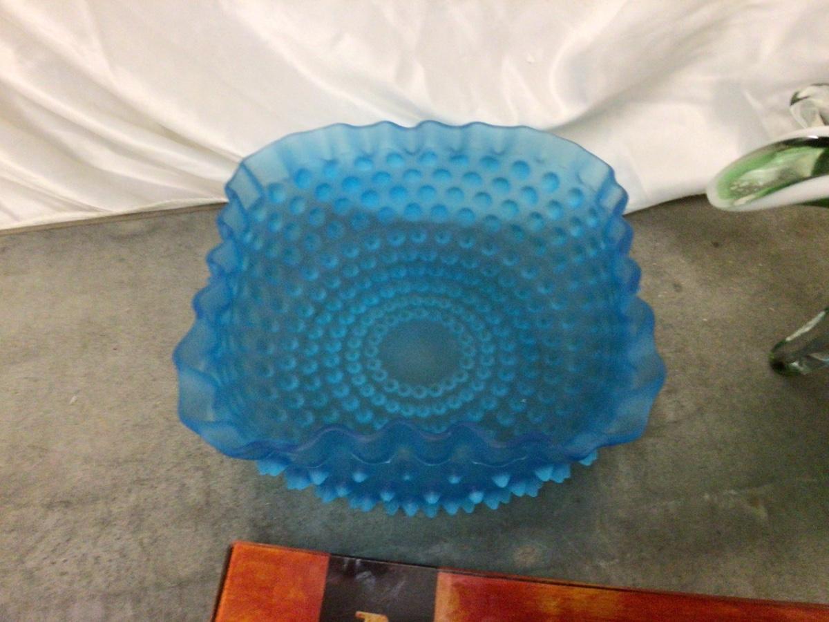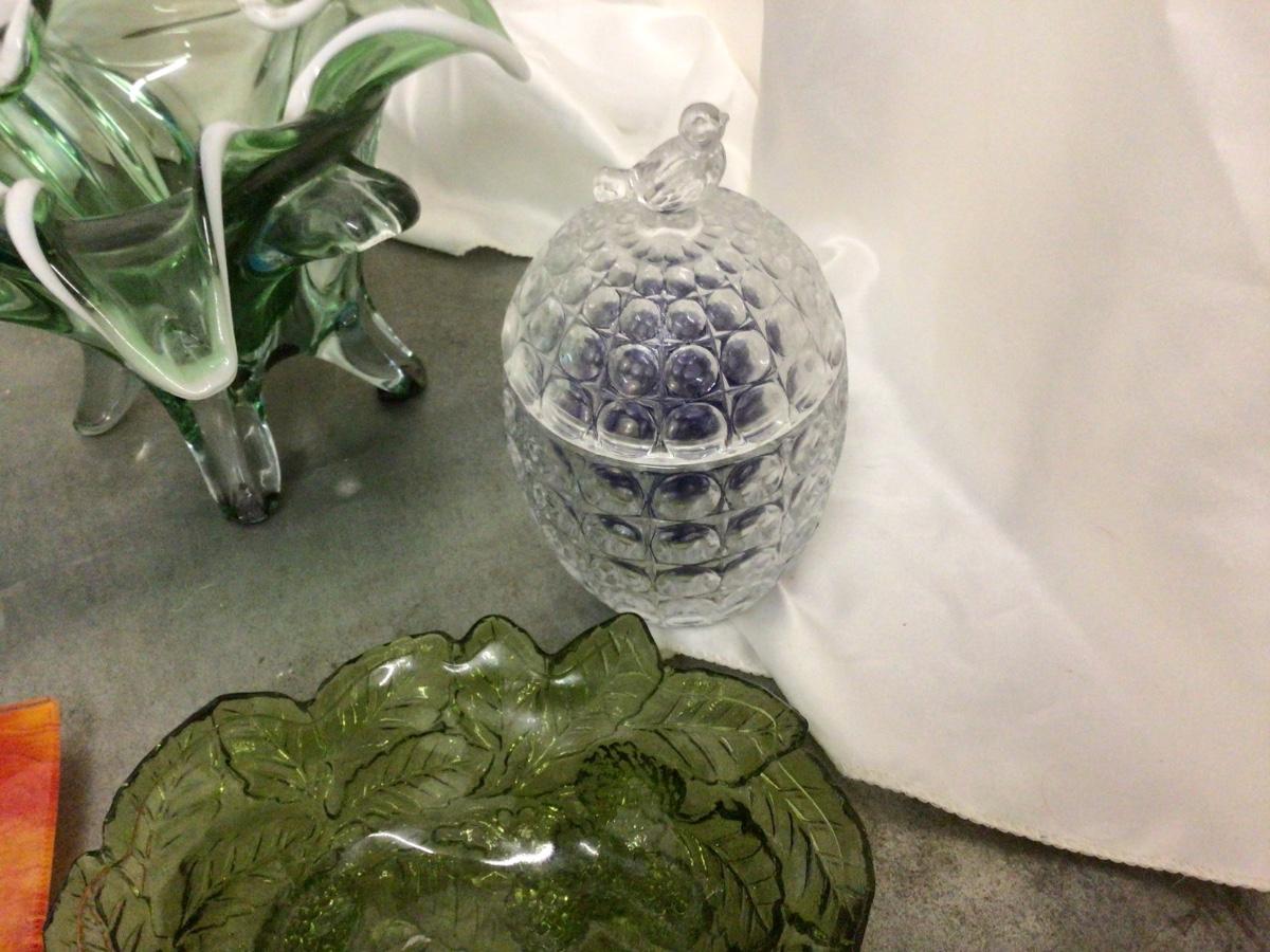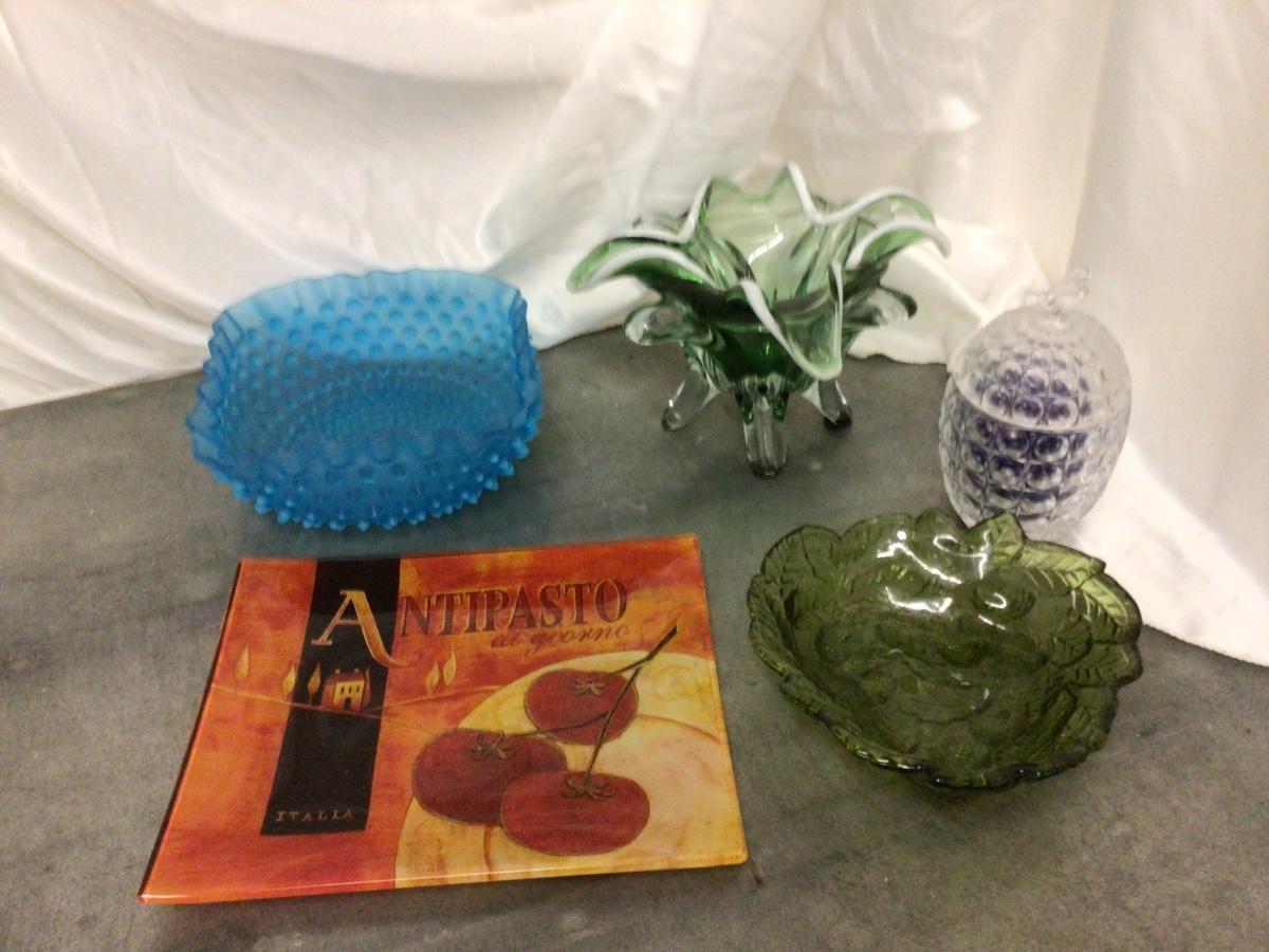 You get a great square bowl satin blue hobnail, green and white footed candy dish, reversed painted Italian glass tray, green glass bowl strawberry pattern and clear glass covered dish with blue stones. Bird on lid oc covered dish.
