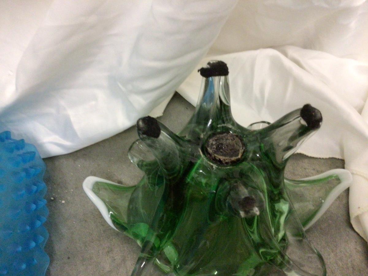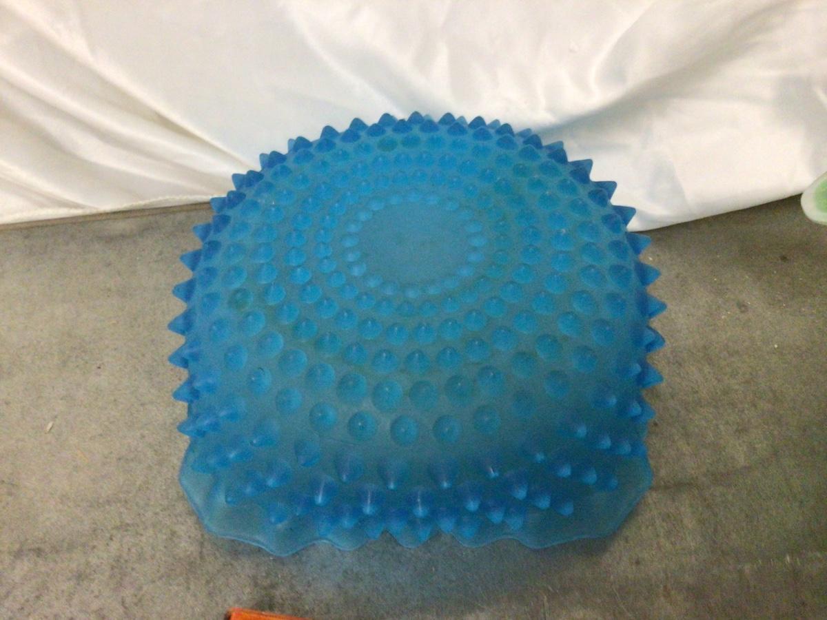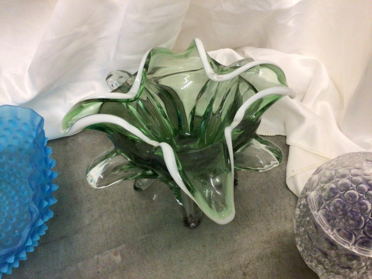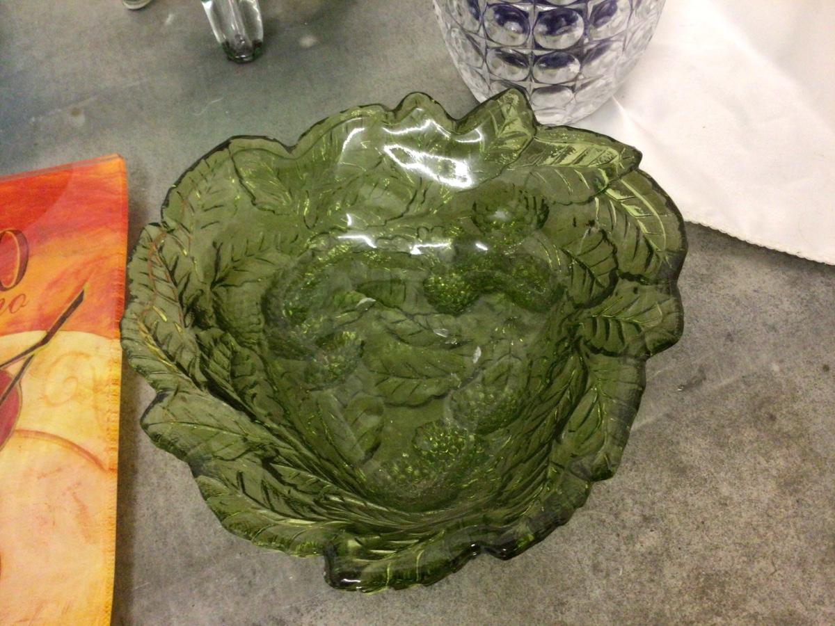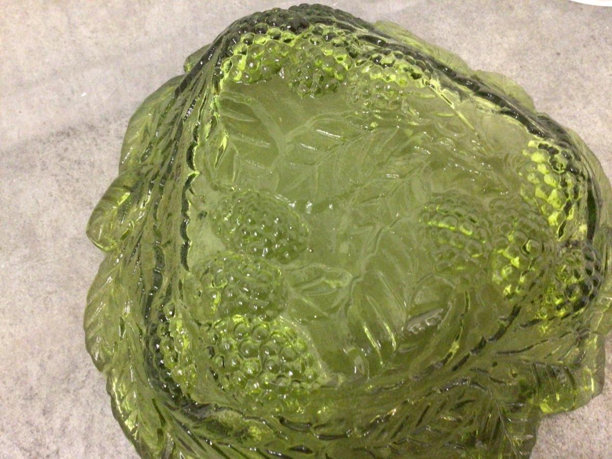 You get a great square bowl satin blue hobnail, green and white footed candy dish, reversed painted Italian glass tray, green glass bowl strawberry pattern and clear glass covered dish with blue stones. Bird on lid oc covered dish.