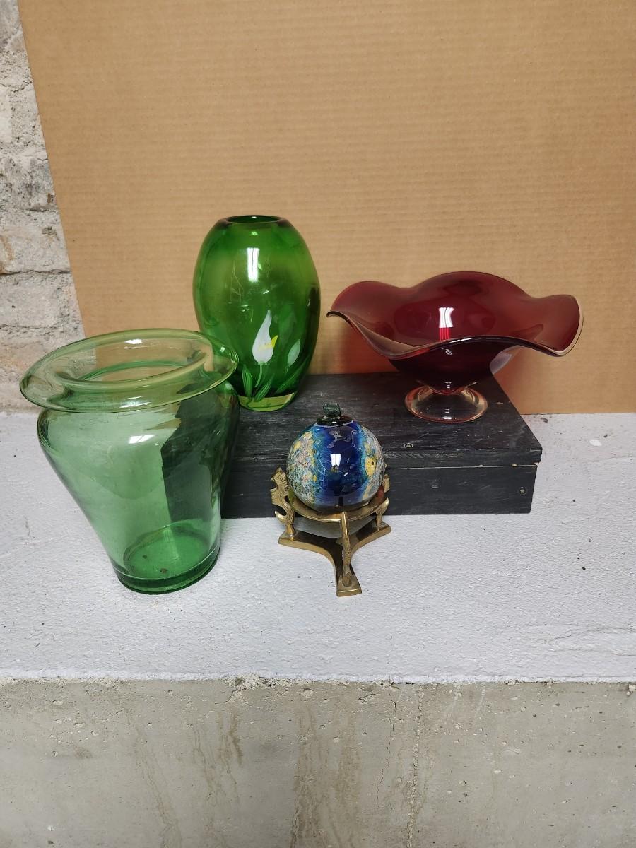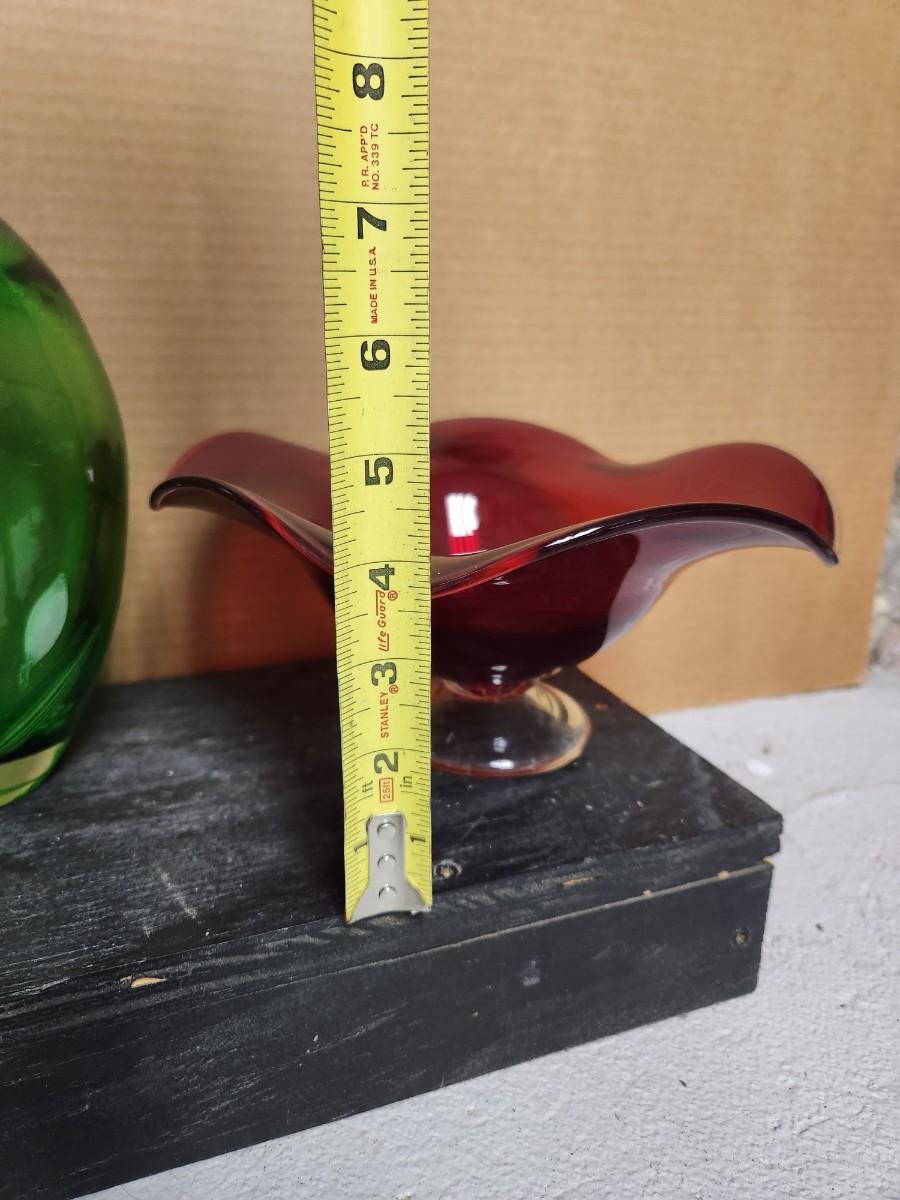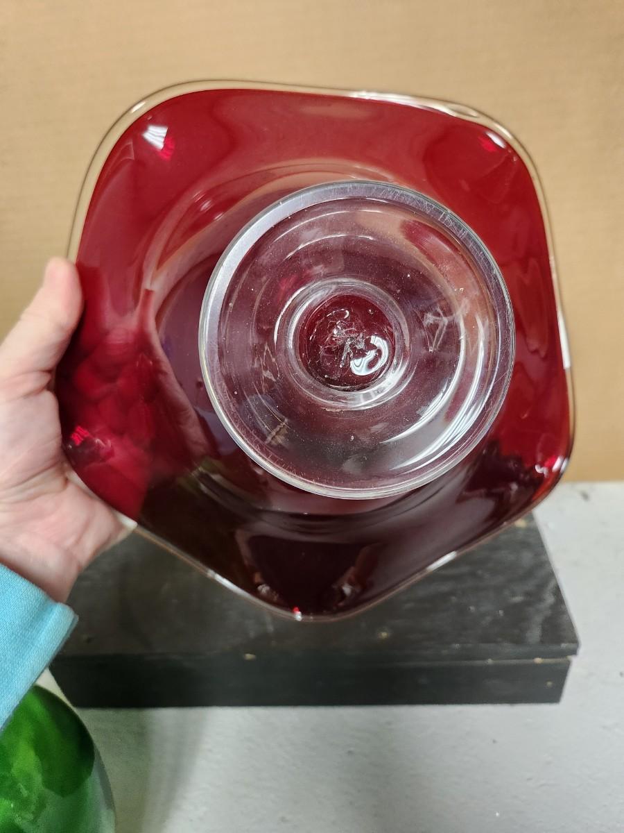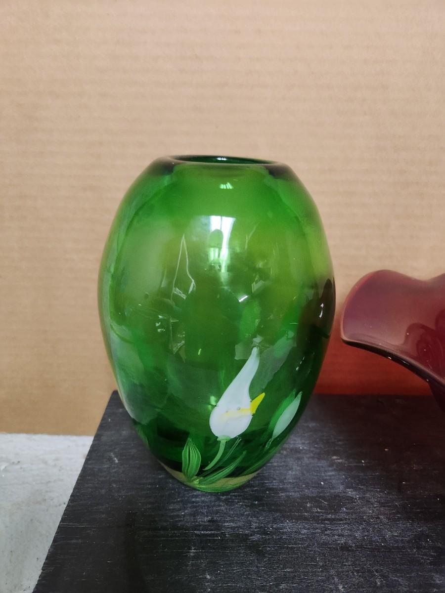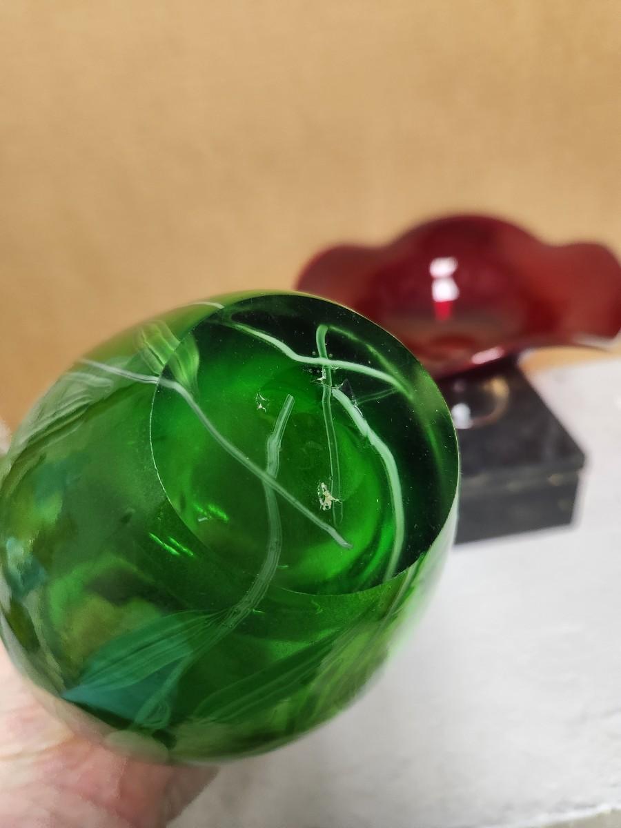 Green rolled lip vase, red footed console bowl, glass ornament and stand and a green blown cala lily vase.