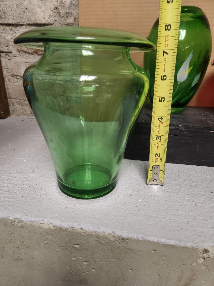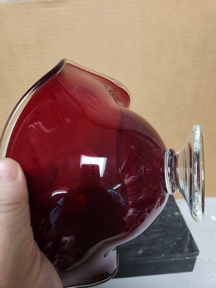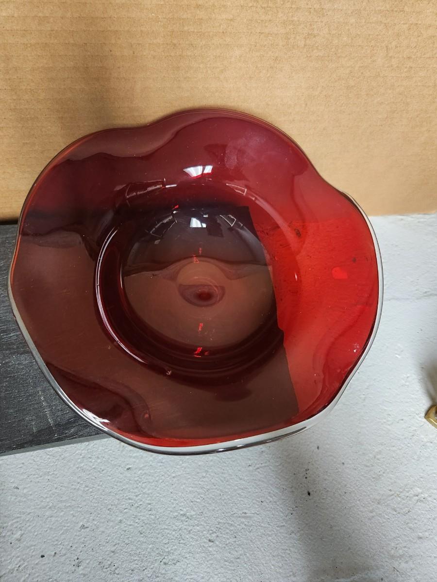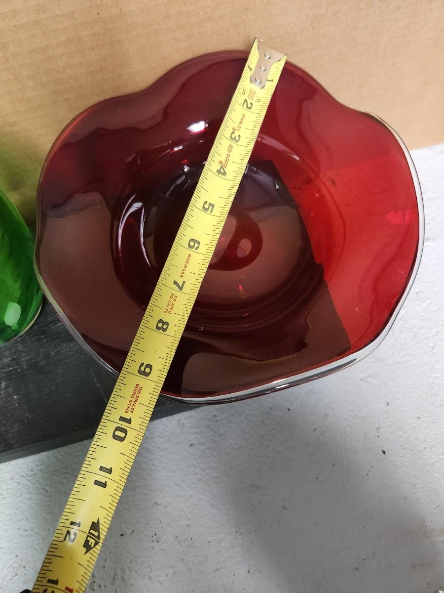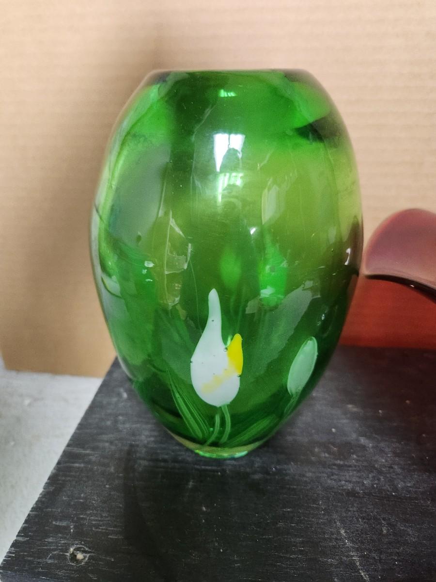 Green rolled lip vase, red footed console bowl, glass ornament and stand and a green blown cala lily vase.
