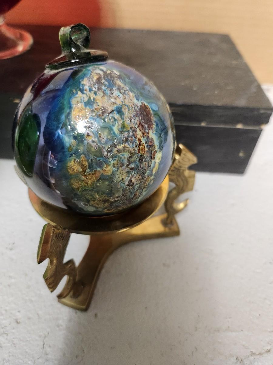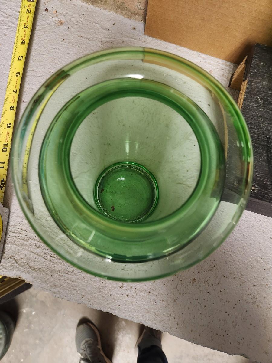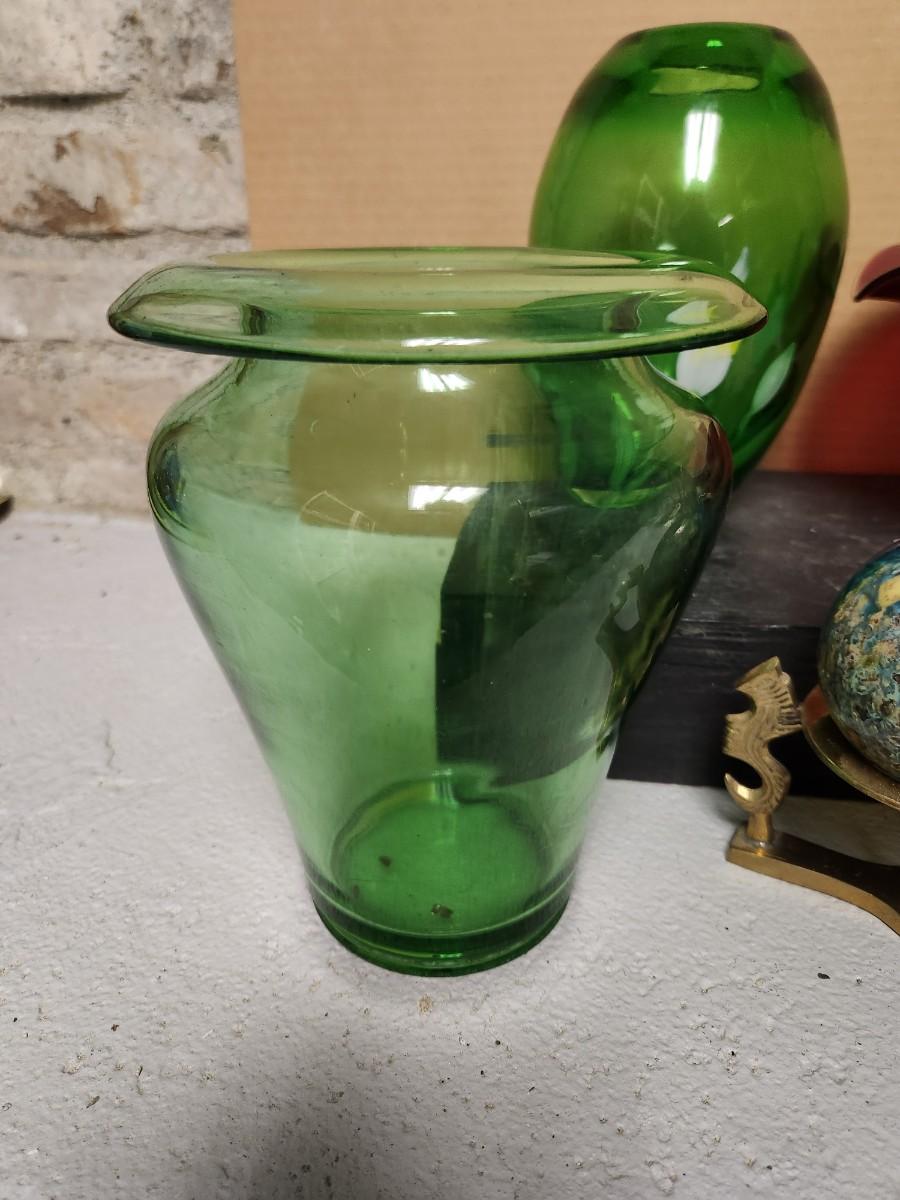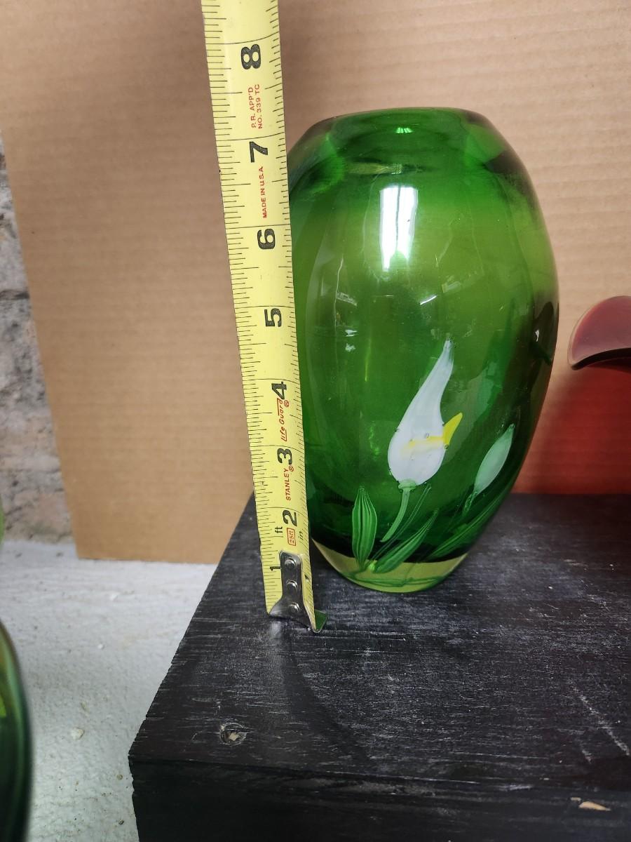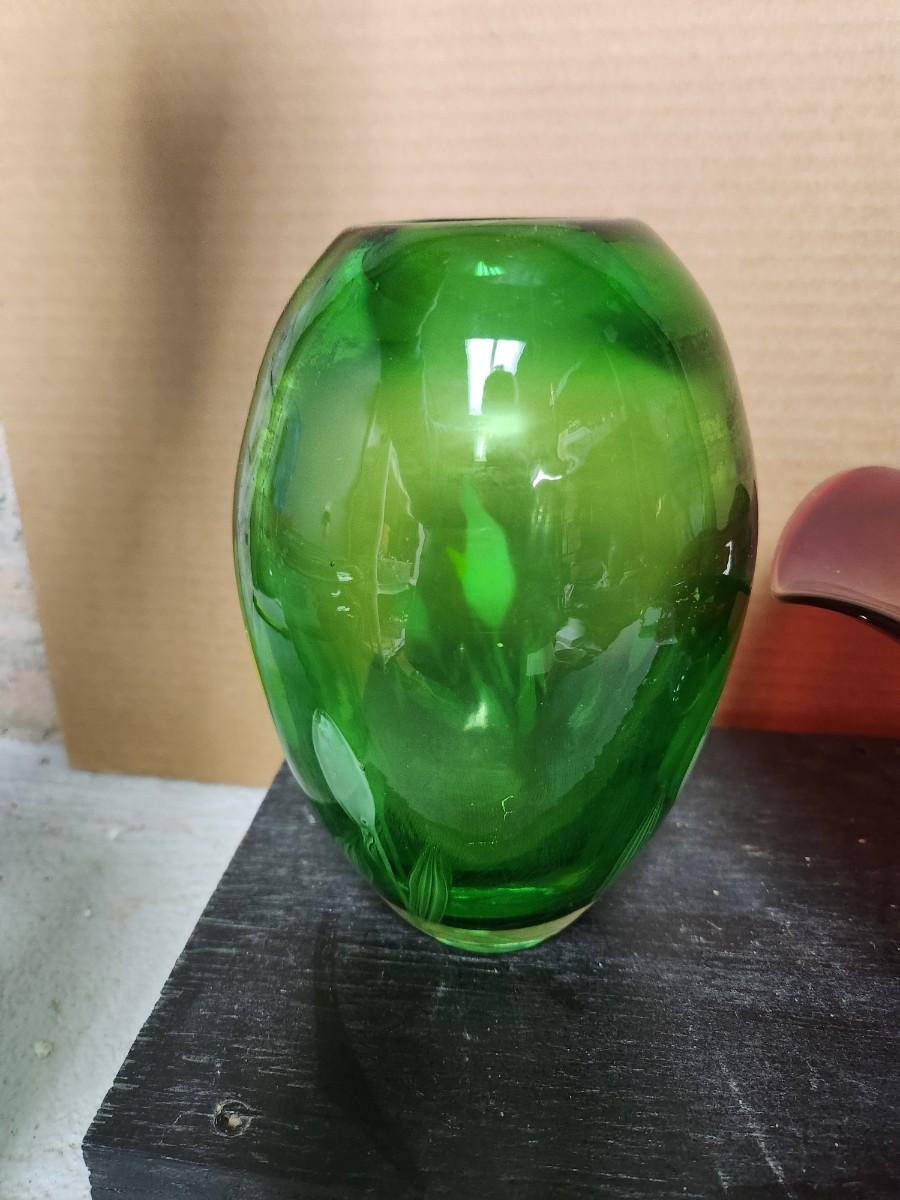 Green rolled lip vase, red footed console bowl, glass ornament and stand and a green blown cala lily vase.