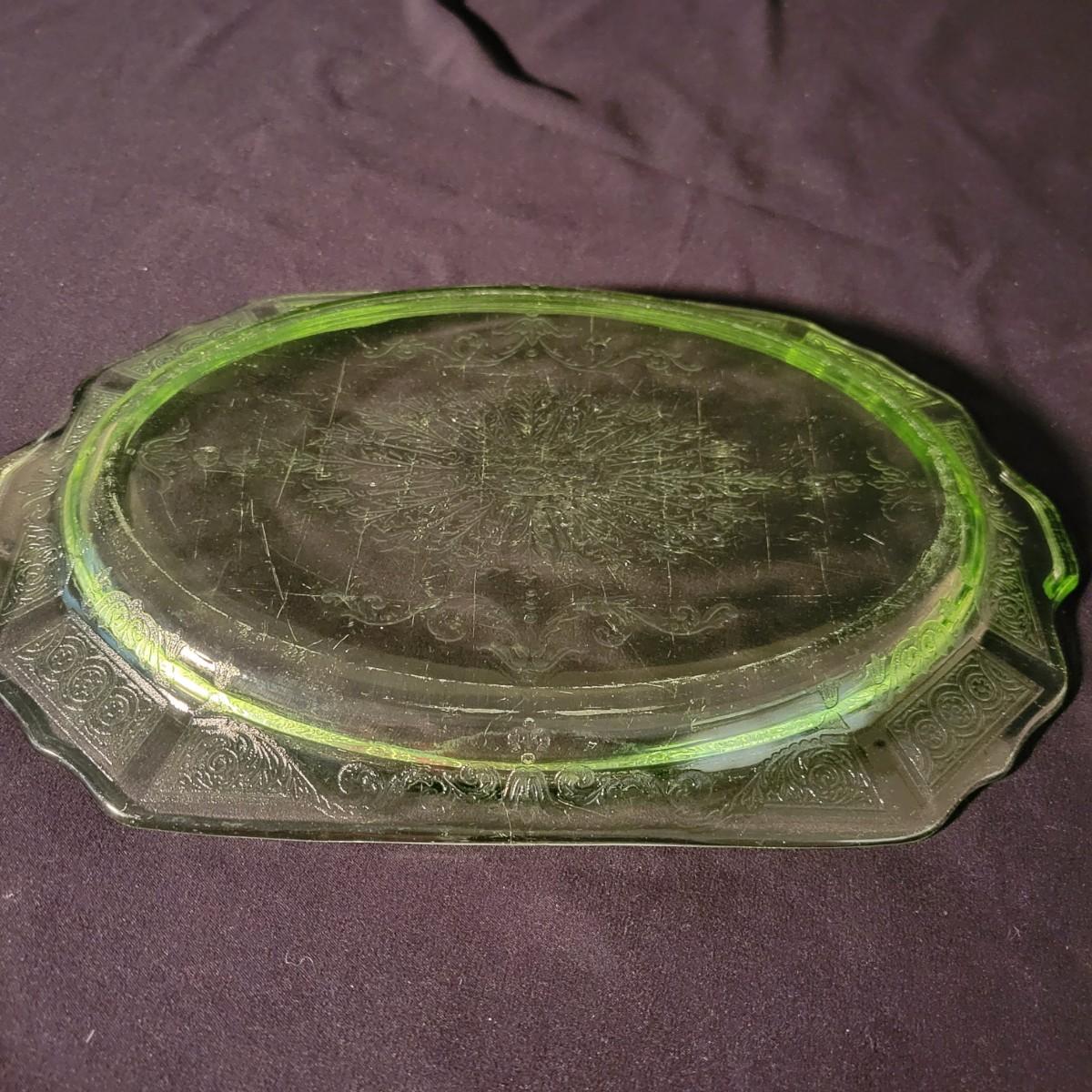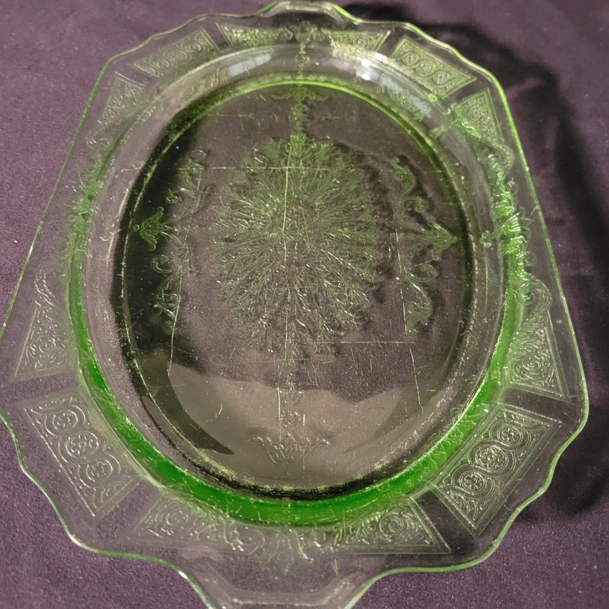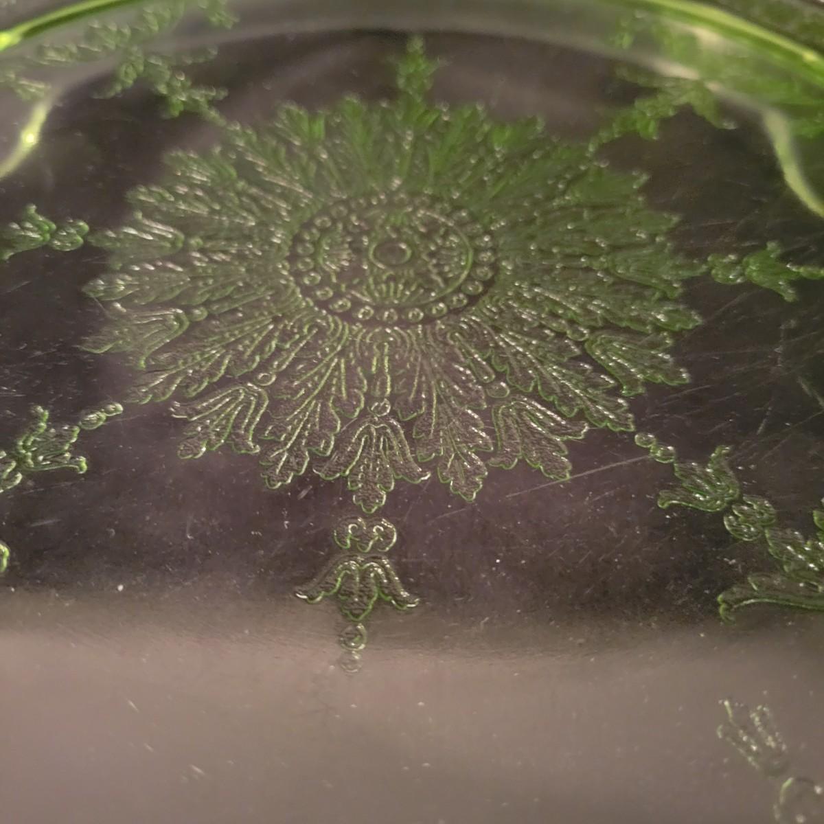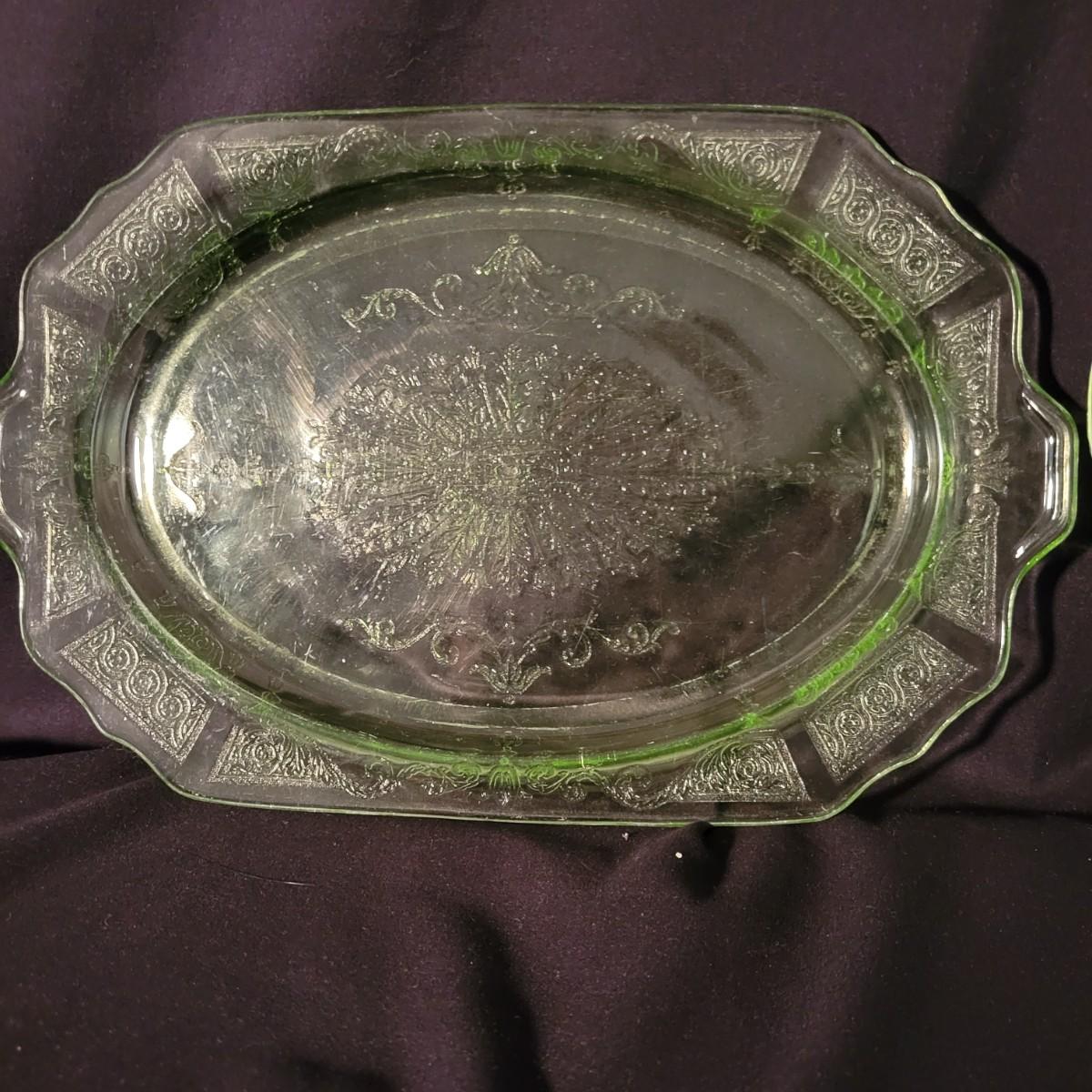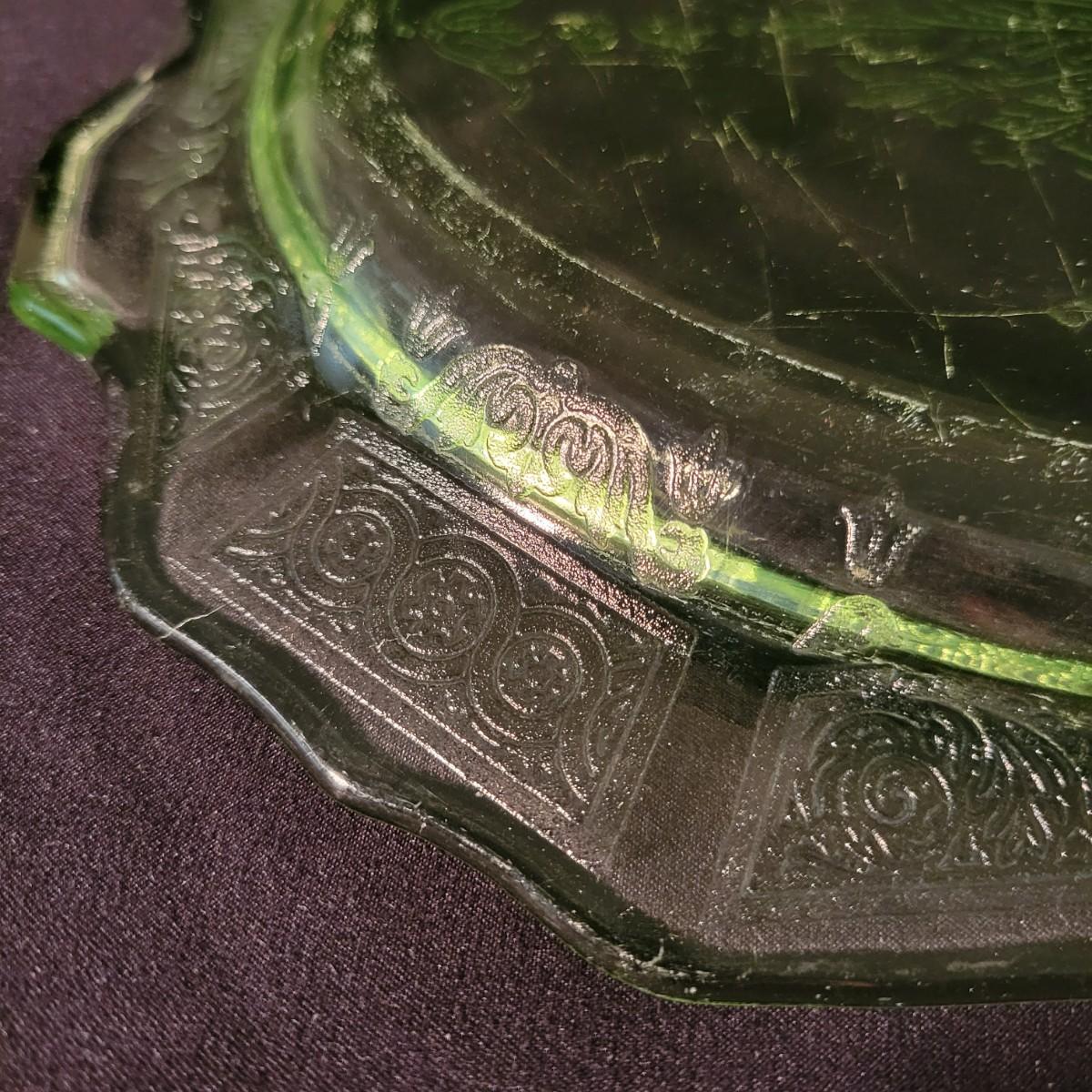 A collection of three colored glass pieces. Included is a light pink, molded glass bowl and two green glass platters with ornate designs. Bowl measures approximately 10" x 3". Item are mostly in good condition, but one platter has a chip on its foot and another has some scratches. Shipping available