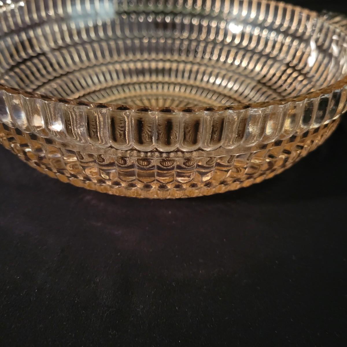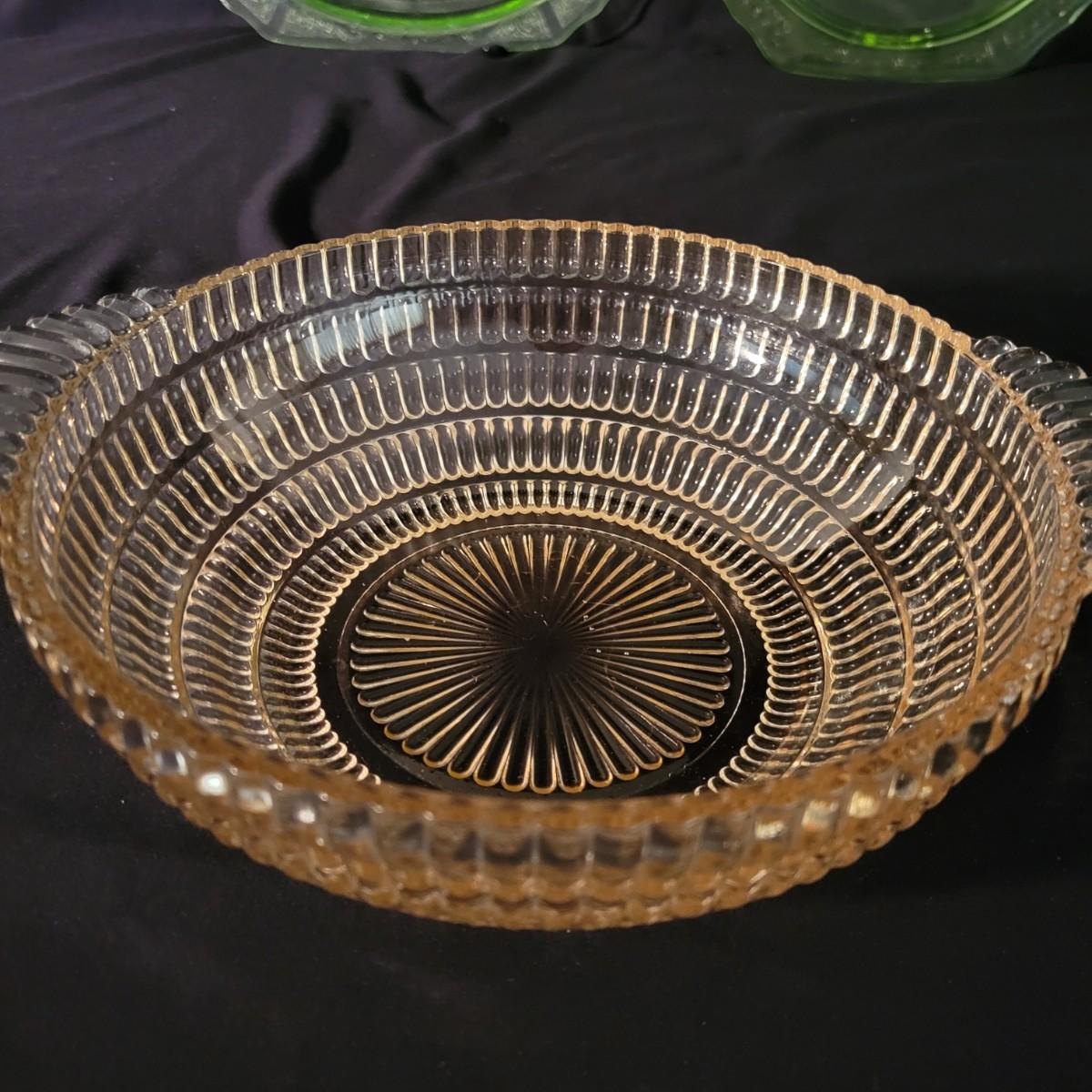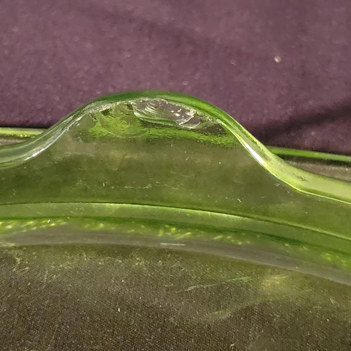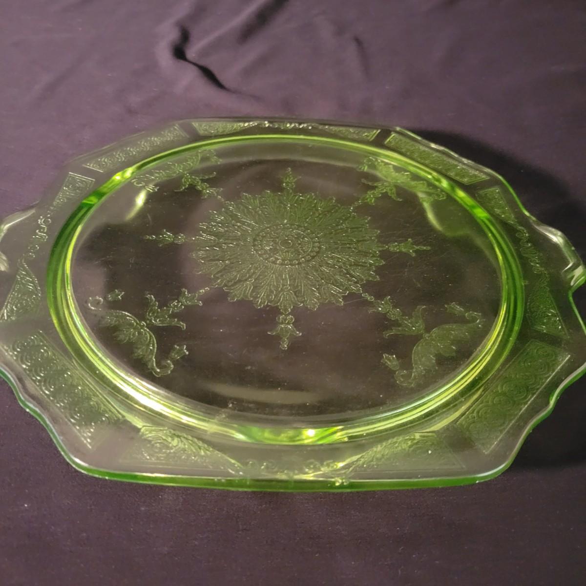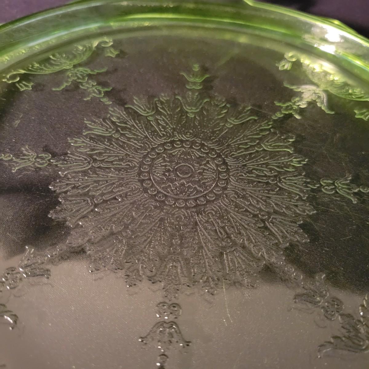 A collection of three colored glass pieces. Included is a light pink, molded glass bowl and two green glass platters with ornate designs. Bowl measures approximately 10" x 3". Item are mostly in good condition, but one platter has a chip on its foot and another has some scratches. Shipping available