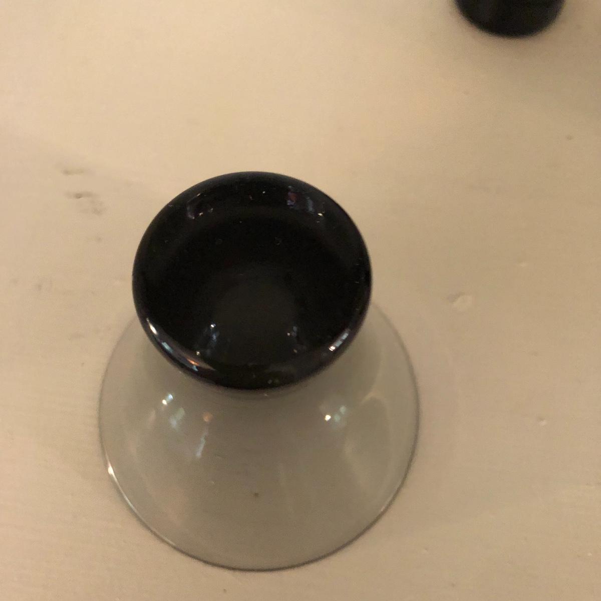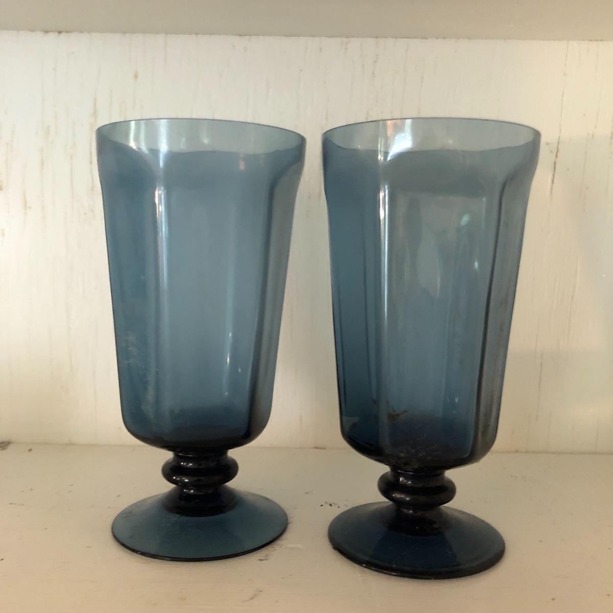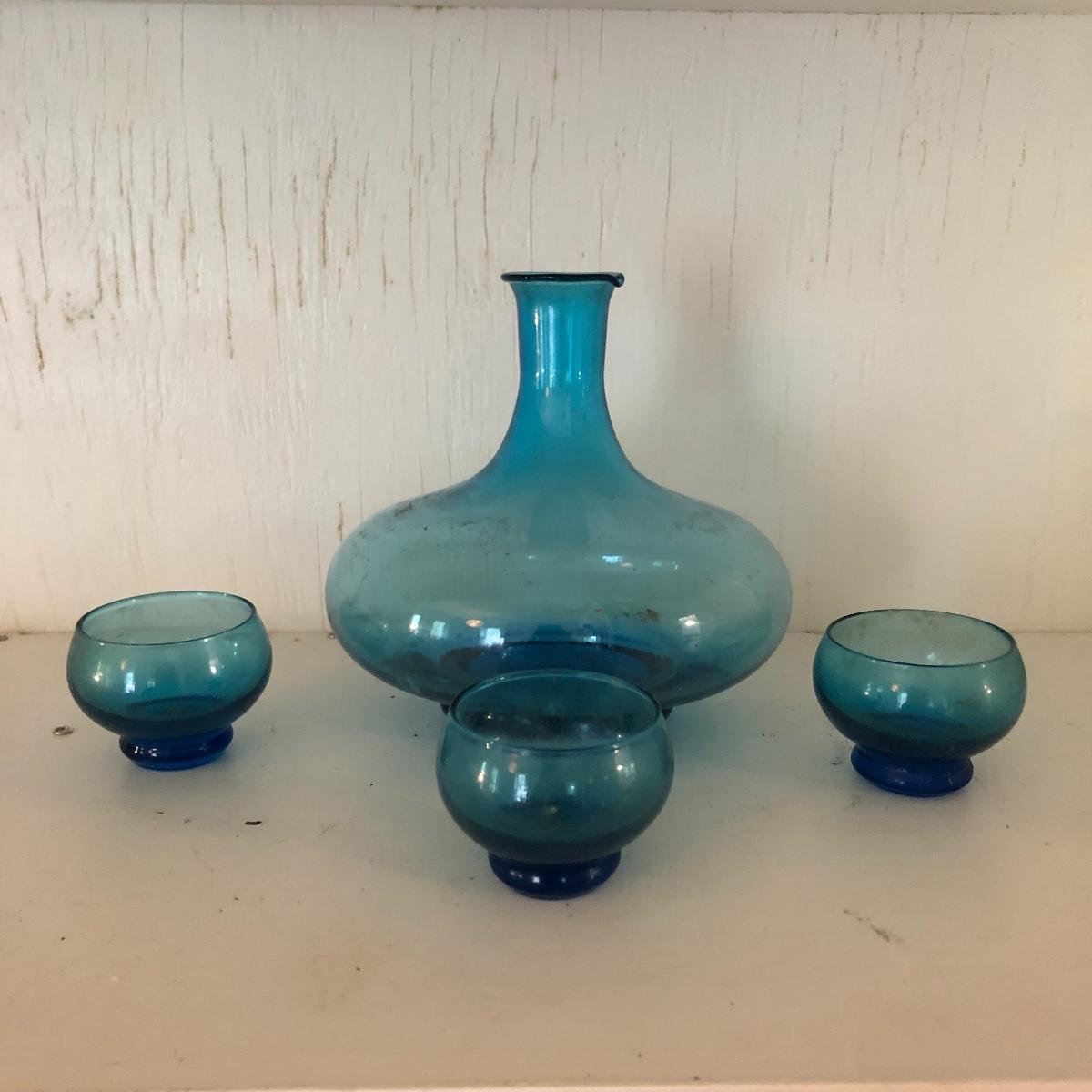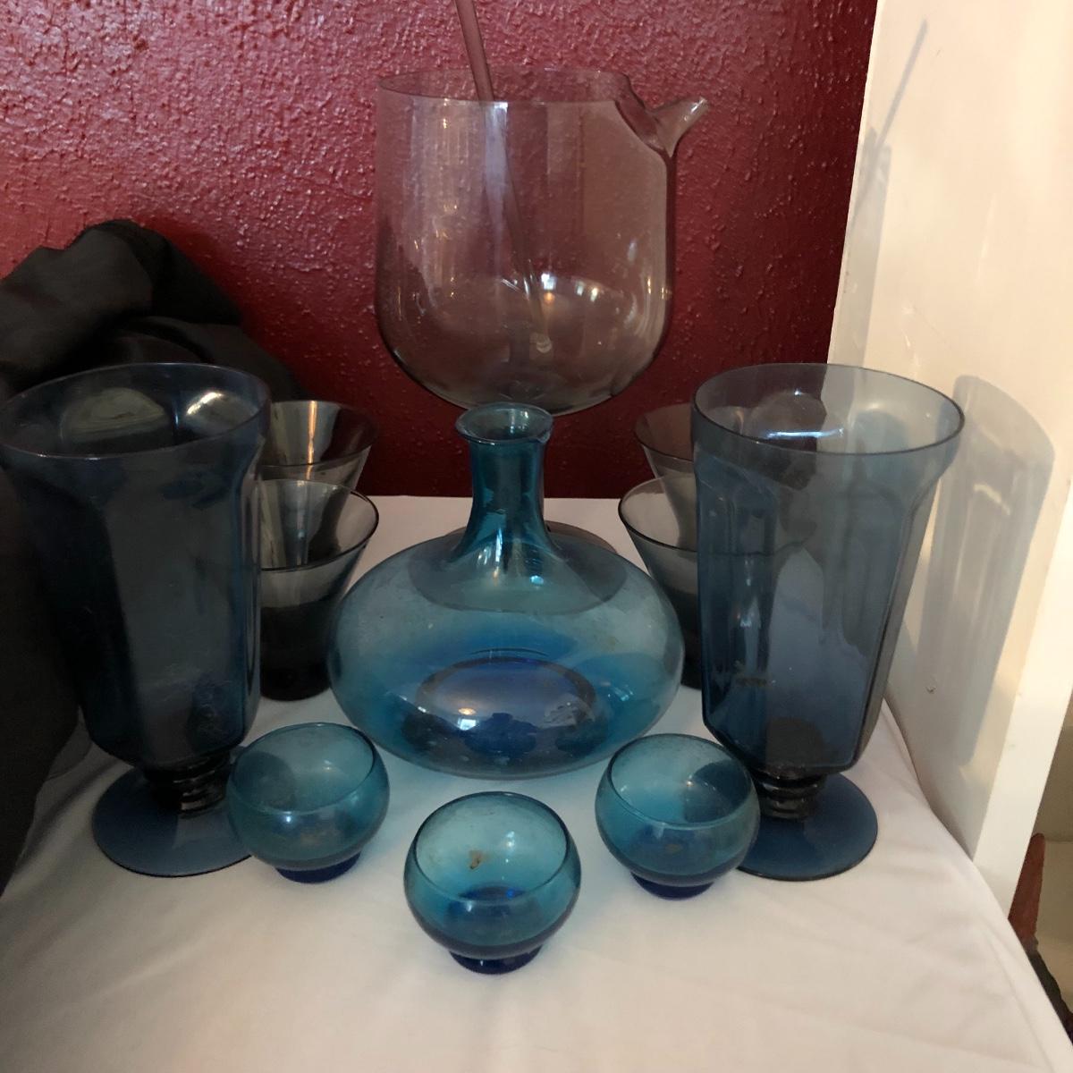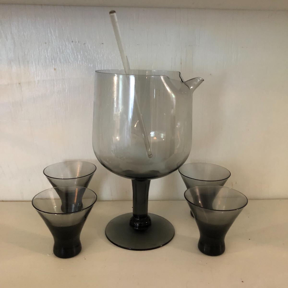 Lot includes stemmed pitcher with glass stir stick and four matching glasses, decanter with three matching glasses and two stemmed glasses. . Pitcher measures 5.25”D x 20” tall.