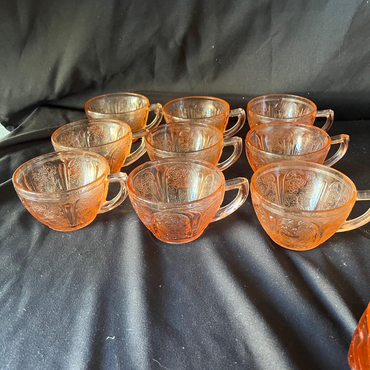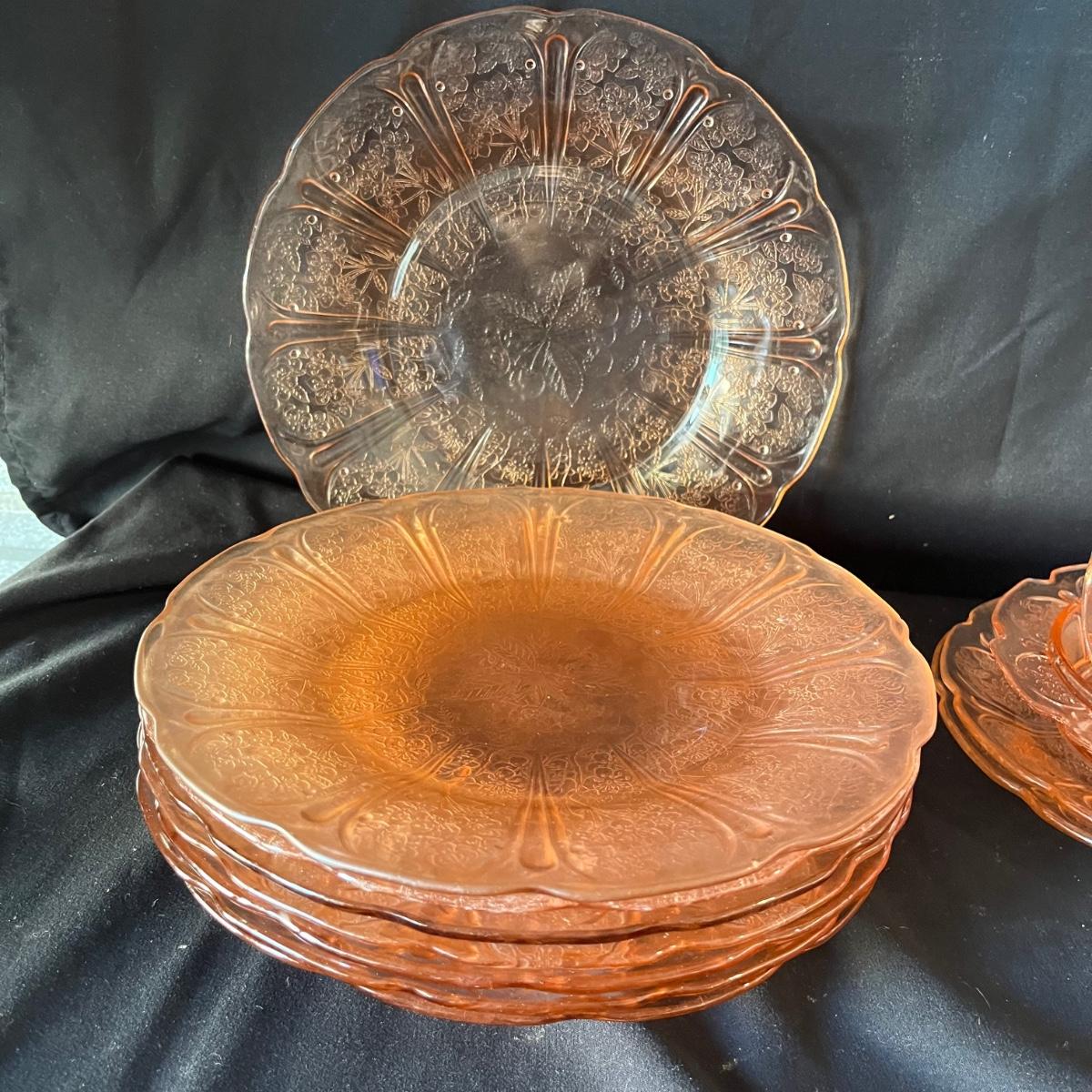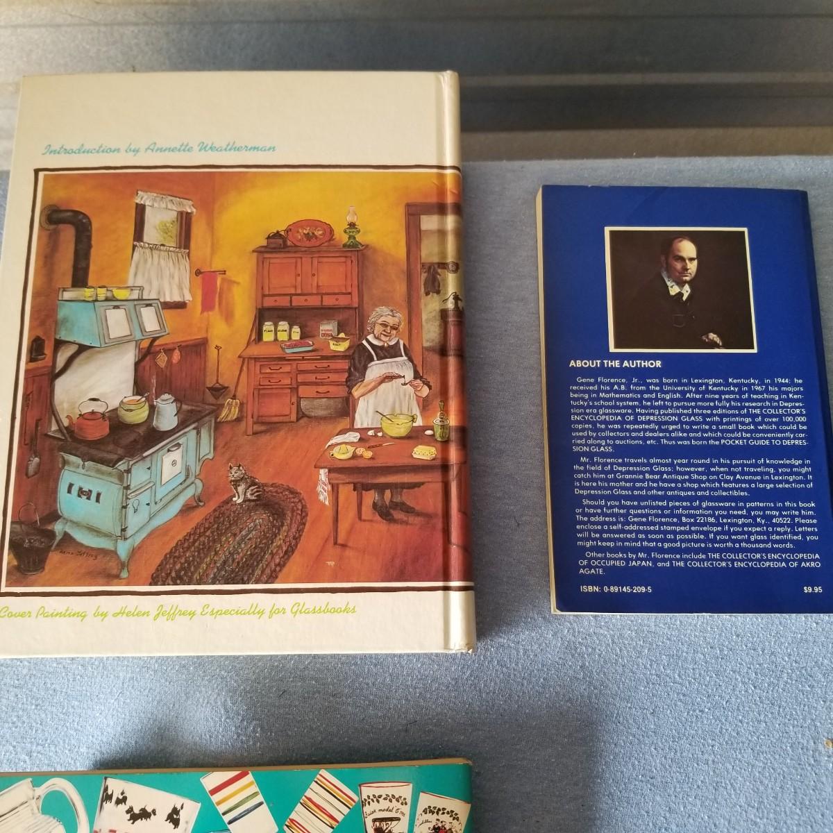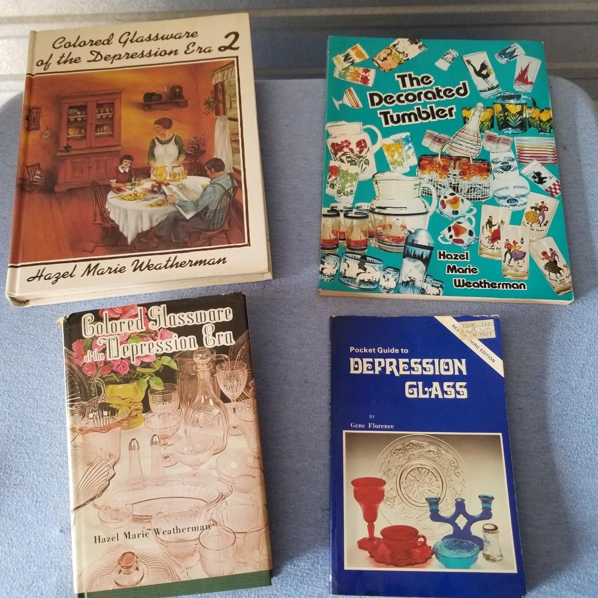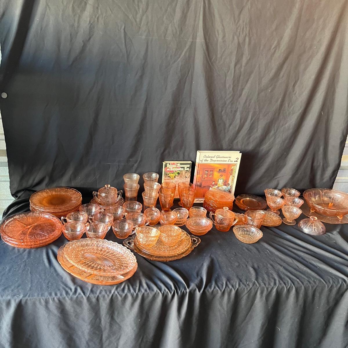 Lot contains a large amount of colored glass including 8 teacups, 8 dinner plates, five dessert dishes, six coasters, 12 saucers, large bowl, four serving plates sugar bowl, creamer, six glasses and more assorted pieces. Largest plate measures 11.5” D. Also includes four reference books related to Depression Era glassware.