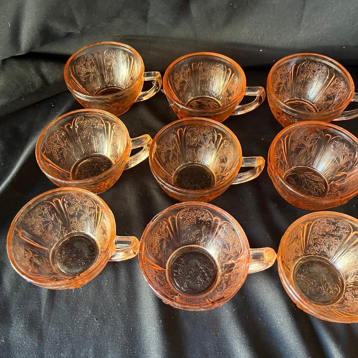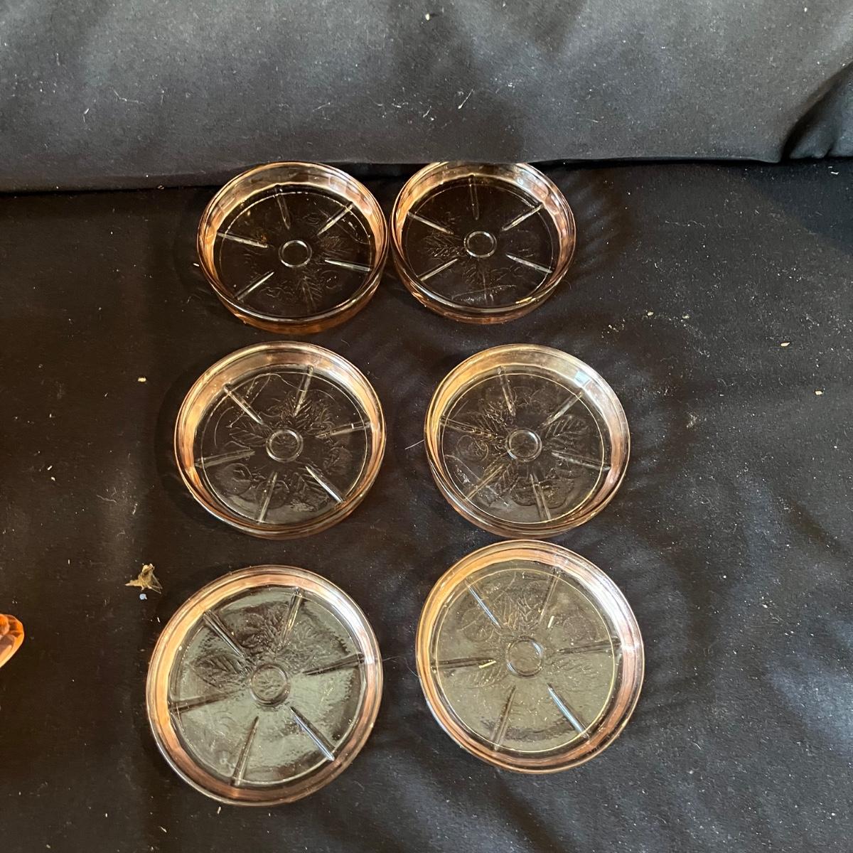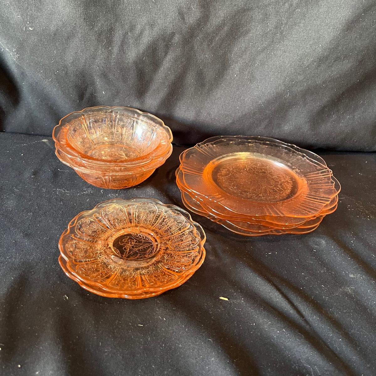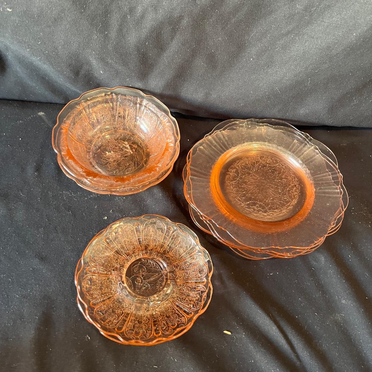 Lot contains a large amount of colored glass including 8 teacups, 8 dinner plates, five dessert dishes, six coasters, 12 saucers, large bowl, four serving plates sugar bowl, creamer, six glasses and more assorted pieces. Largest plate measures 11.5” D. Also includes four reference books related to Depression Era glassware.