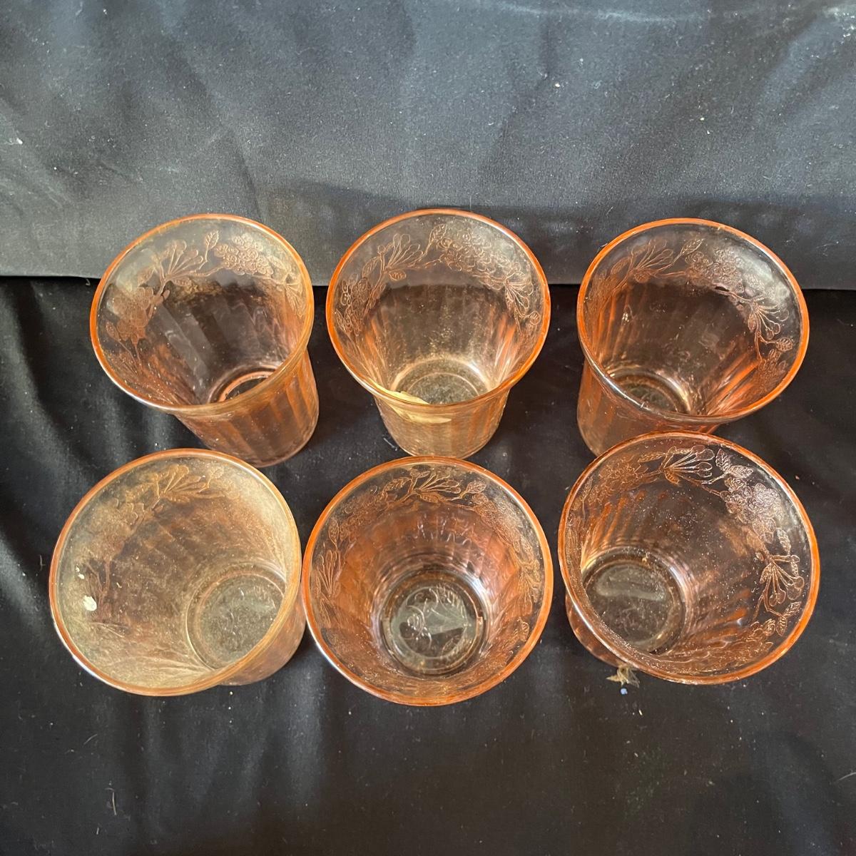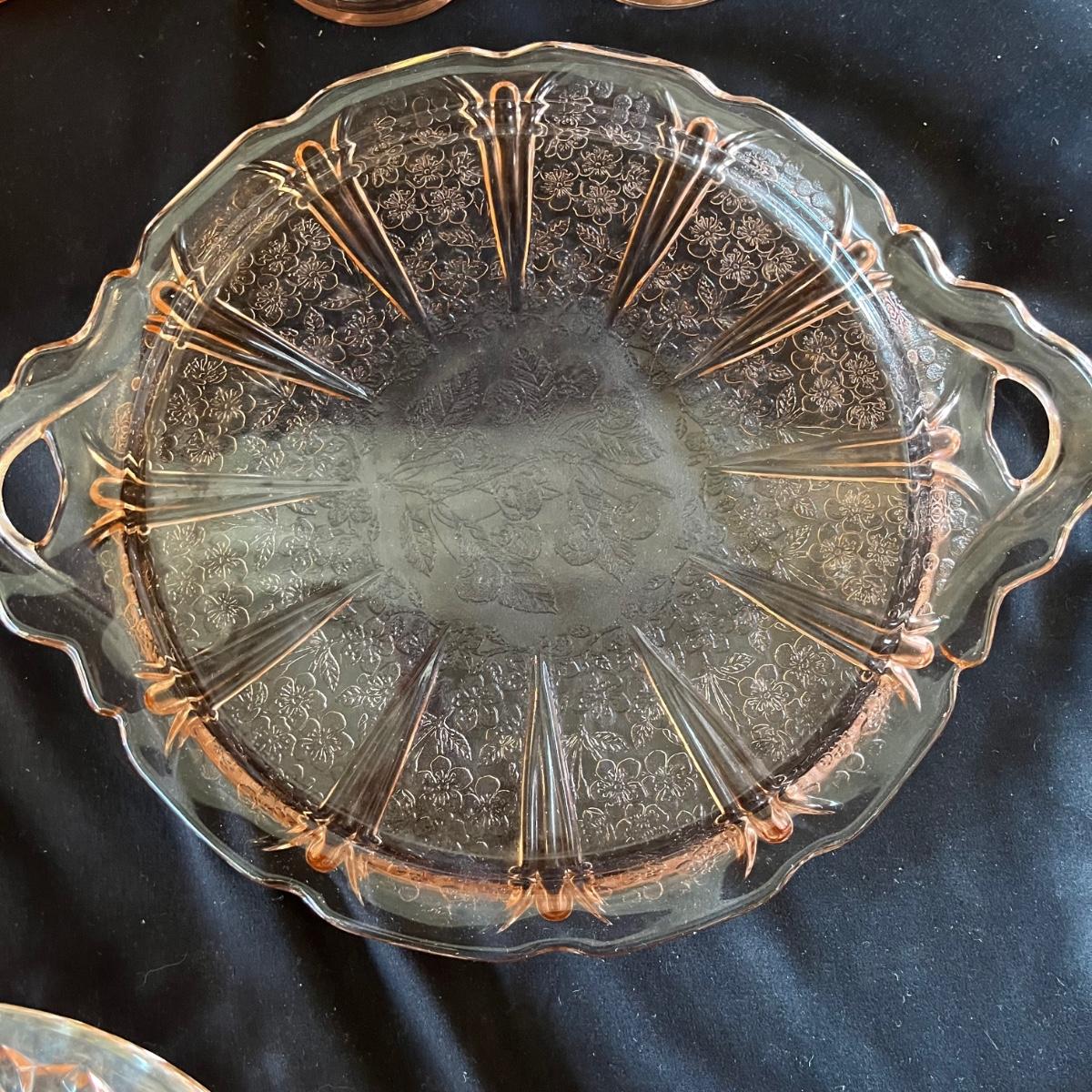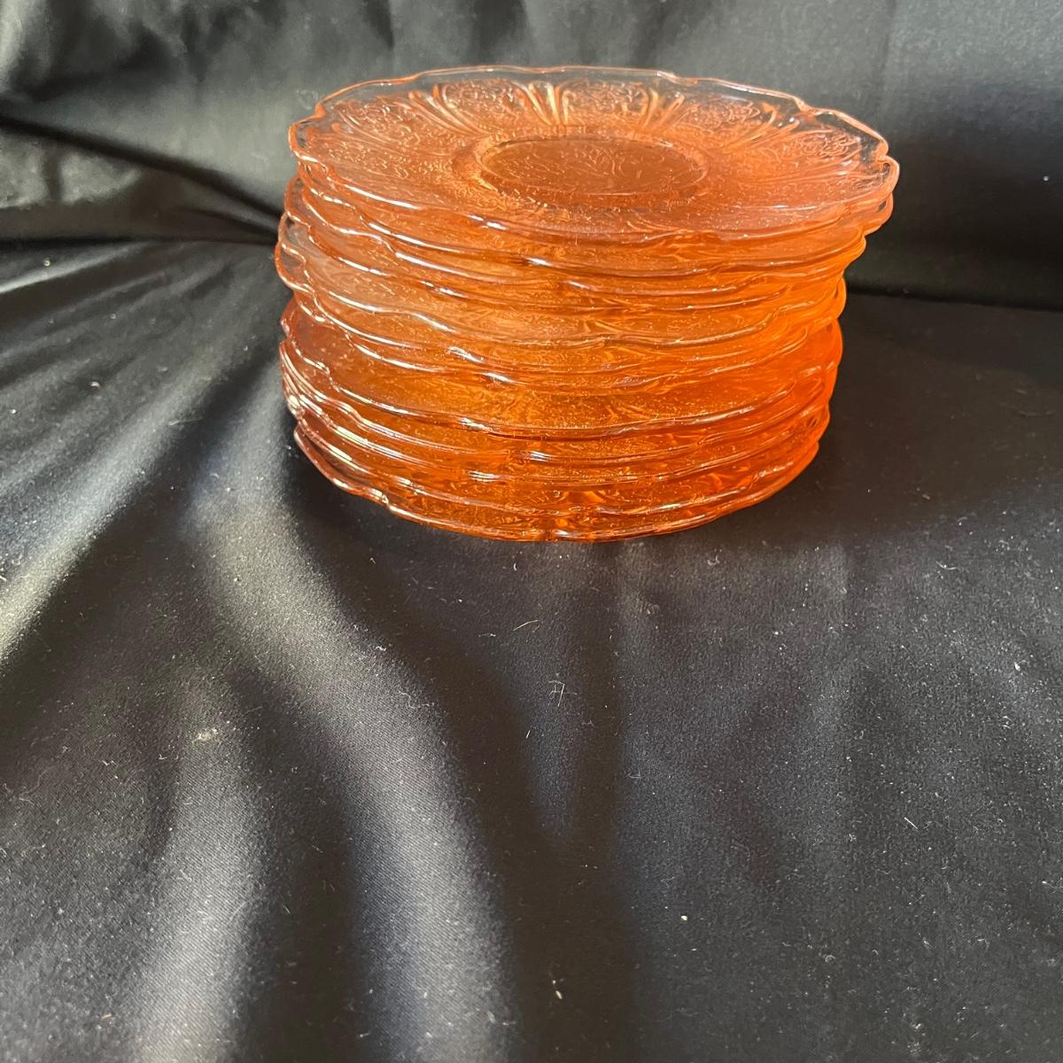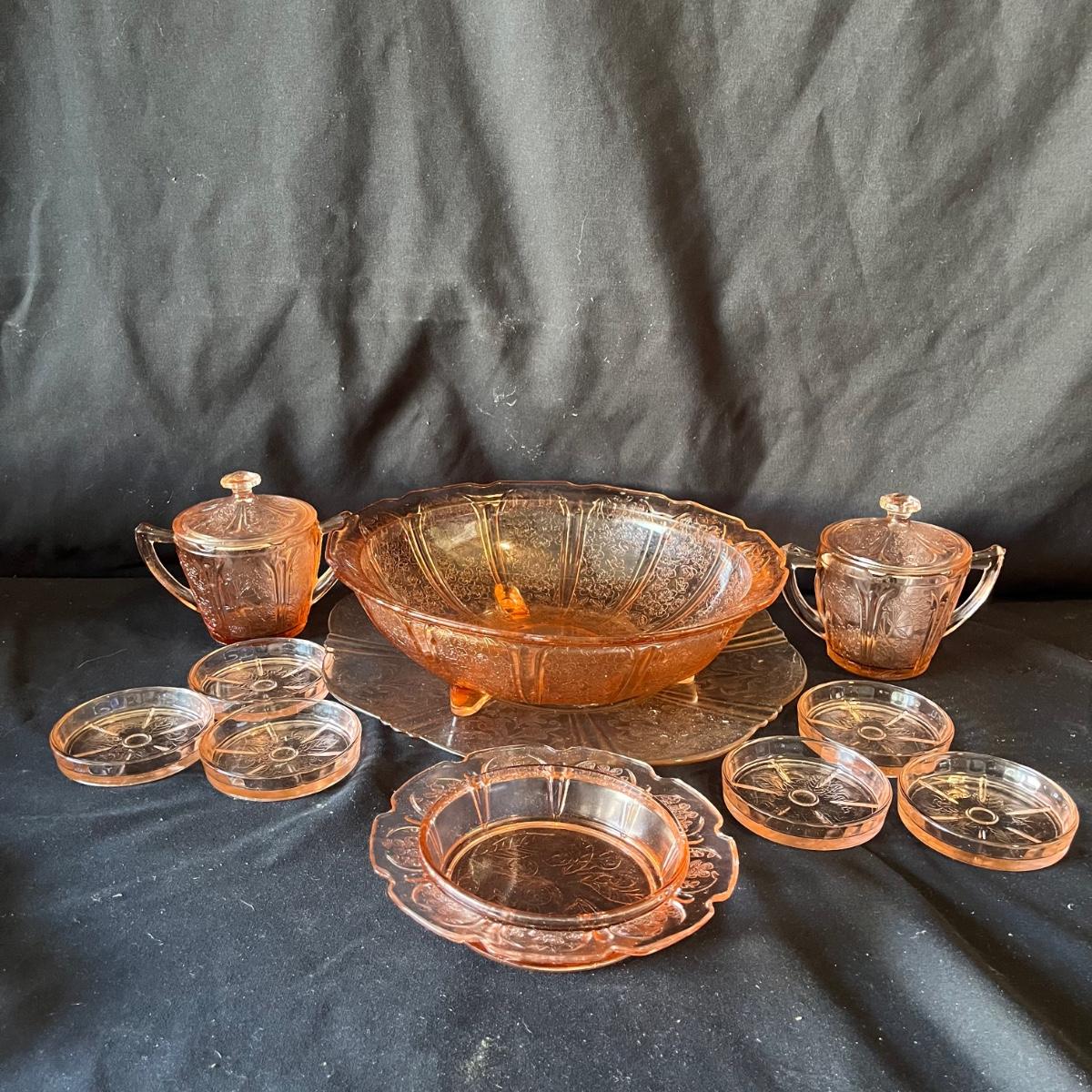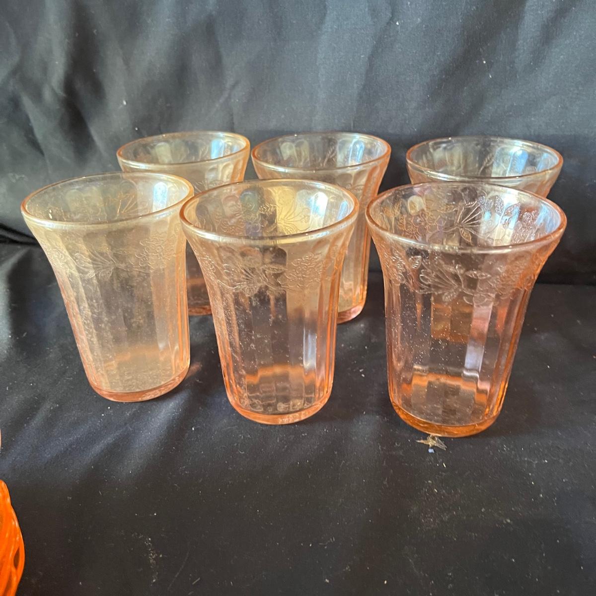 Lot contains a large amount of colored glass including 8 teacups, 8 dinner plates, five dessert dishes, six coasters, 12 saucers, large bowl, four serving plates sugar bowl, creamer, six glasses and more assorted pieces. Largest plate measures 11.5” D. Also includes four reference books related to Depression Era glassware.