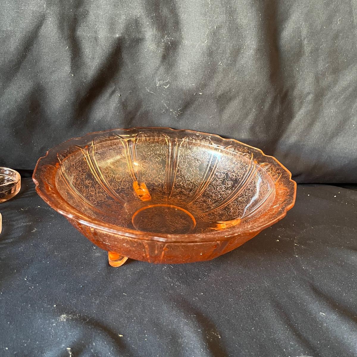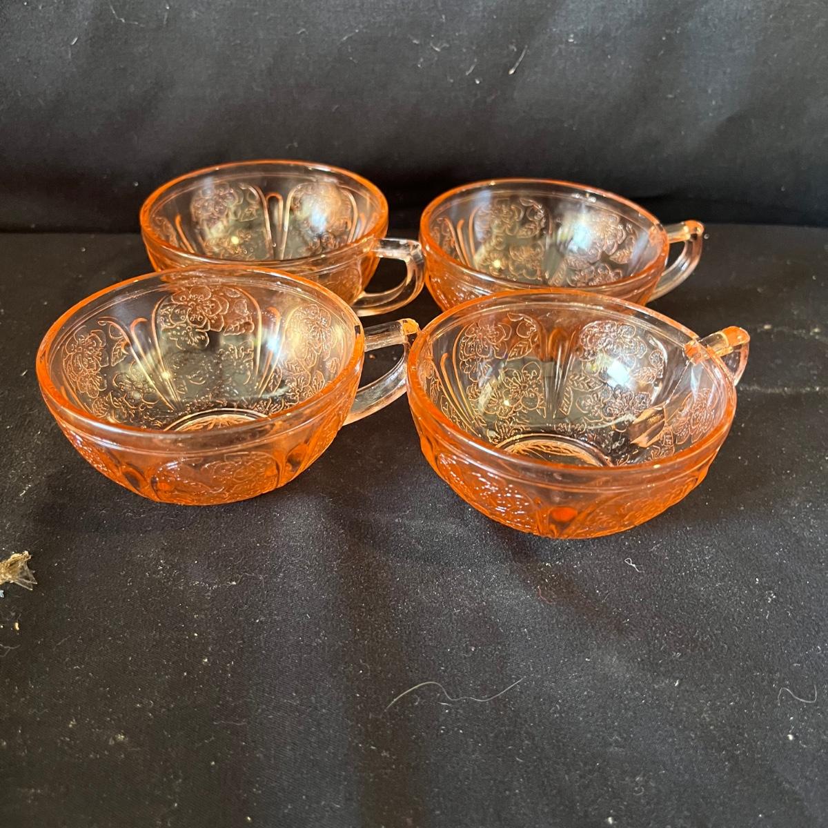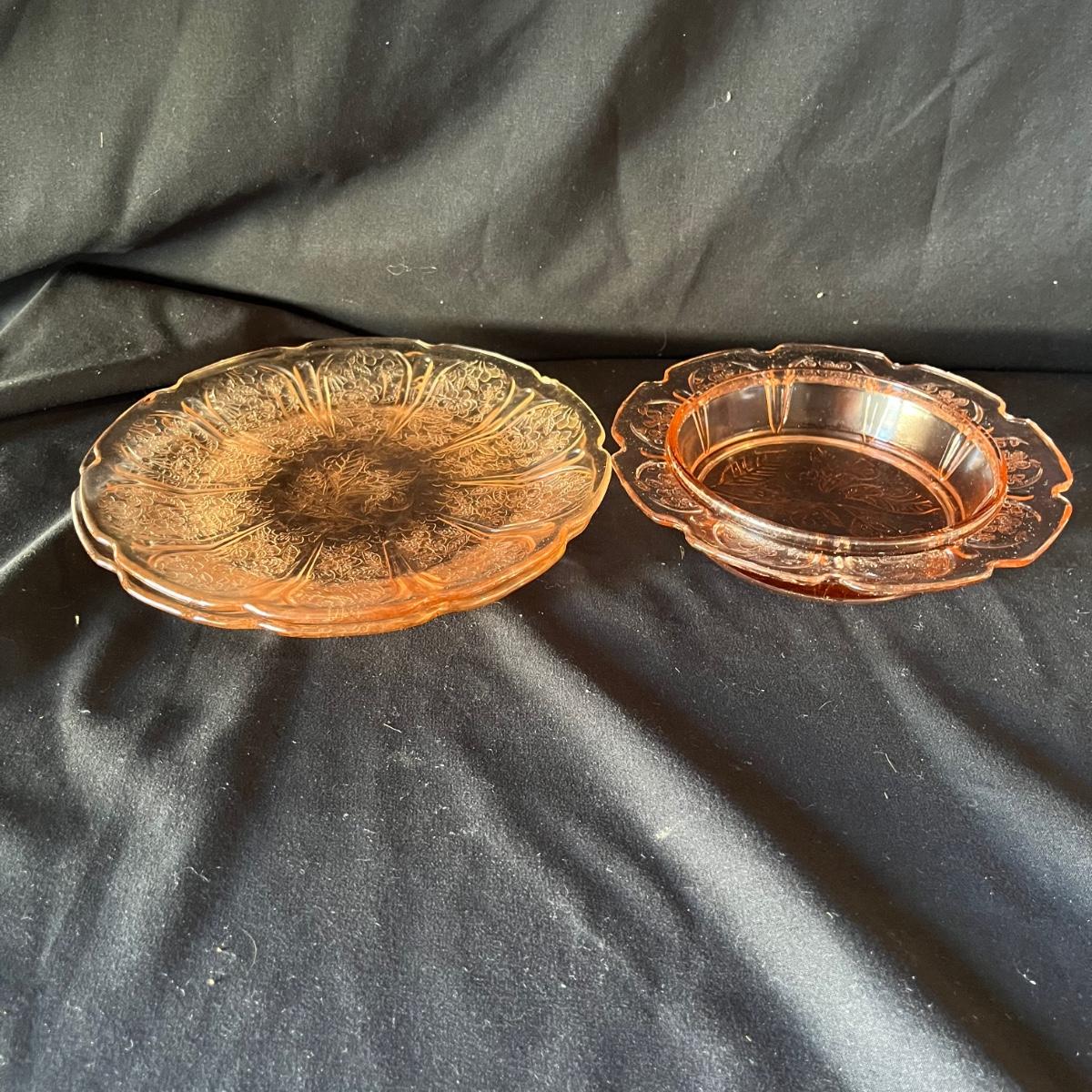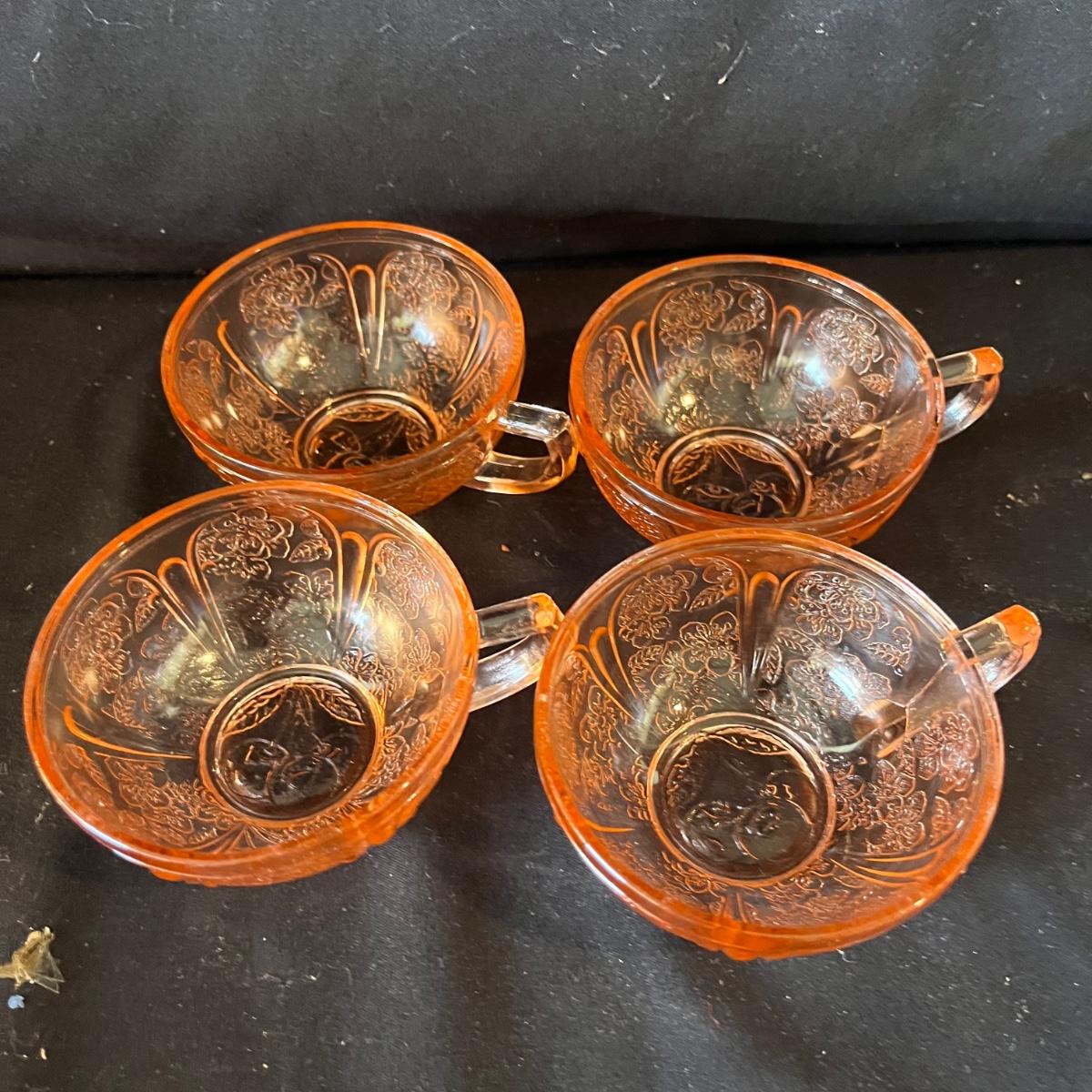 Lot contains a large amount of colored glass including 8 teacups, 8 dinner plates, five dessert dishes, six coasters, 12 saucers, large bowl, four serving plates sugar bowl, creamer, six glasses and more assorted pieces. Largest plate measures 11.5” D. Also includes four reference books related to Depression Era glassware.