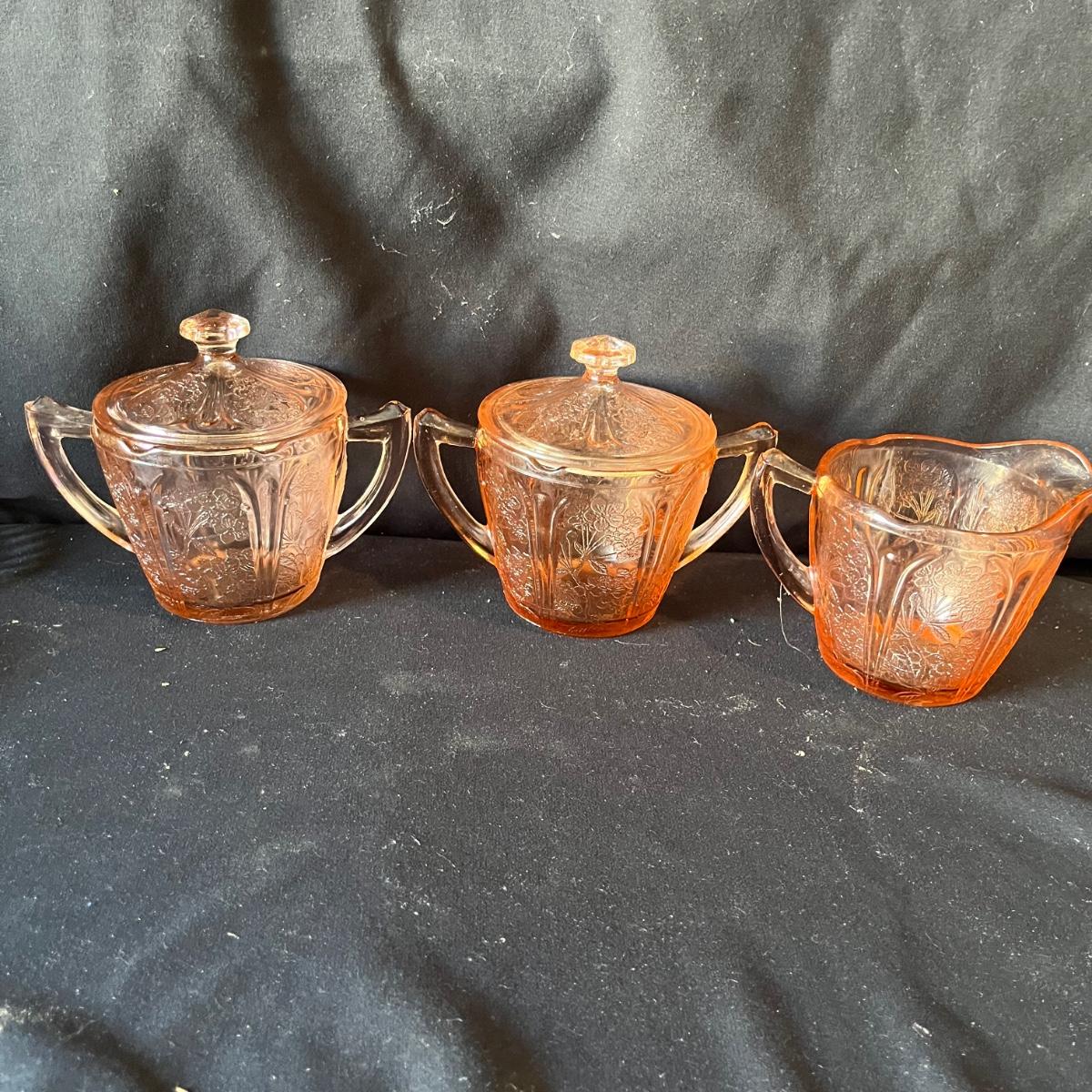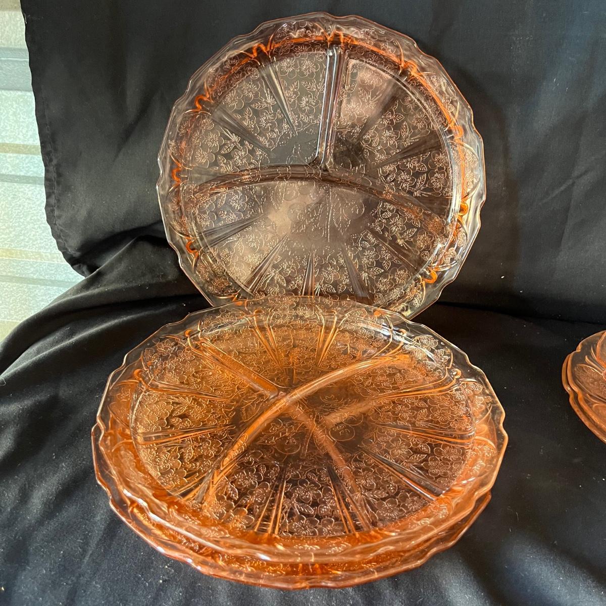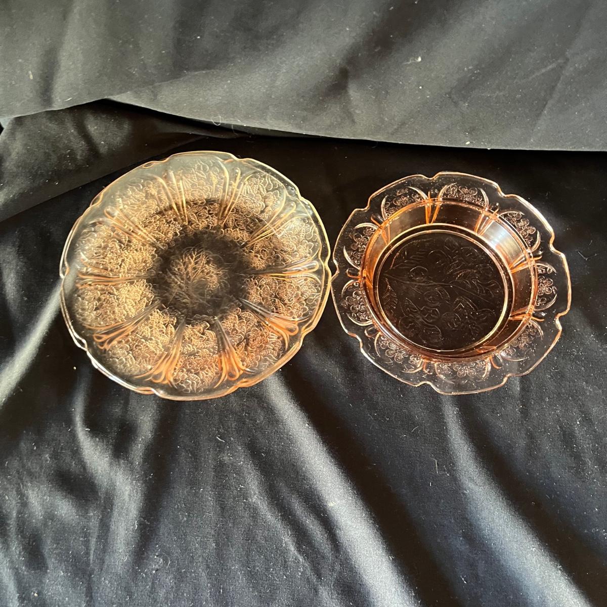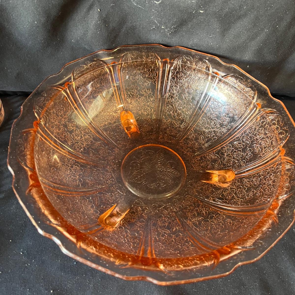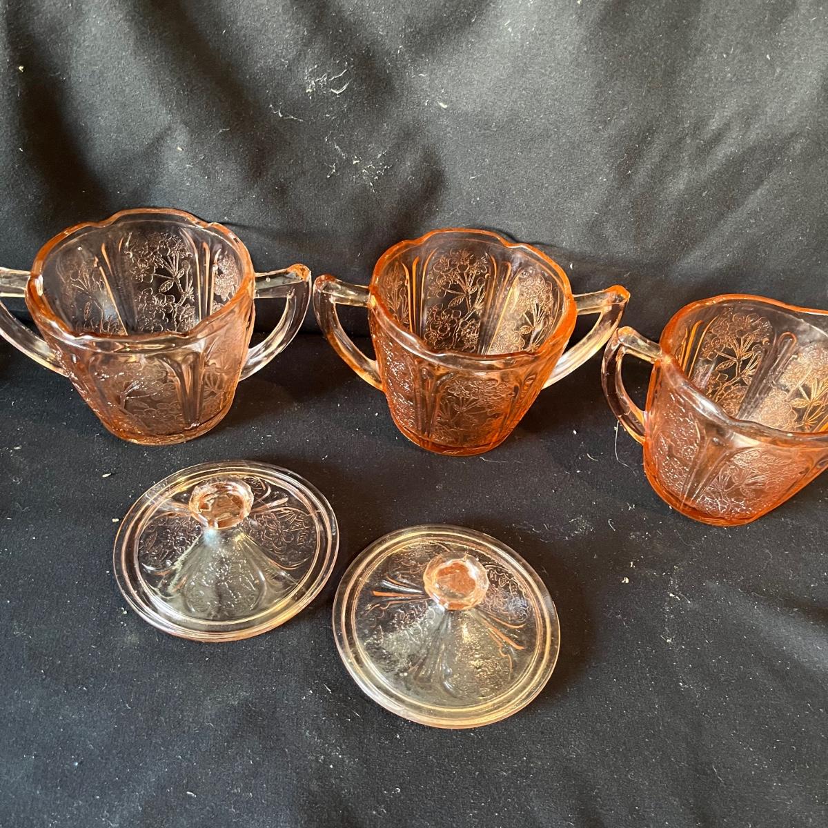Lot contains a large amount of colored glass including 8 teacups, 8 dinner plates, five dessert dishes, six coasters, 12 saucers, large bowl, four serving plates sugar bowl, creamer, six glasses and more assorted pieces. Largest plate measures 11.5” D. Also includes four reference books related to Depression Era glassware.
