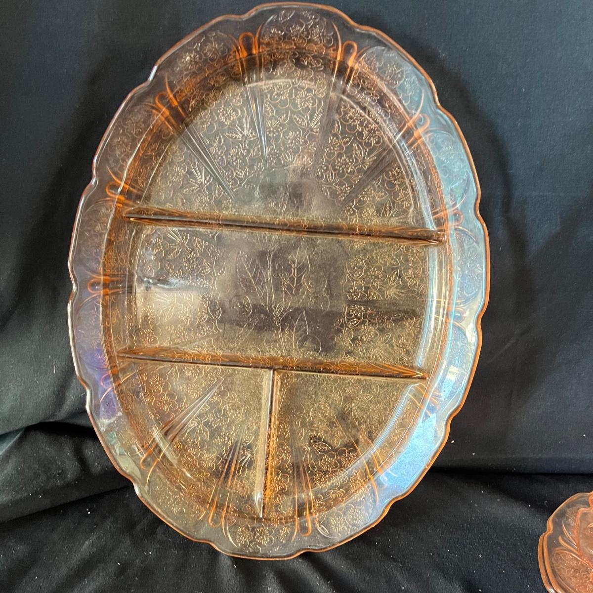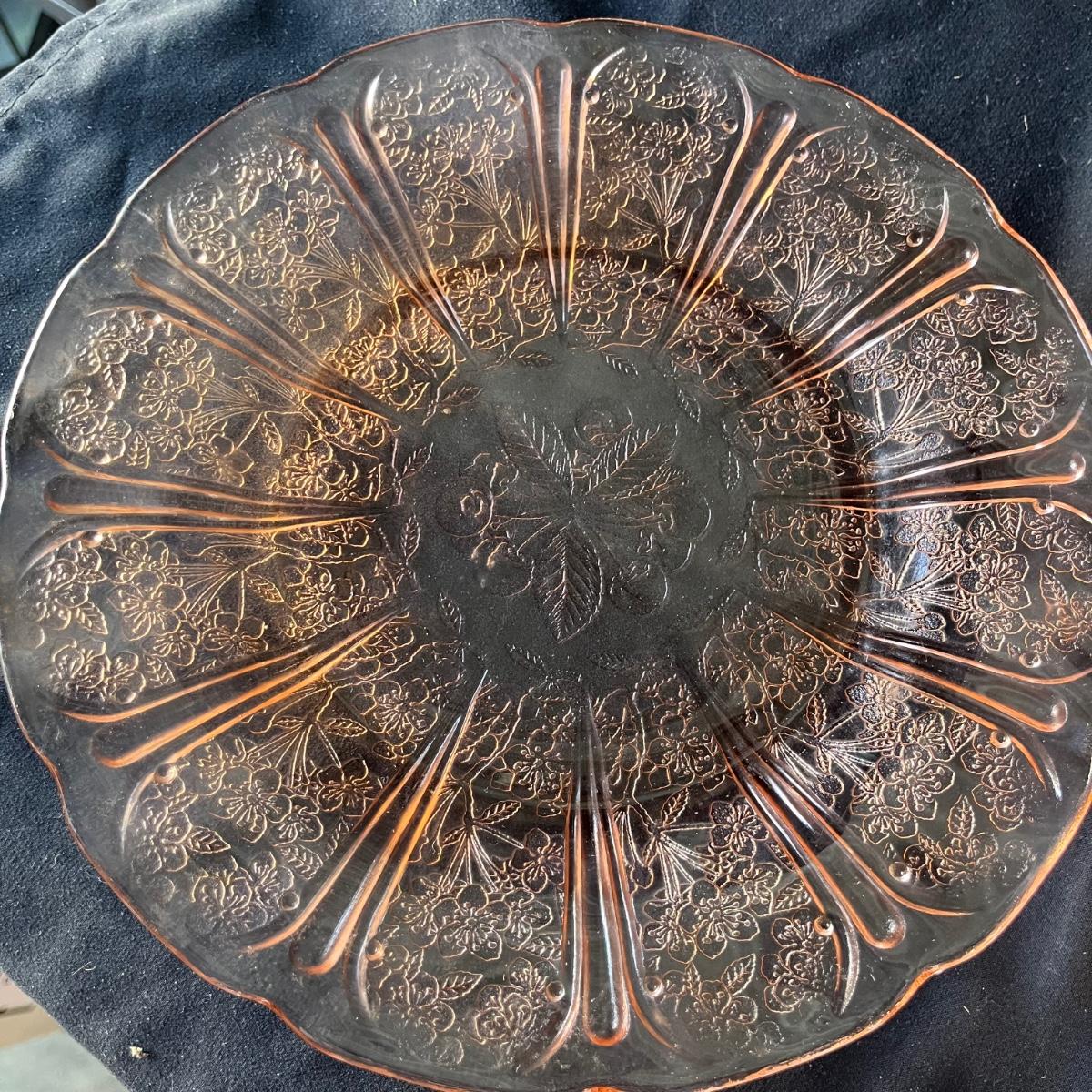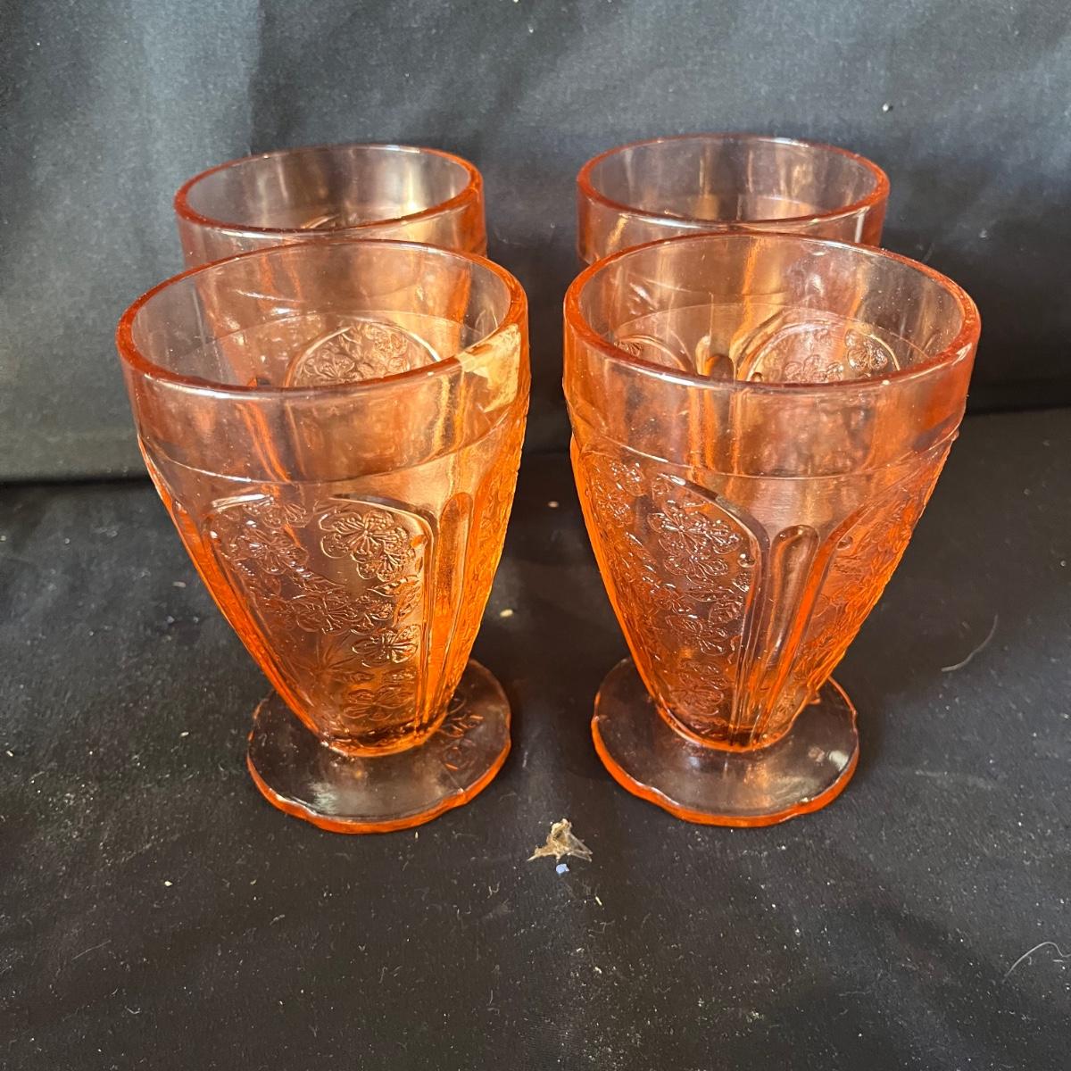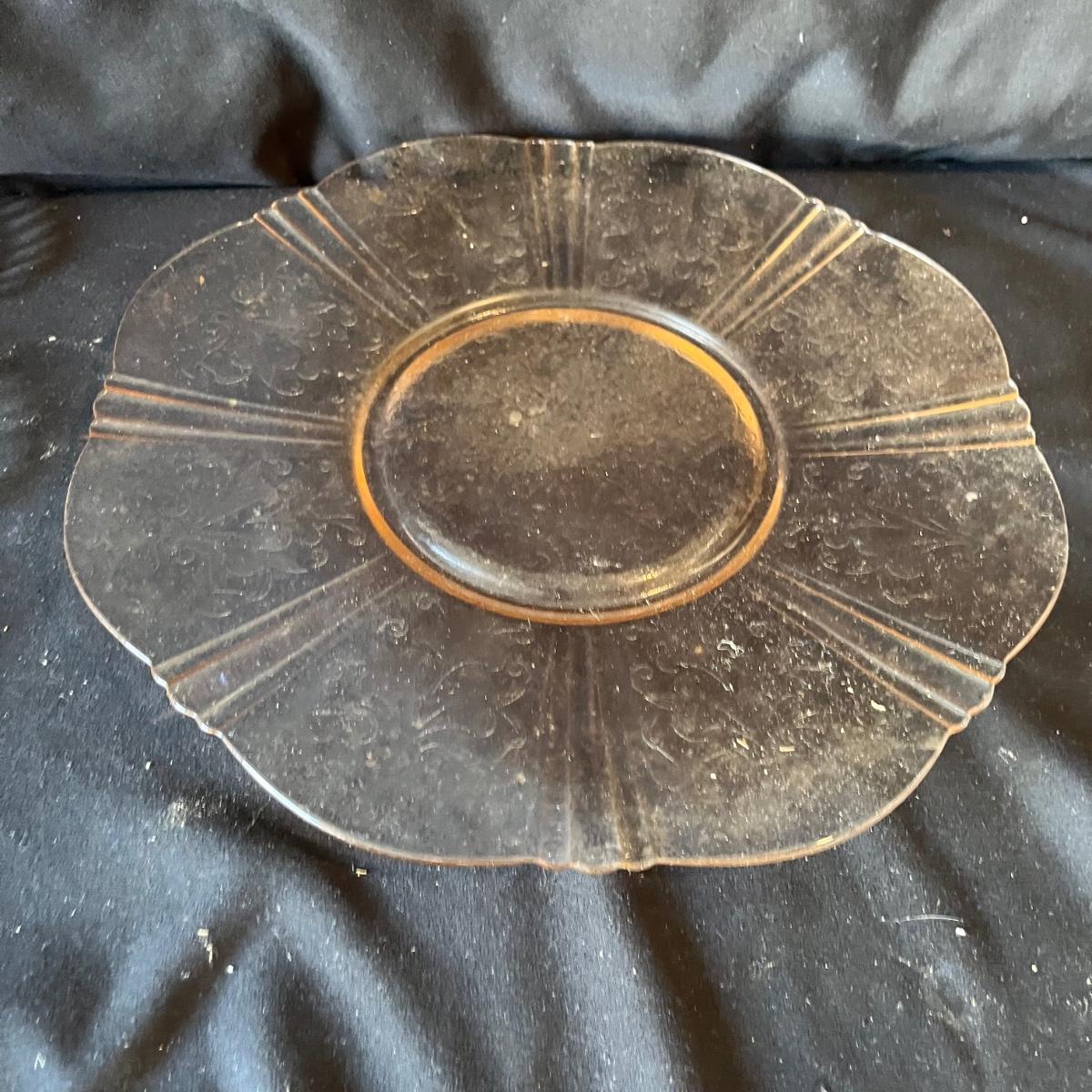Lot contains a large amount of colored glass including 8 teacups, 8 dinner plates, five dessert dishes, six coasters, 12 saucers, large bowl, four serving plates sugar bowl, creamer, six glasses and more assorted pieces. Largest plate measures 11.5” D. Also includes four reference books related to Depression Era glassware.