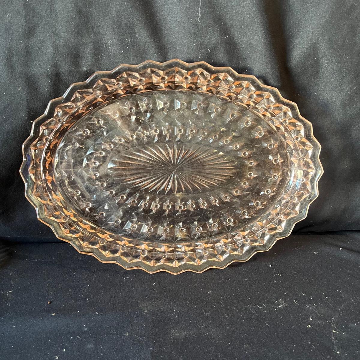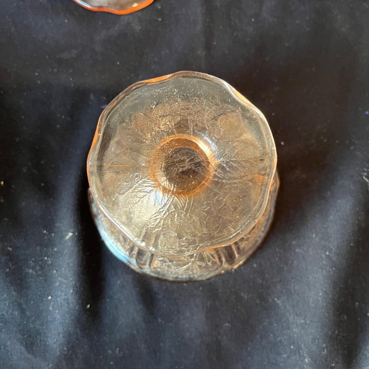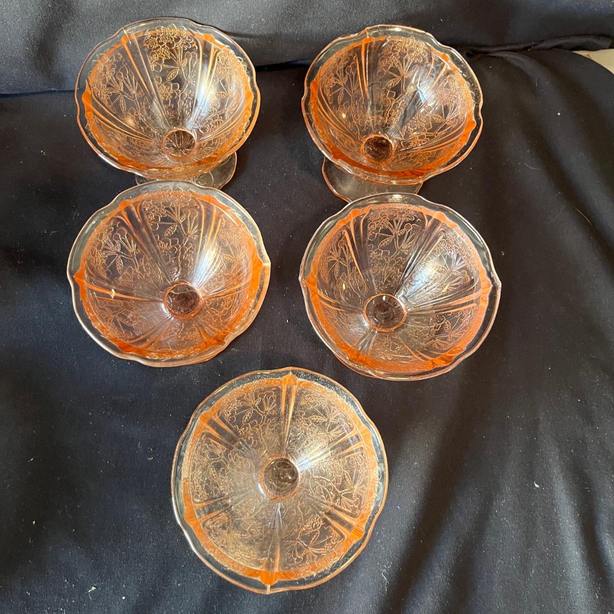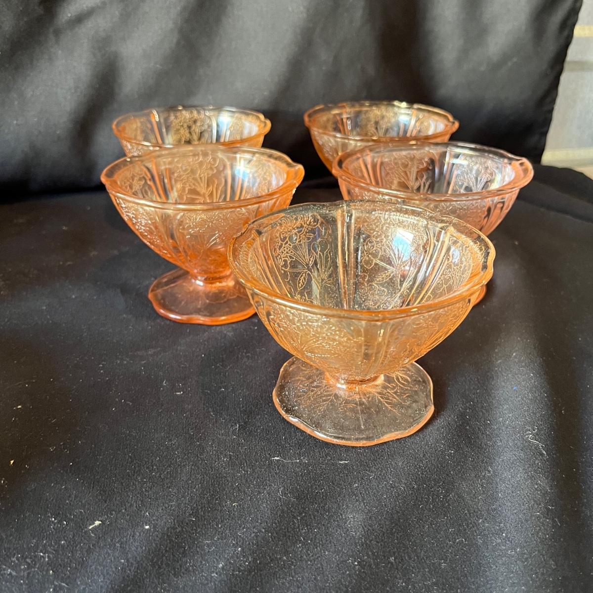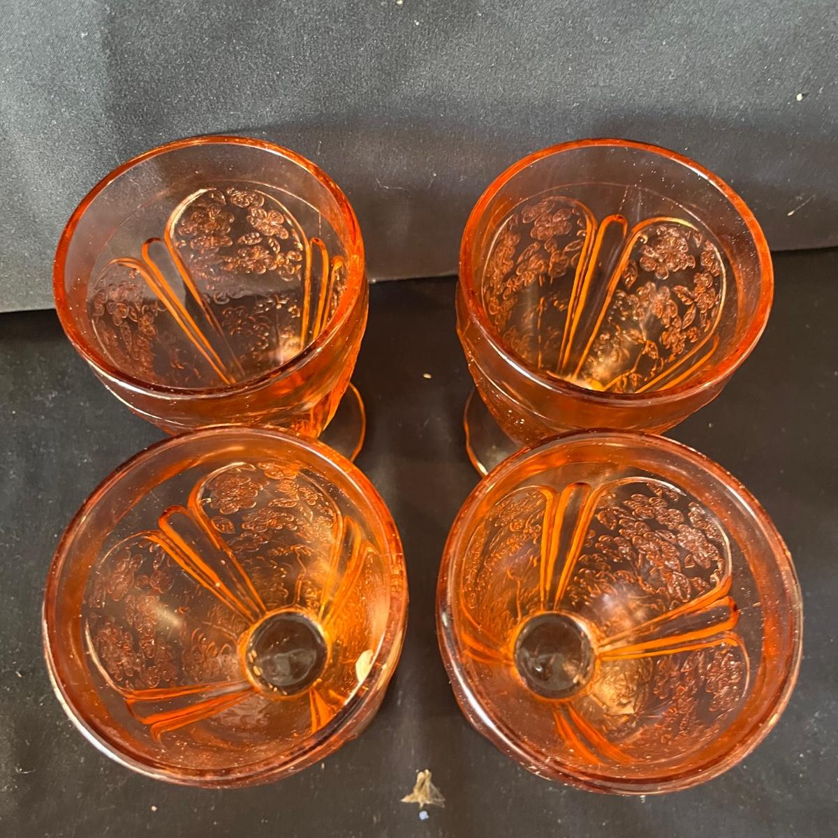Lot contains a large amount of colored glass including 8 teacups, 8 dinner plates, five dessert dishes, six coasters, 12 saucers, large bowl, four serving plates sugar bowl, creamer, six glasses and more assorted pieces. Largest plate measures 11.5” D. Also includes four reference books related to Depression Era glassware.