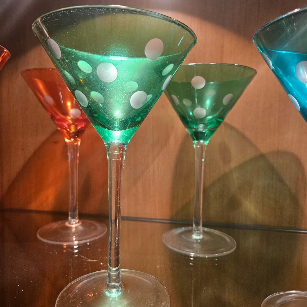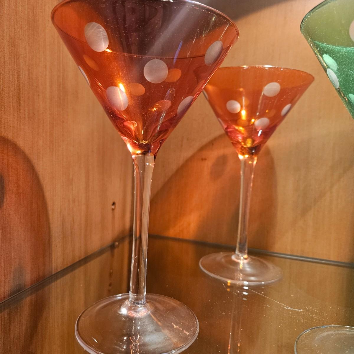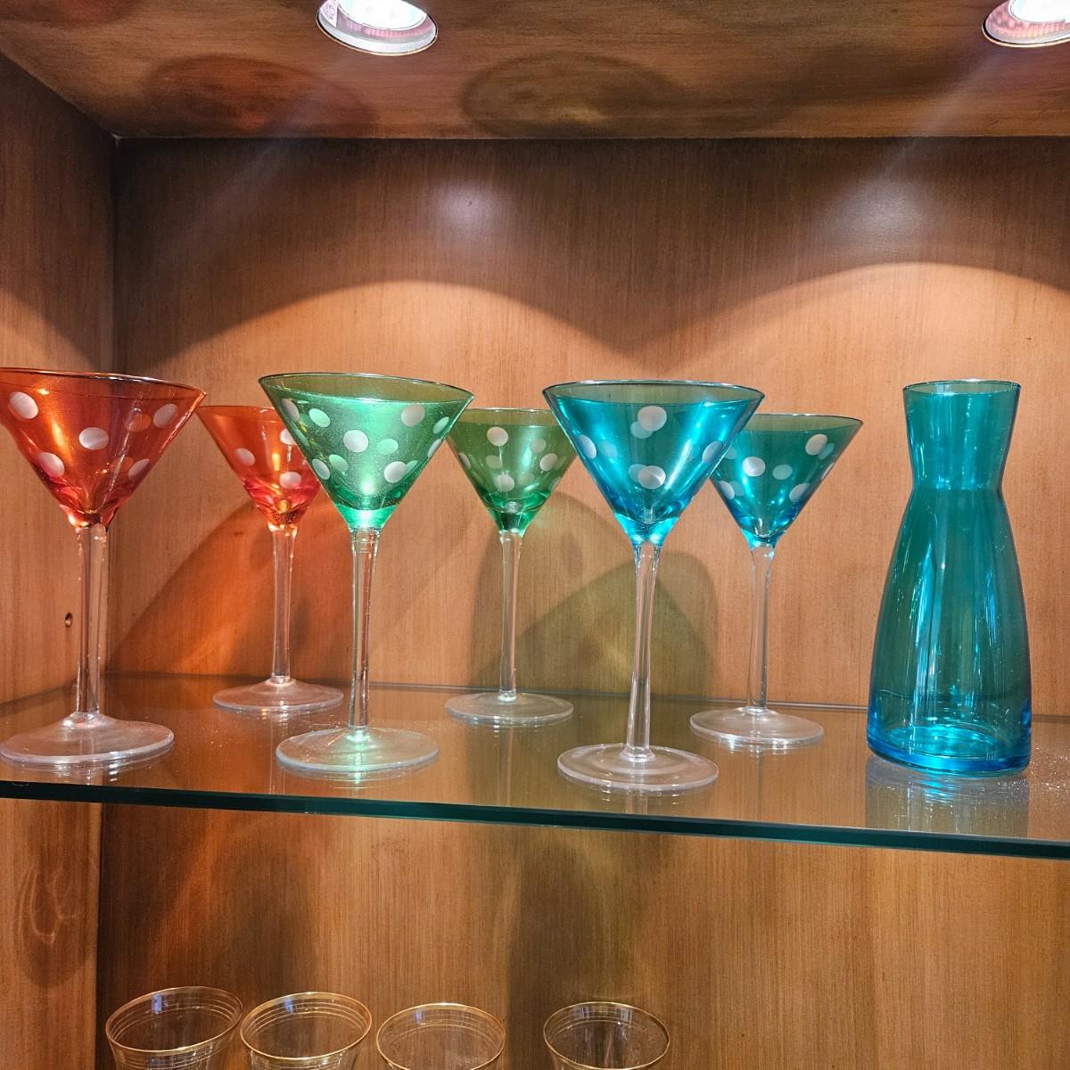 A set of six martini glasses that includes a colored carafe. Each glass measures approximately 4.5"D x 7.5"H. Shipping available.