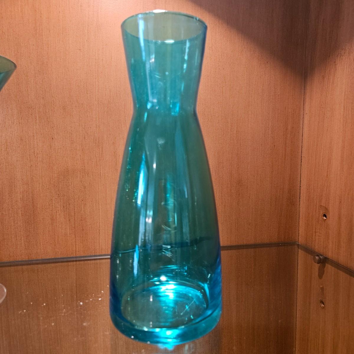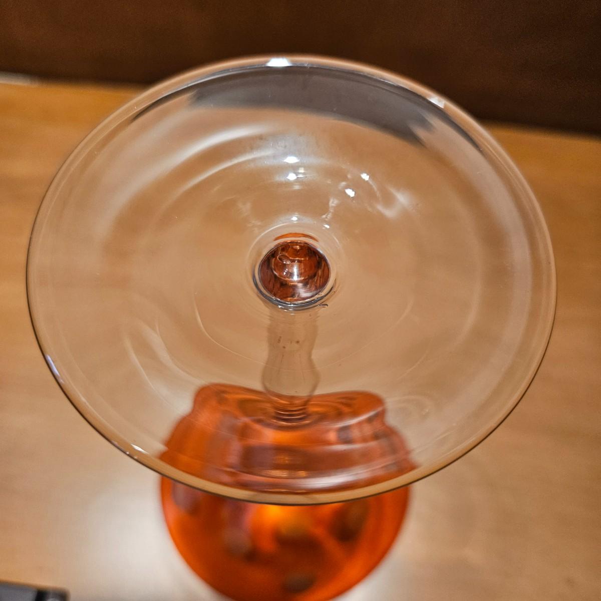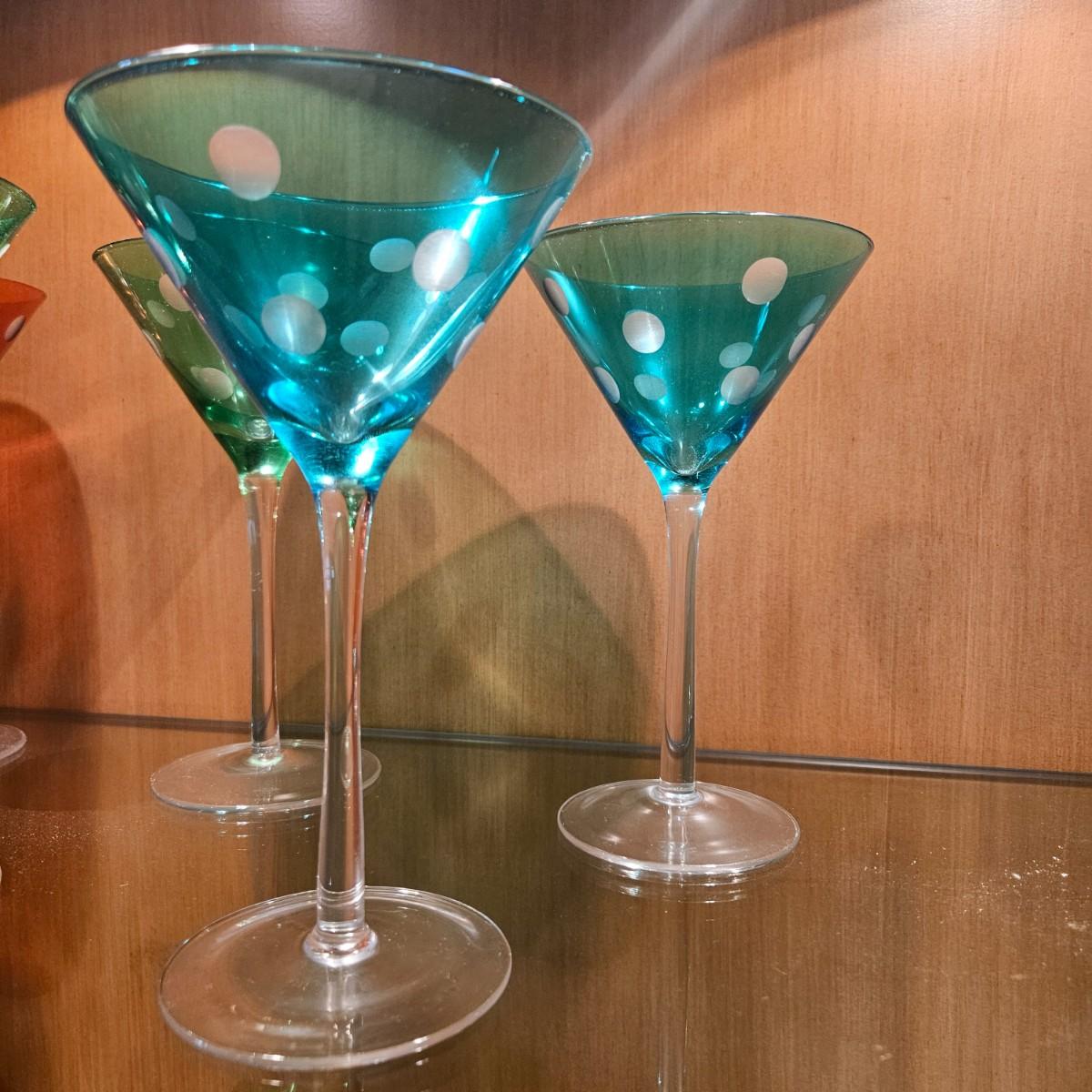 A set of six martini glasses that includes a colored carafe. Each glass measures approximately 4.5"D x 7.5"H. Shipping available.
