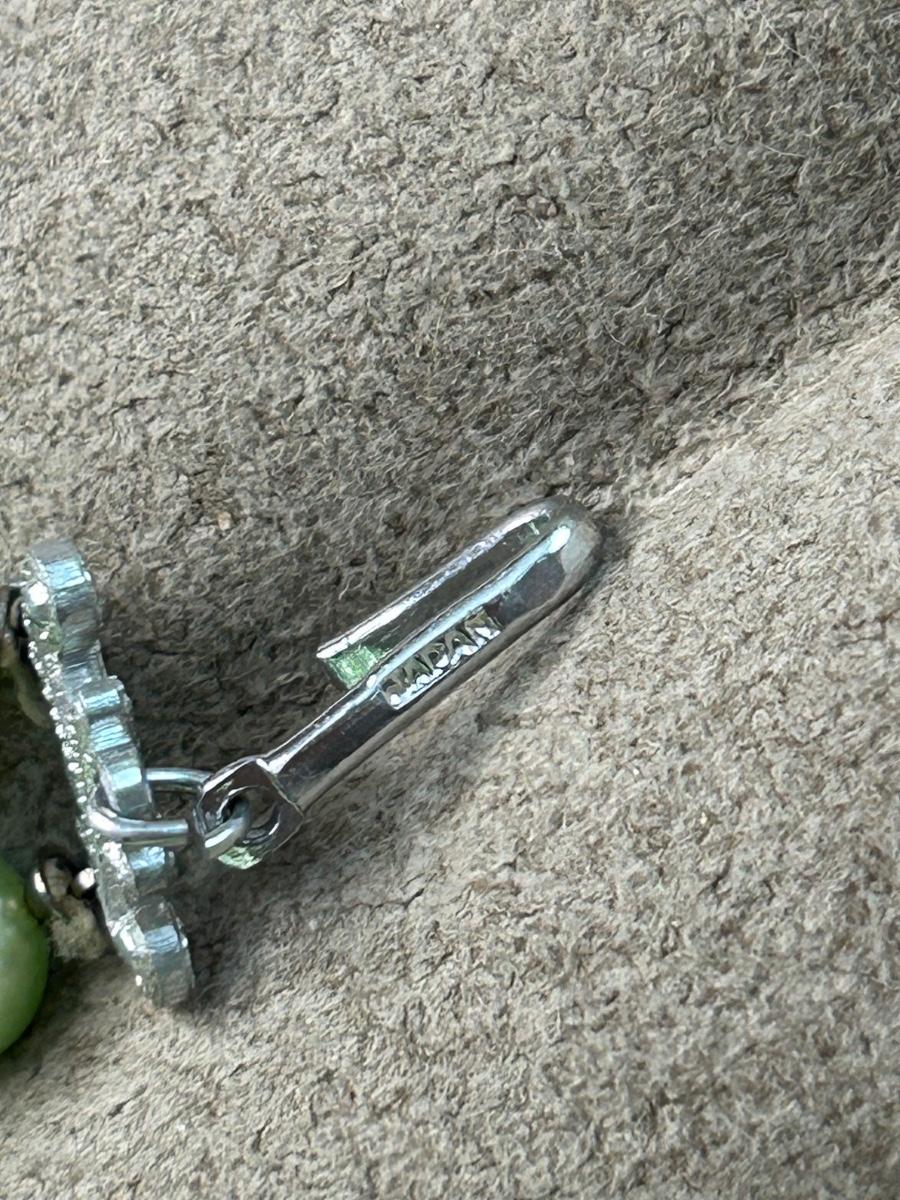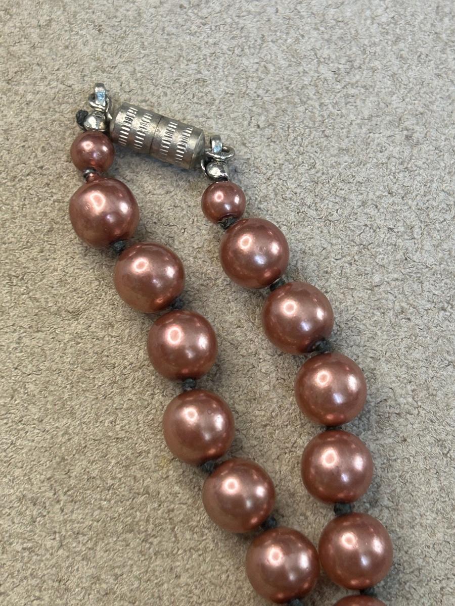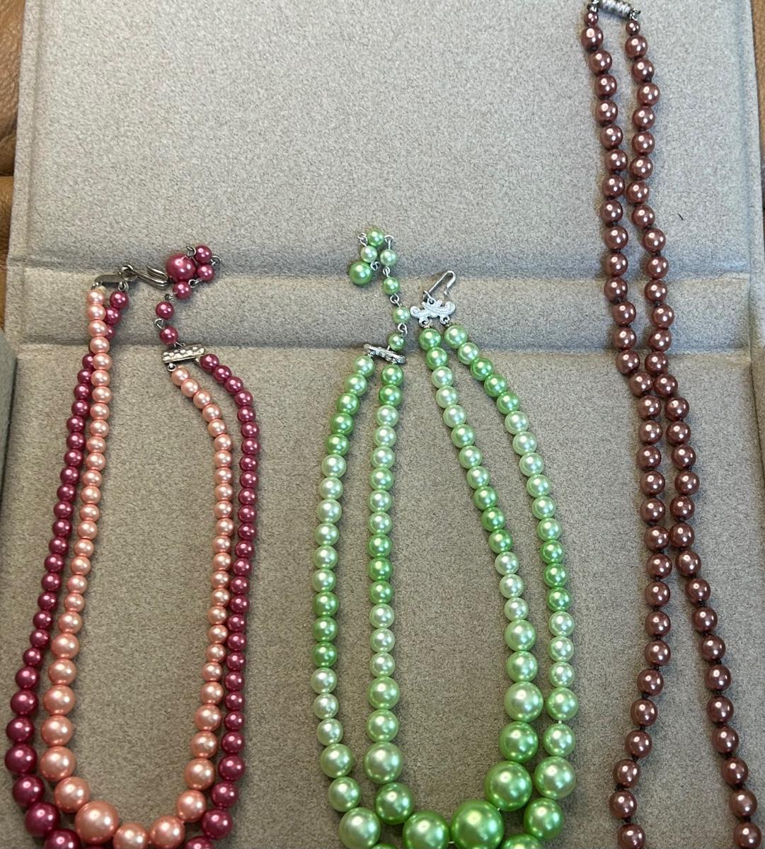 Faux pearls: the green set is stamped Japan and the long strand has knots in between each pearl.