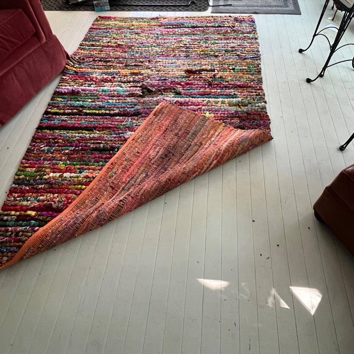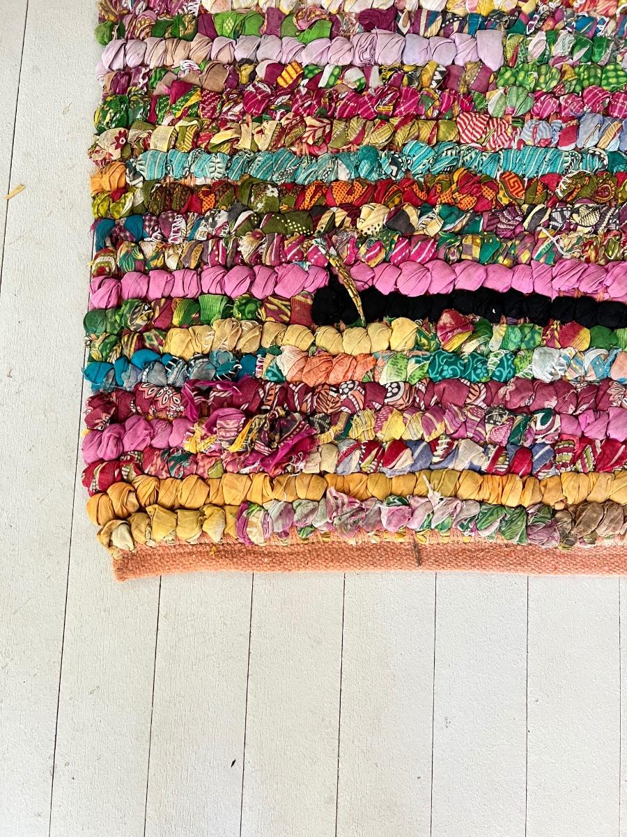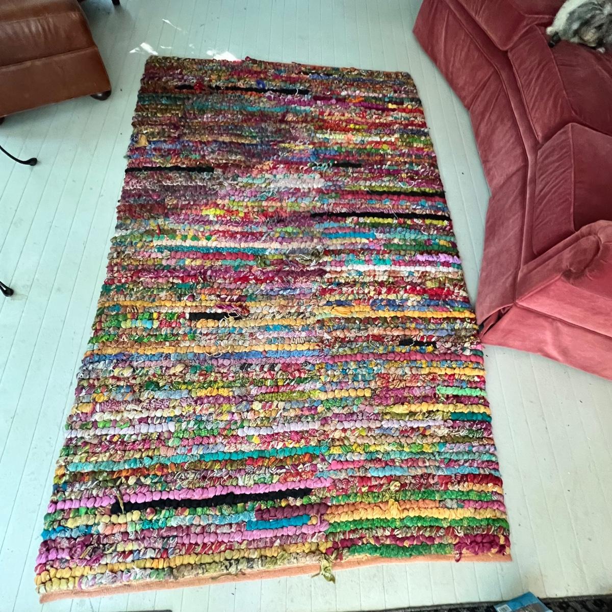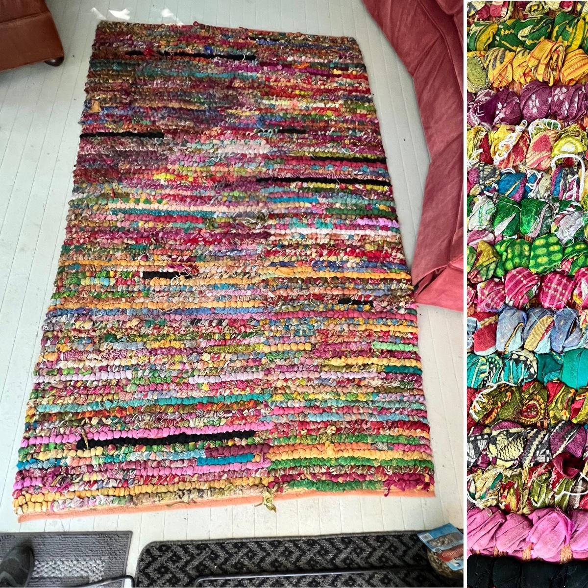 This colorful and cheerful rag rug will brighten up any space! It has some blemishes which includes numerous areas where the rags have come loose and there is a dark stain on the one corner, see photos.